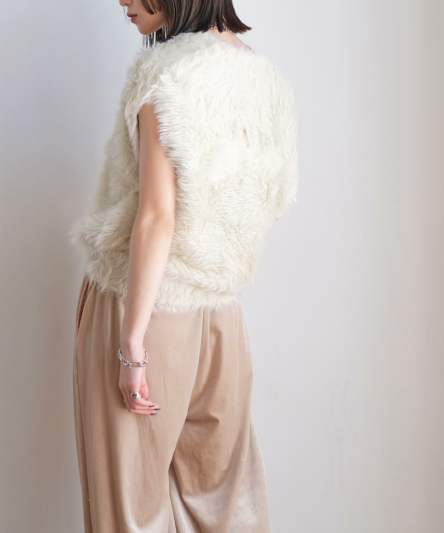 毛足の長いシャギーヤーンを使用した、シーズンムード高まるニットベスト。