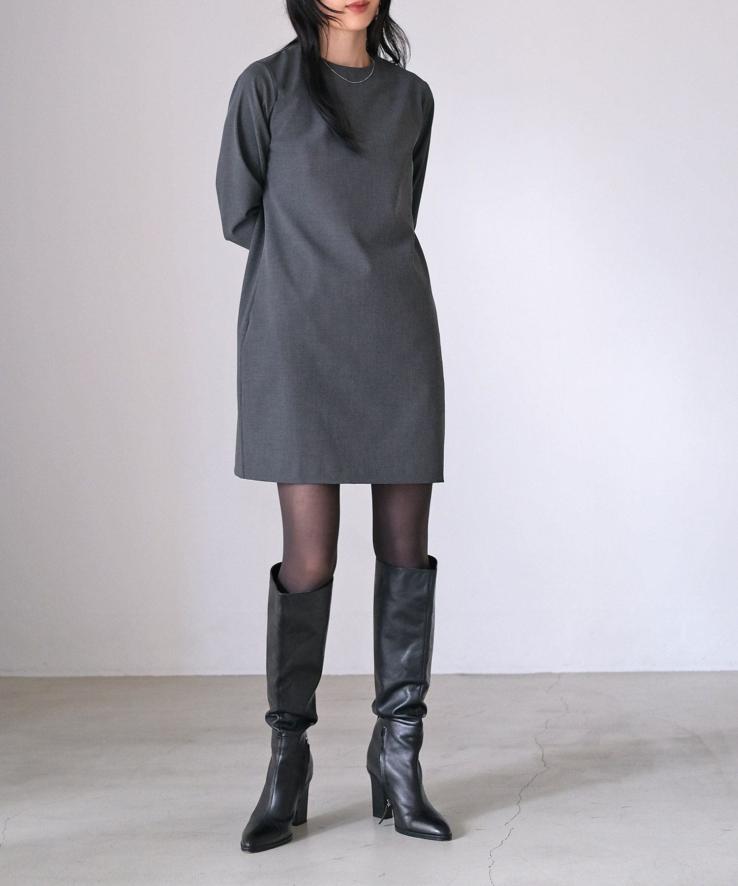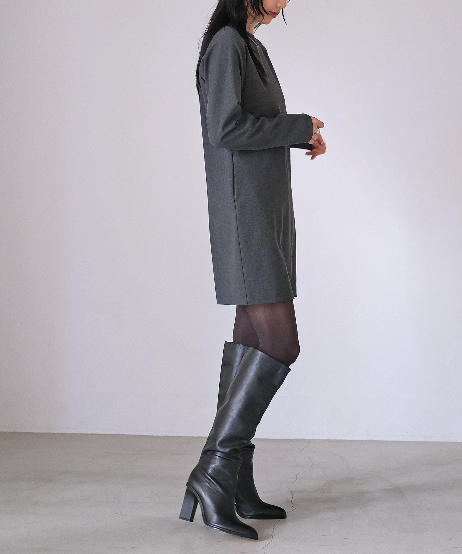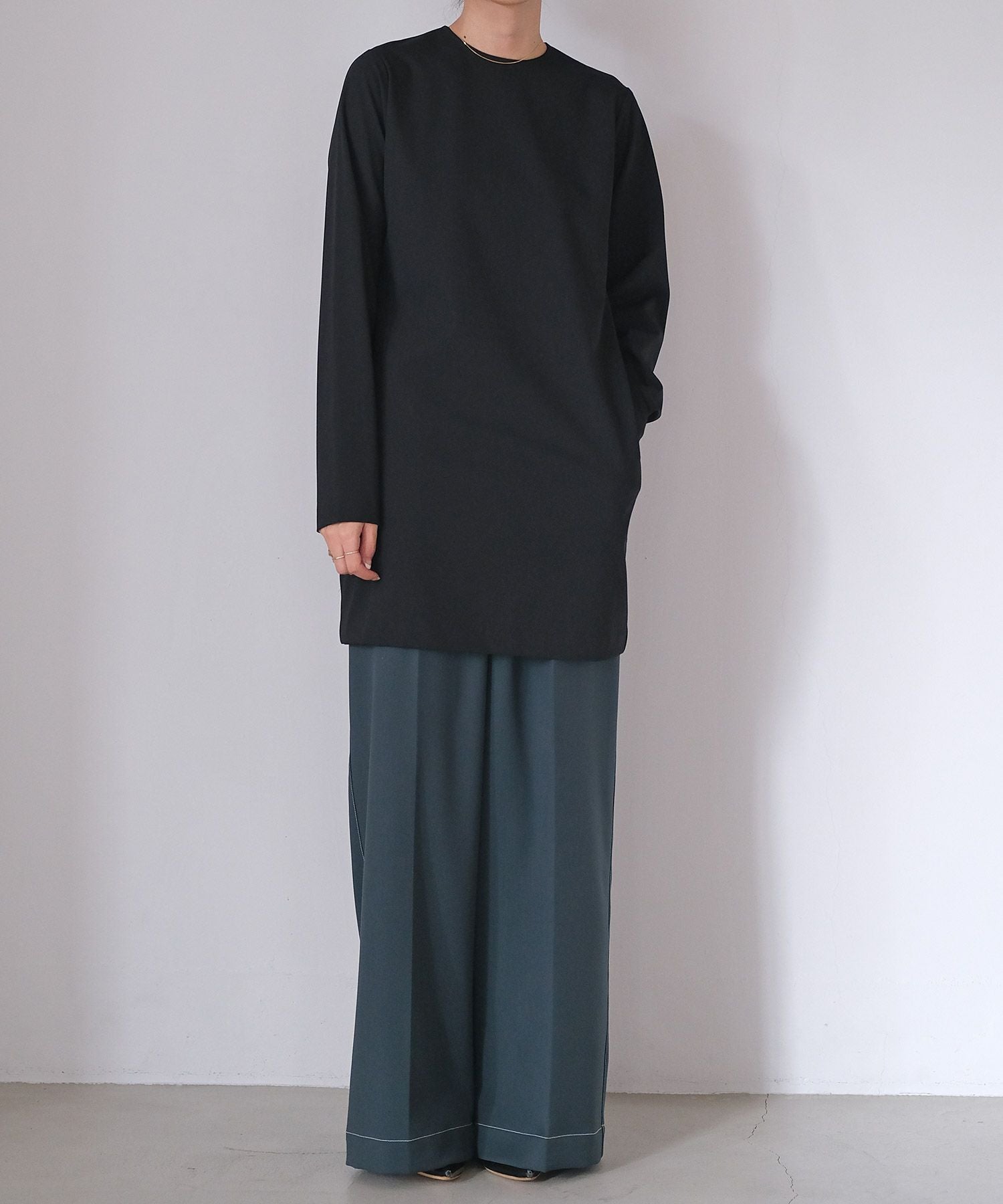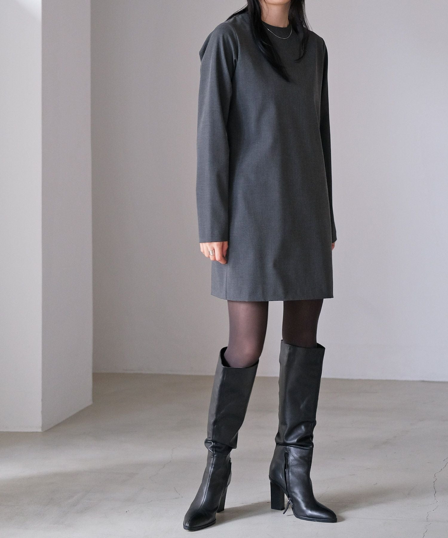 やや詰まり気味のネックラインはクラシカルかつクリーンさをプラス。