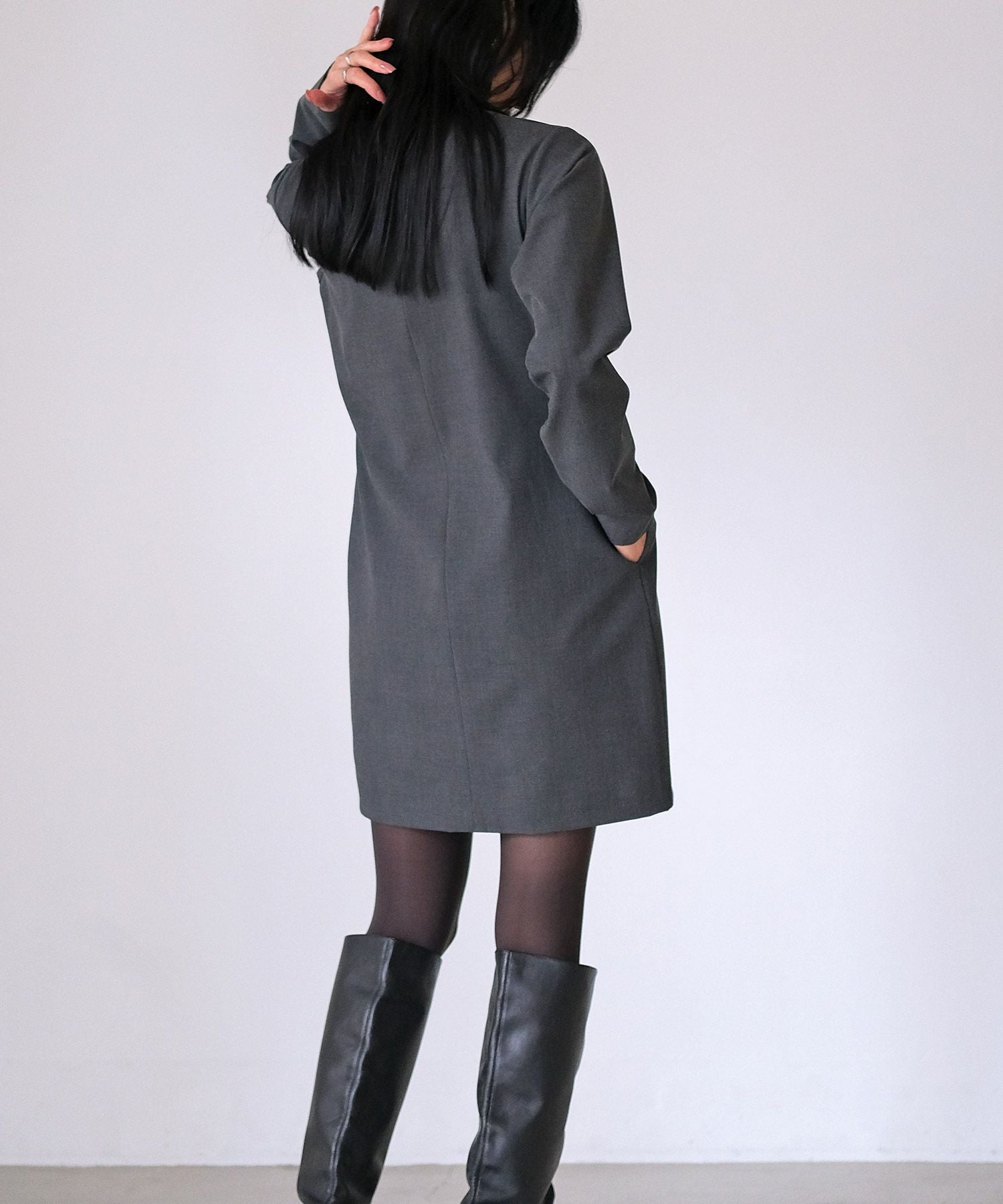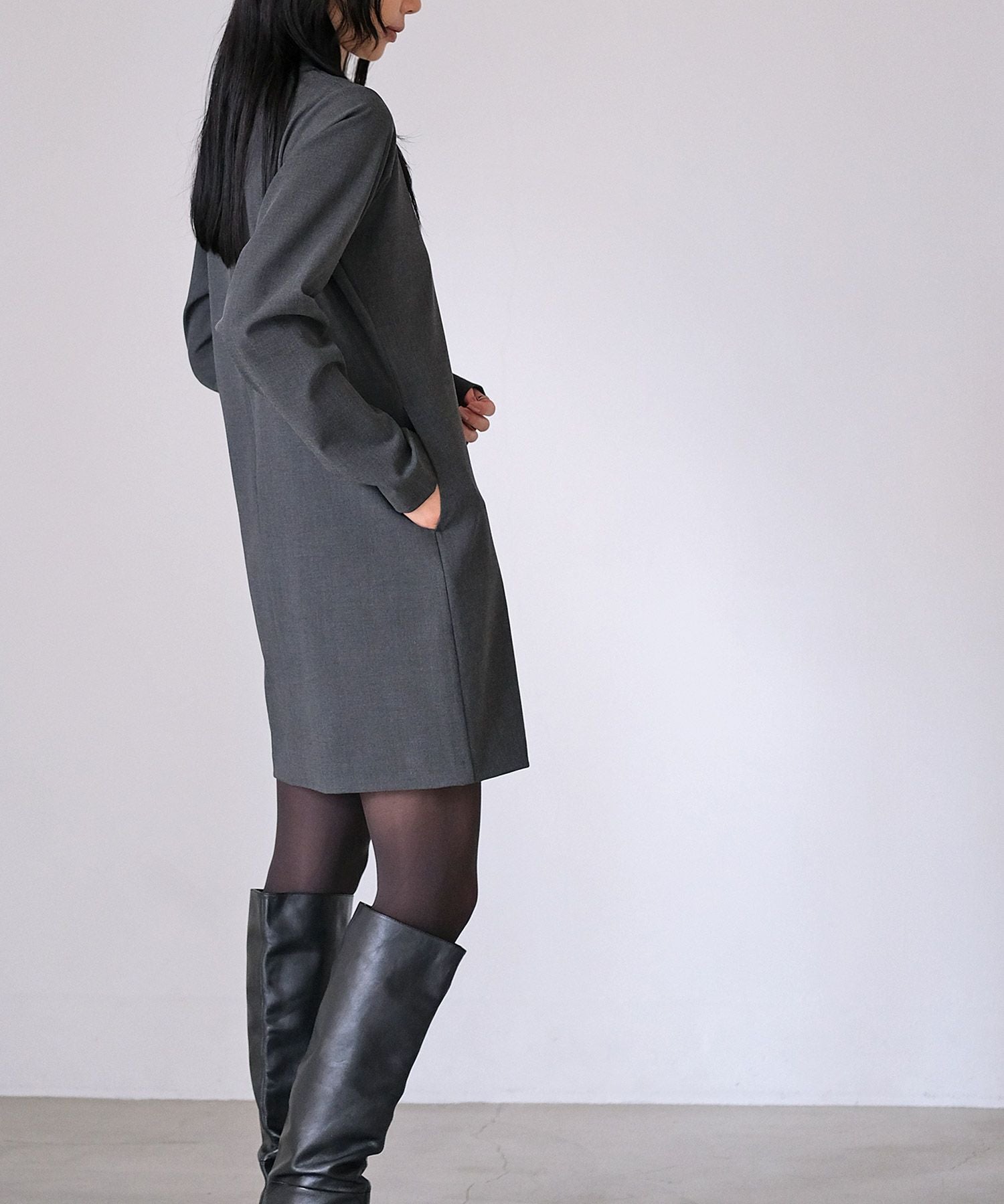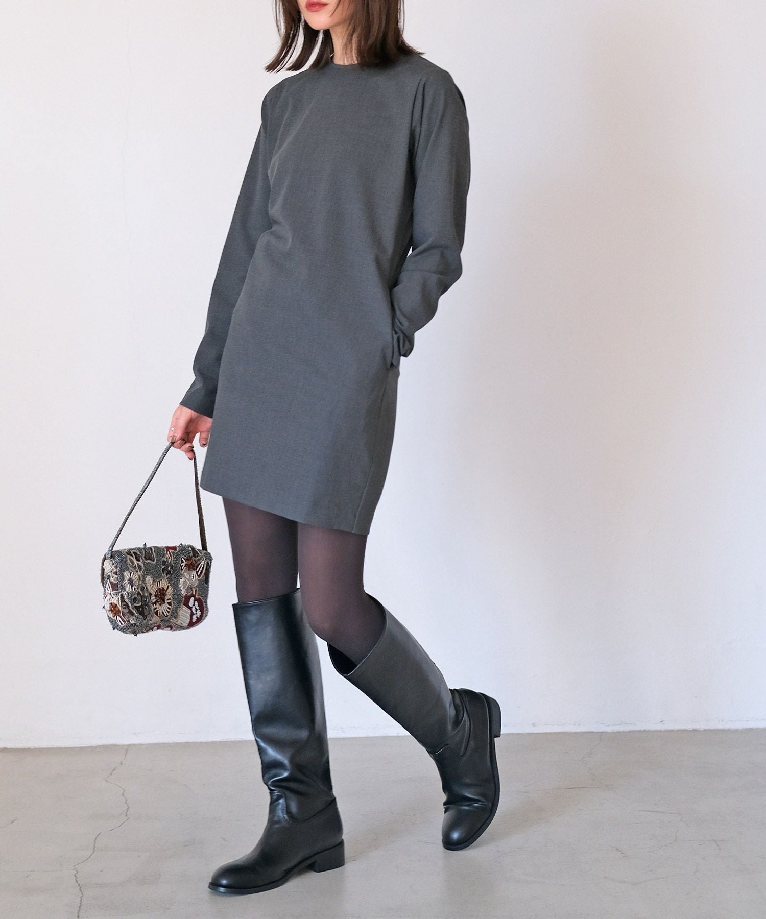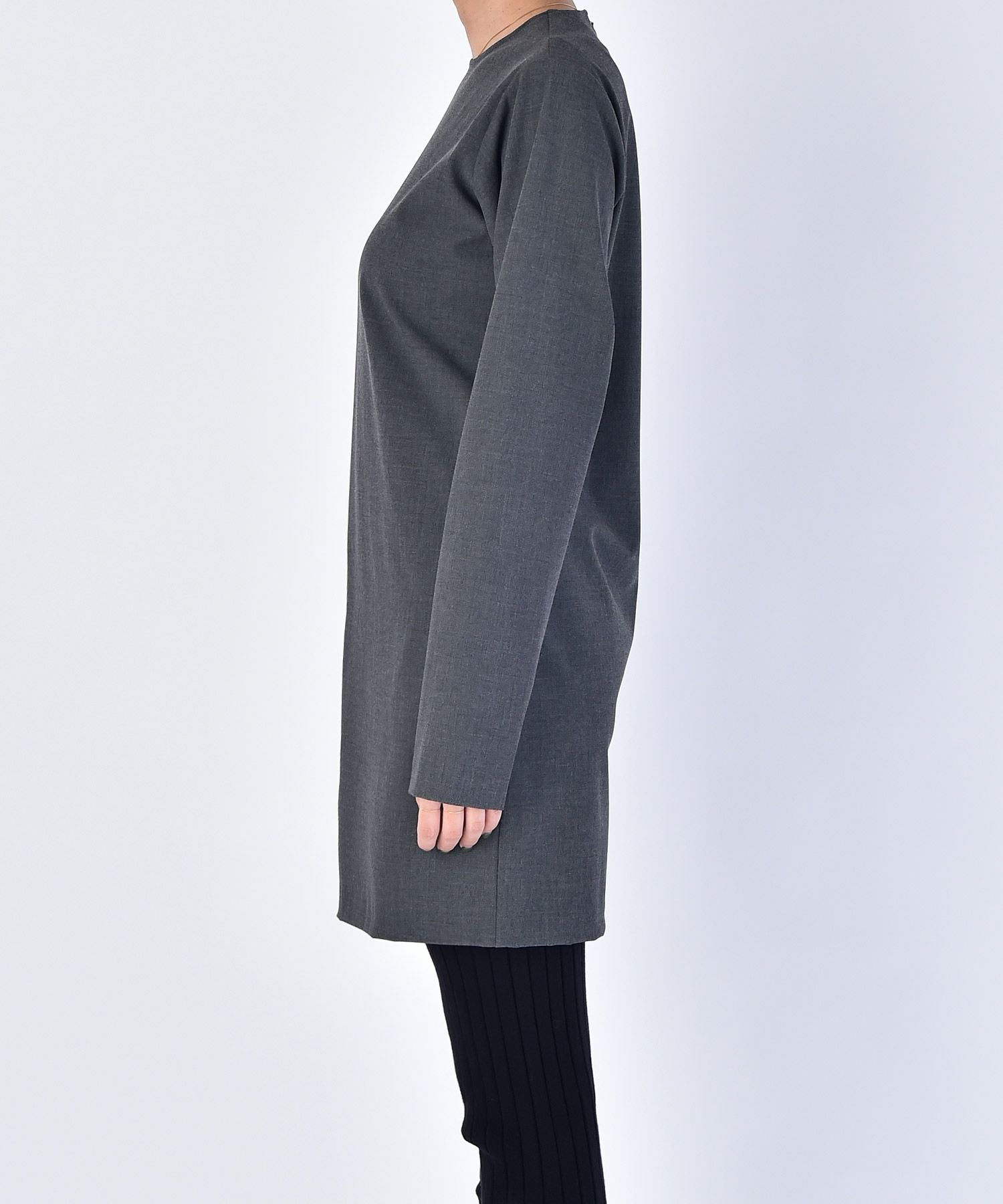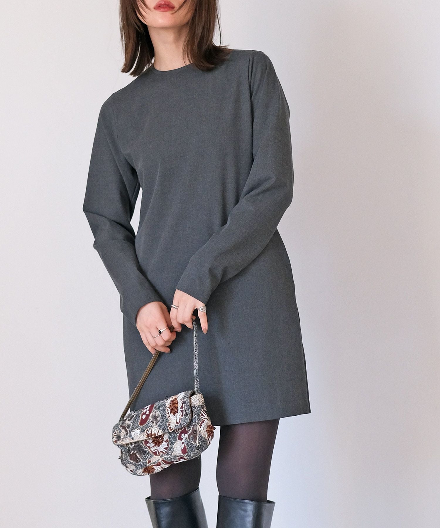 やや詰まり気味のネックラインはクラシカルかつクリーンさをプラス。
