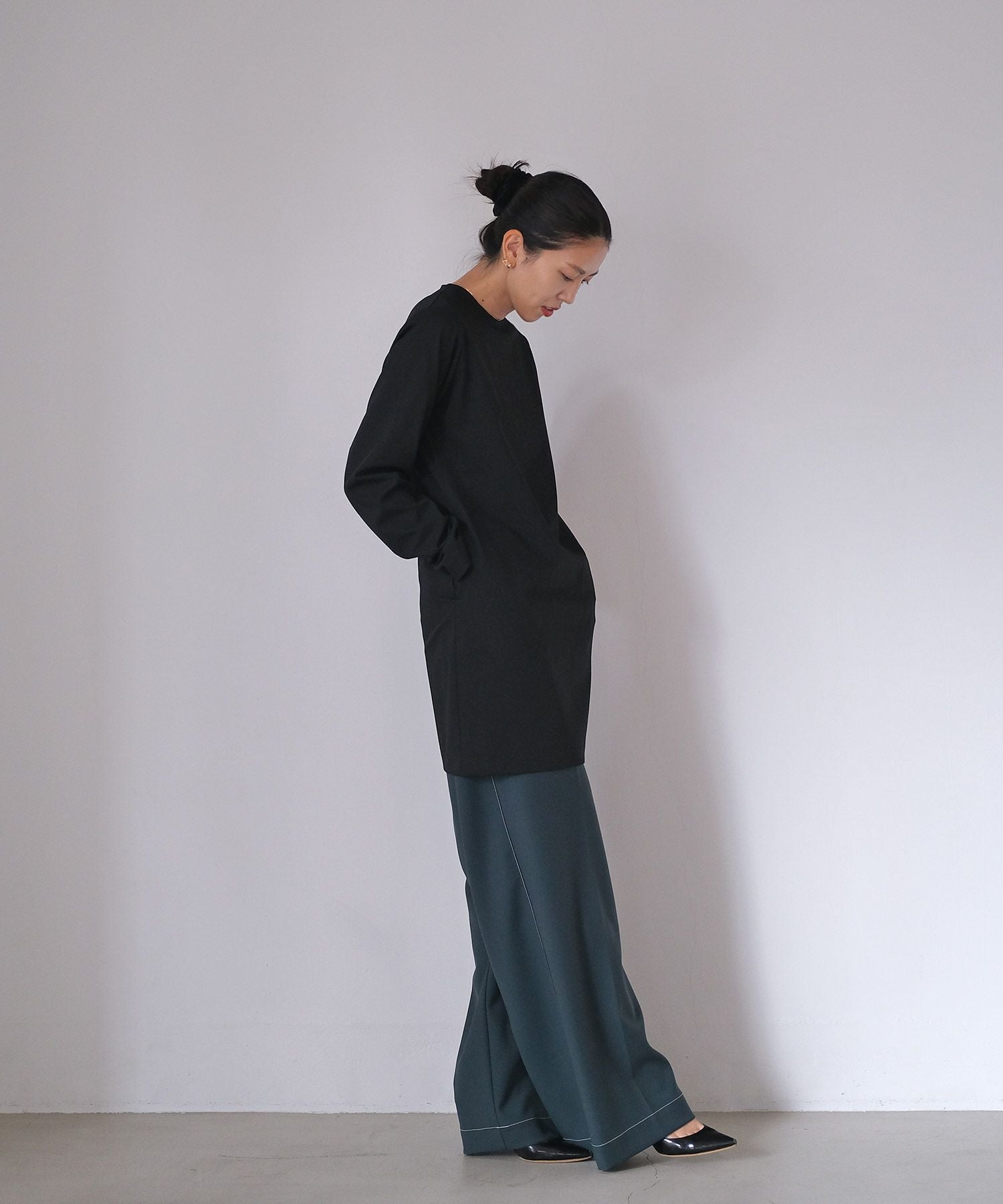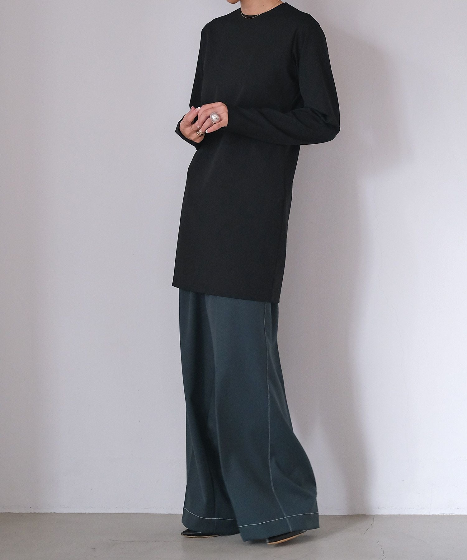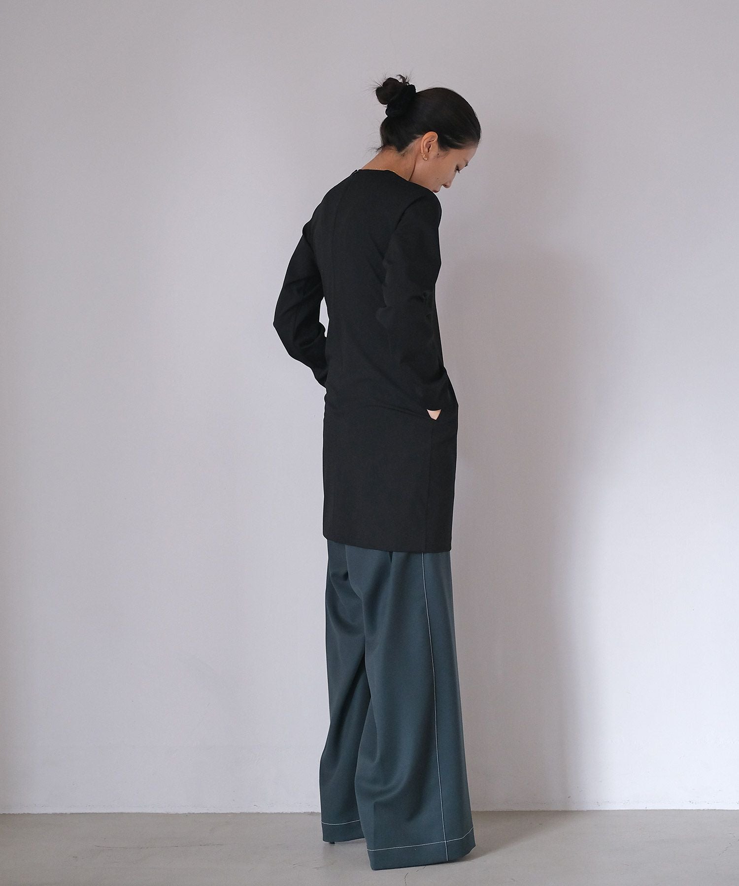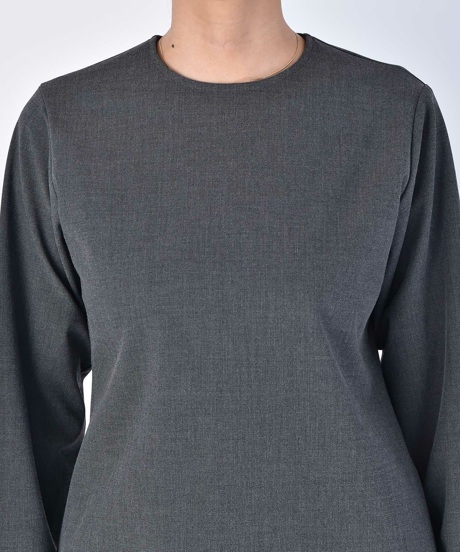 やや詰まり気味のネックラインはクラシカルかつクリーンさをプラス。