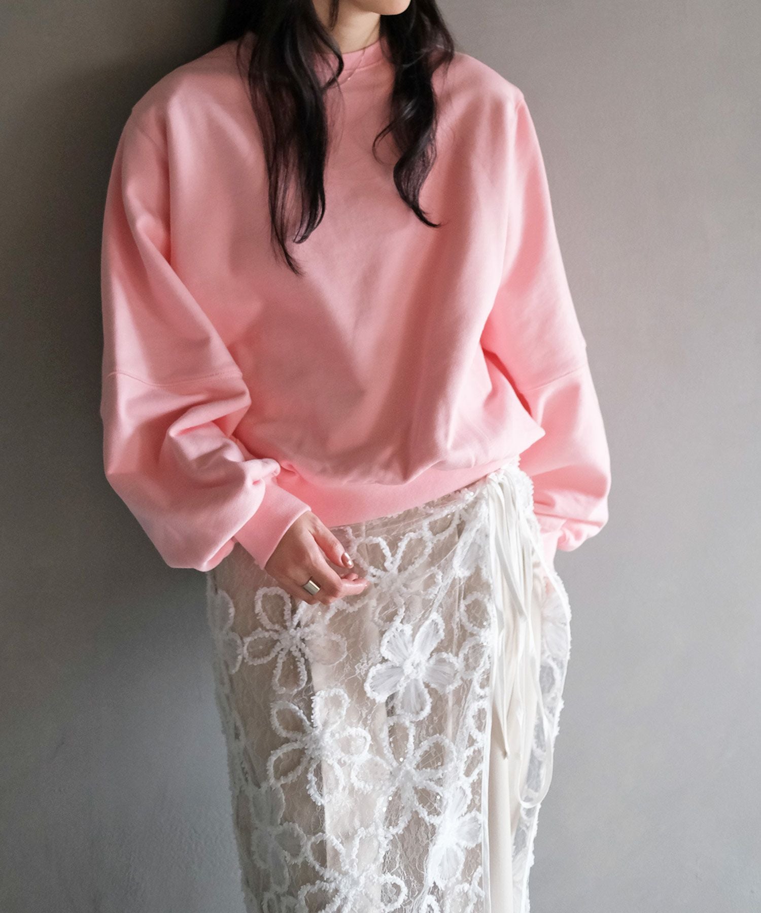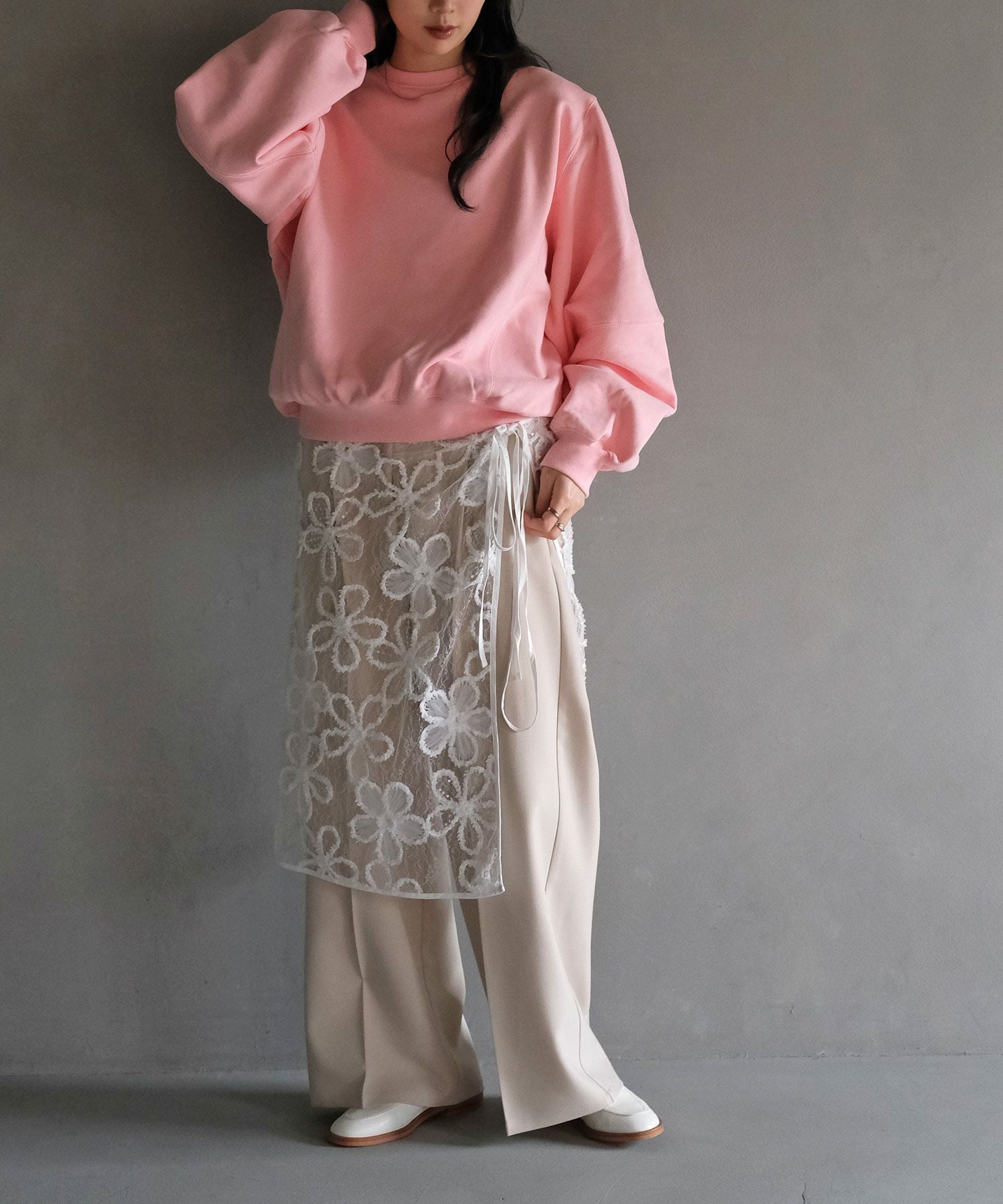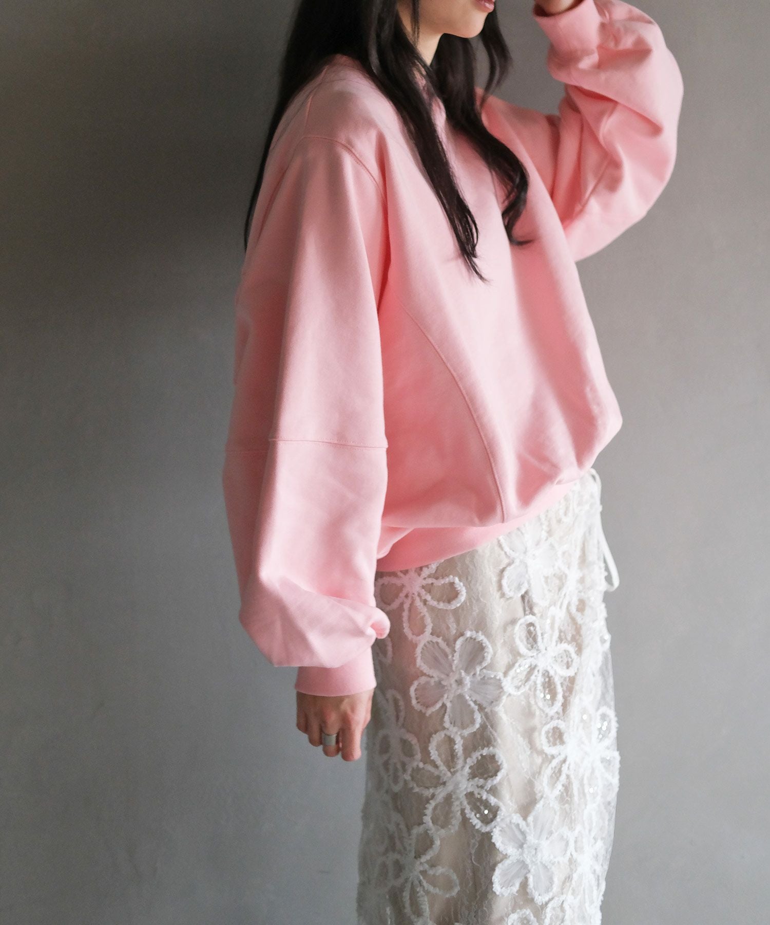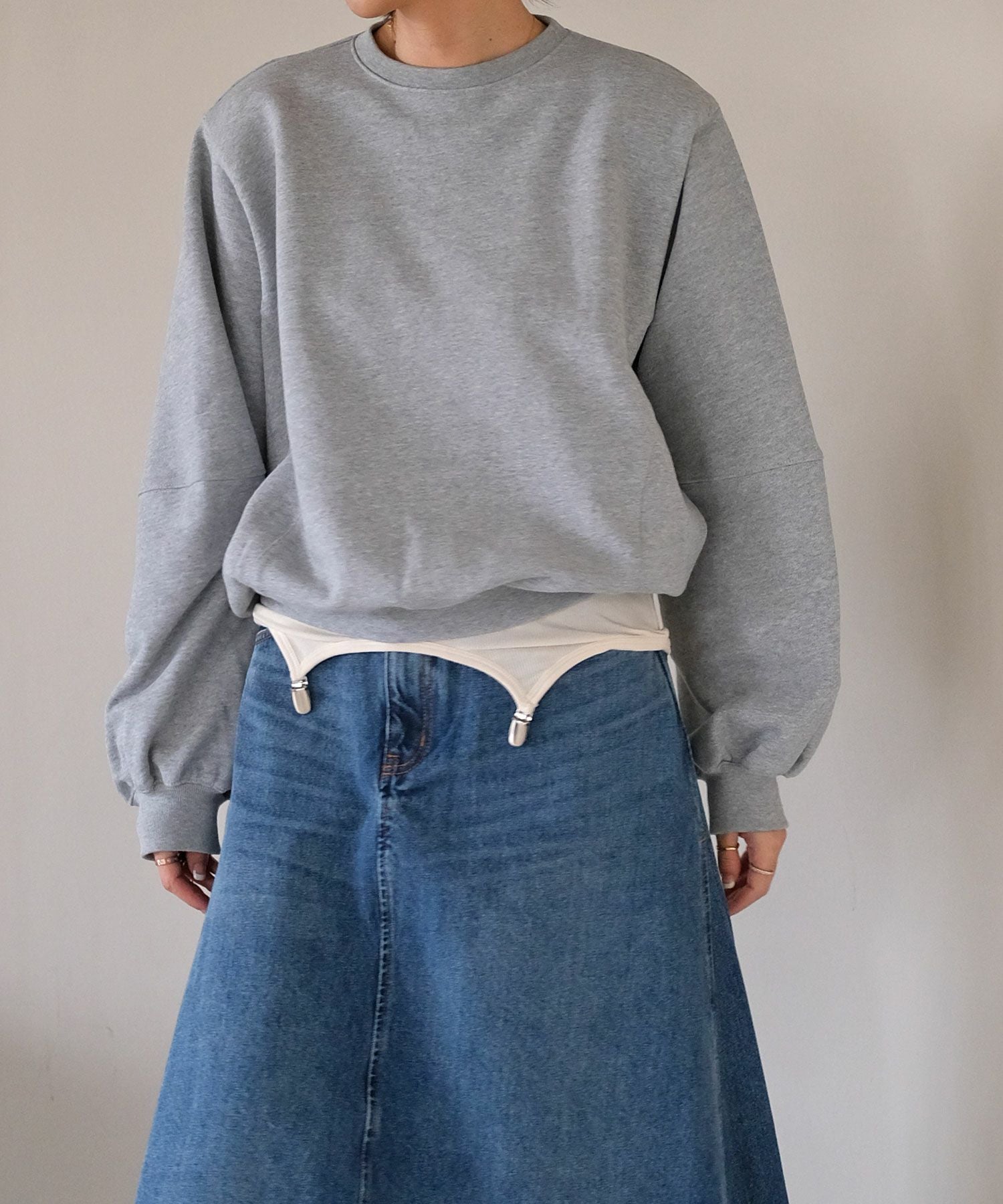 カジュアルなスウェットに取り外し可能な肩パッドを入れることでシルエットに変化が生まれ、ラフになりすぎない見え感に。