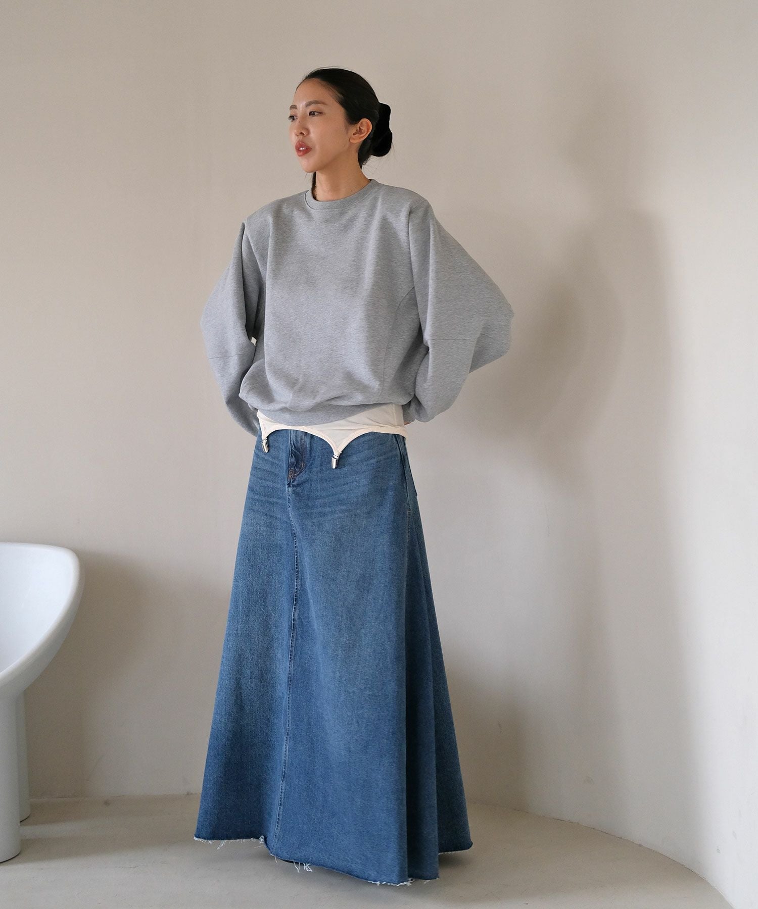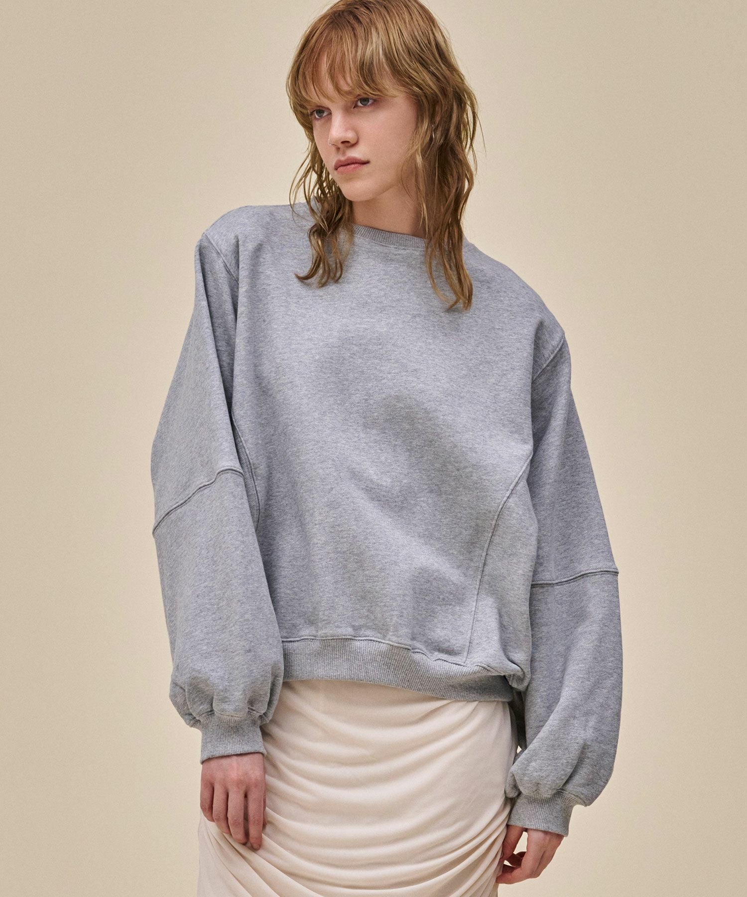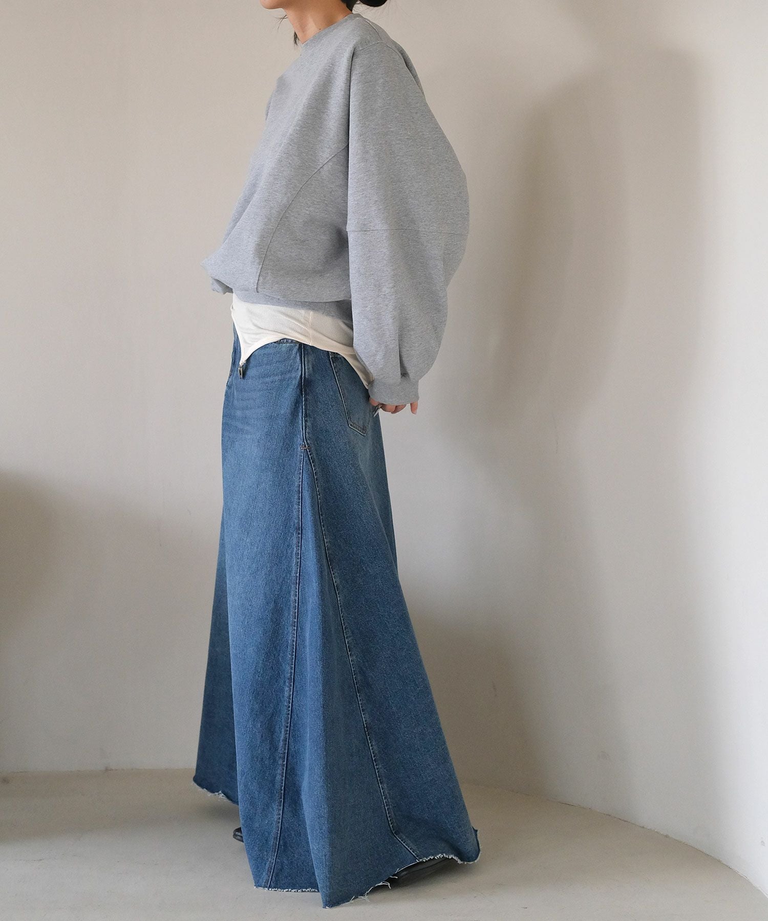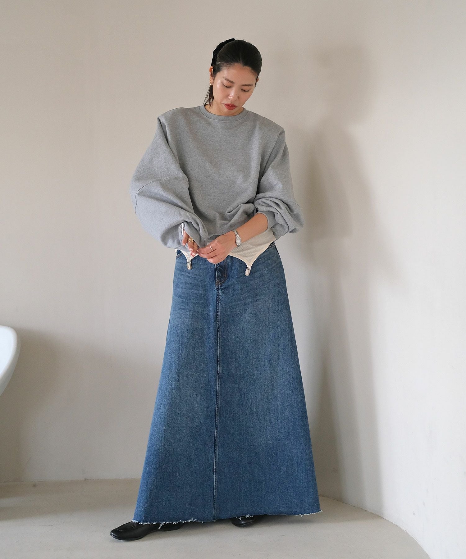 カジュアルなスウェットに取り外し可能な肩パッドを入れることでシルエットに変化が生まれ、ラフになりすぎない見え感に。