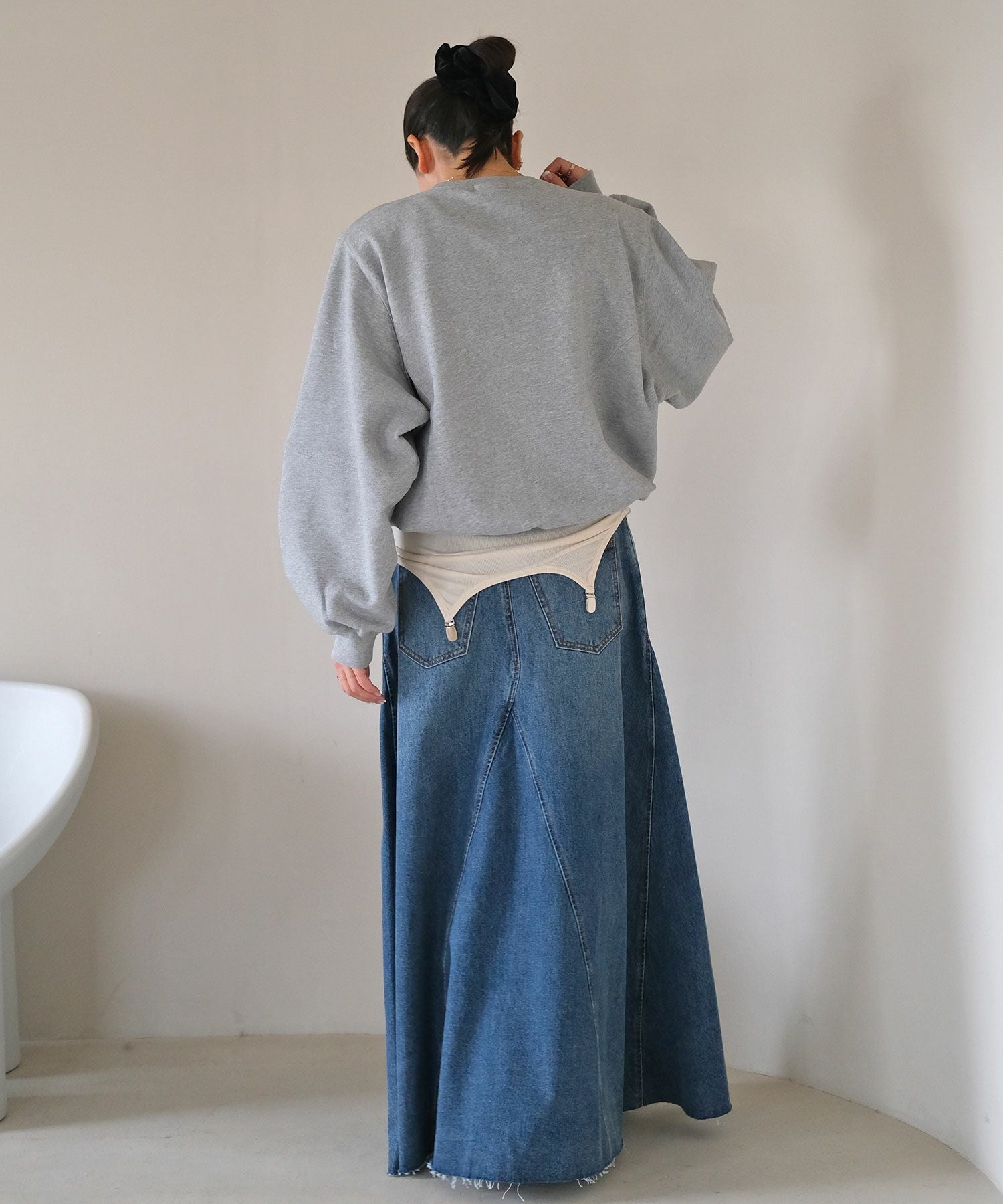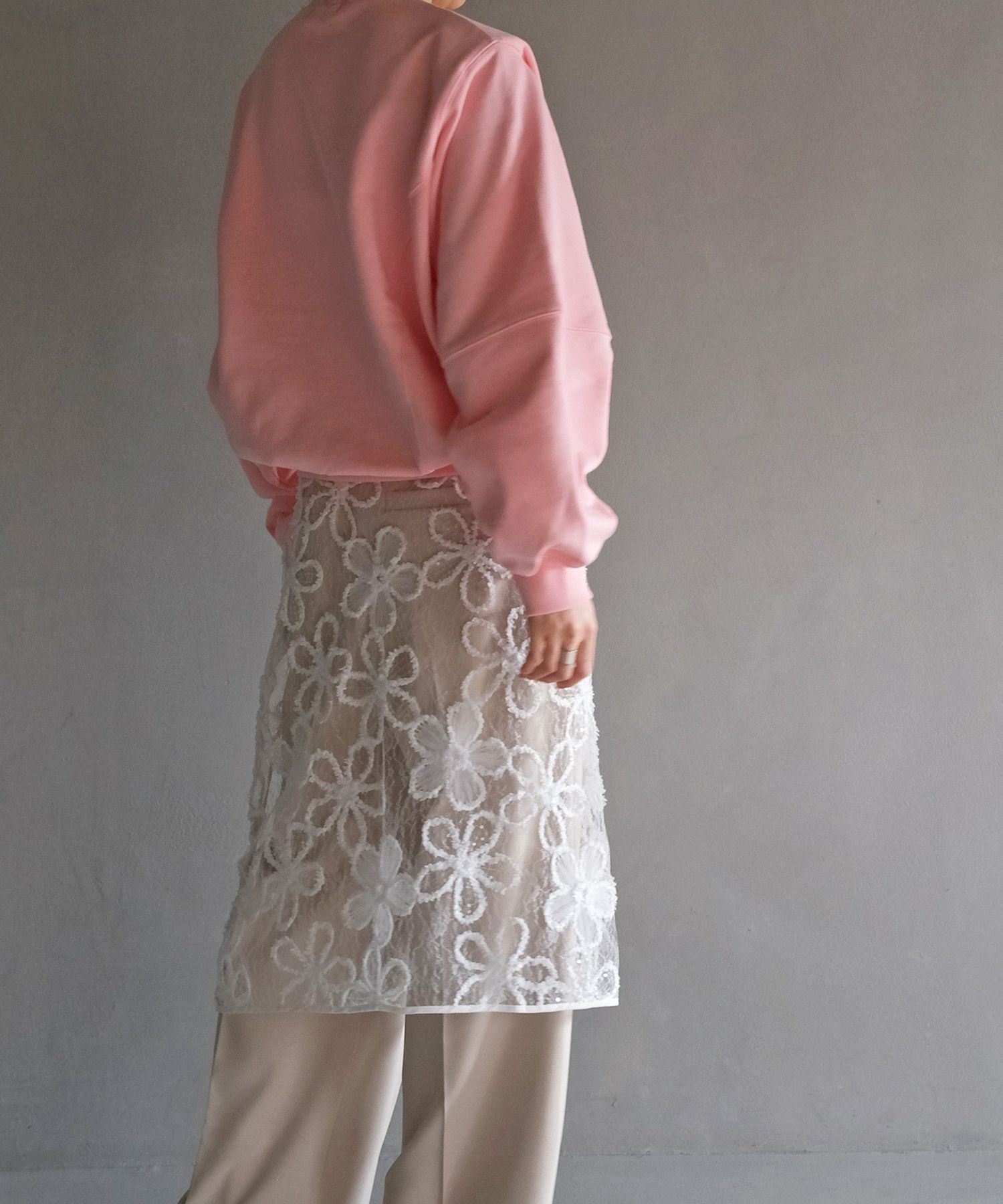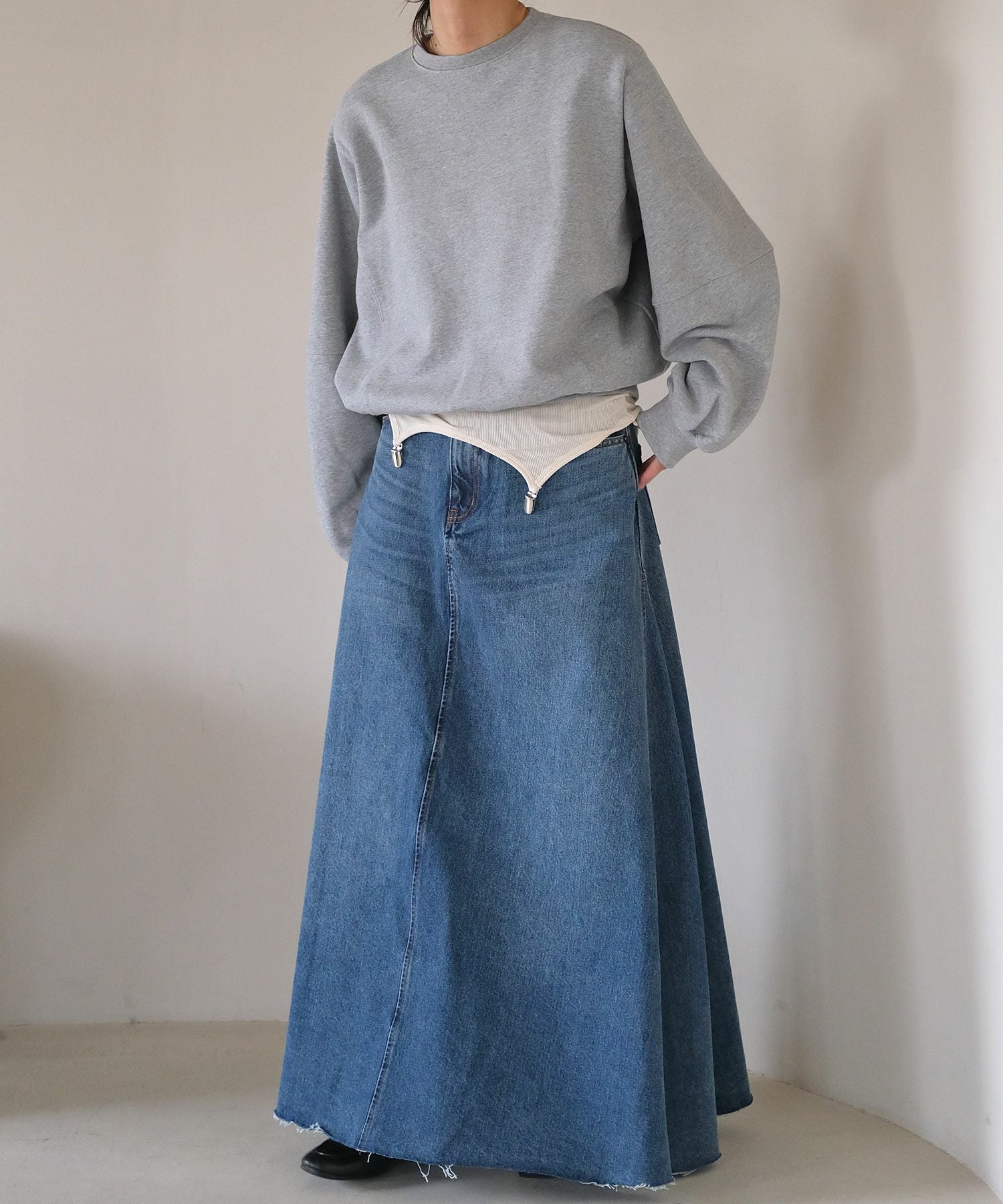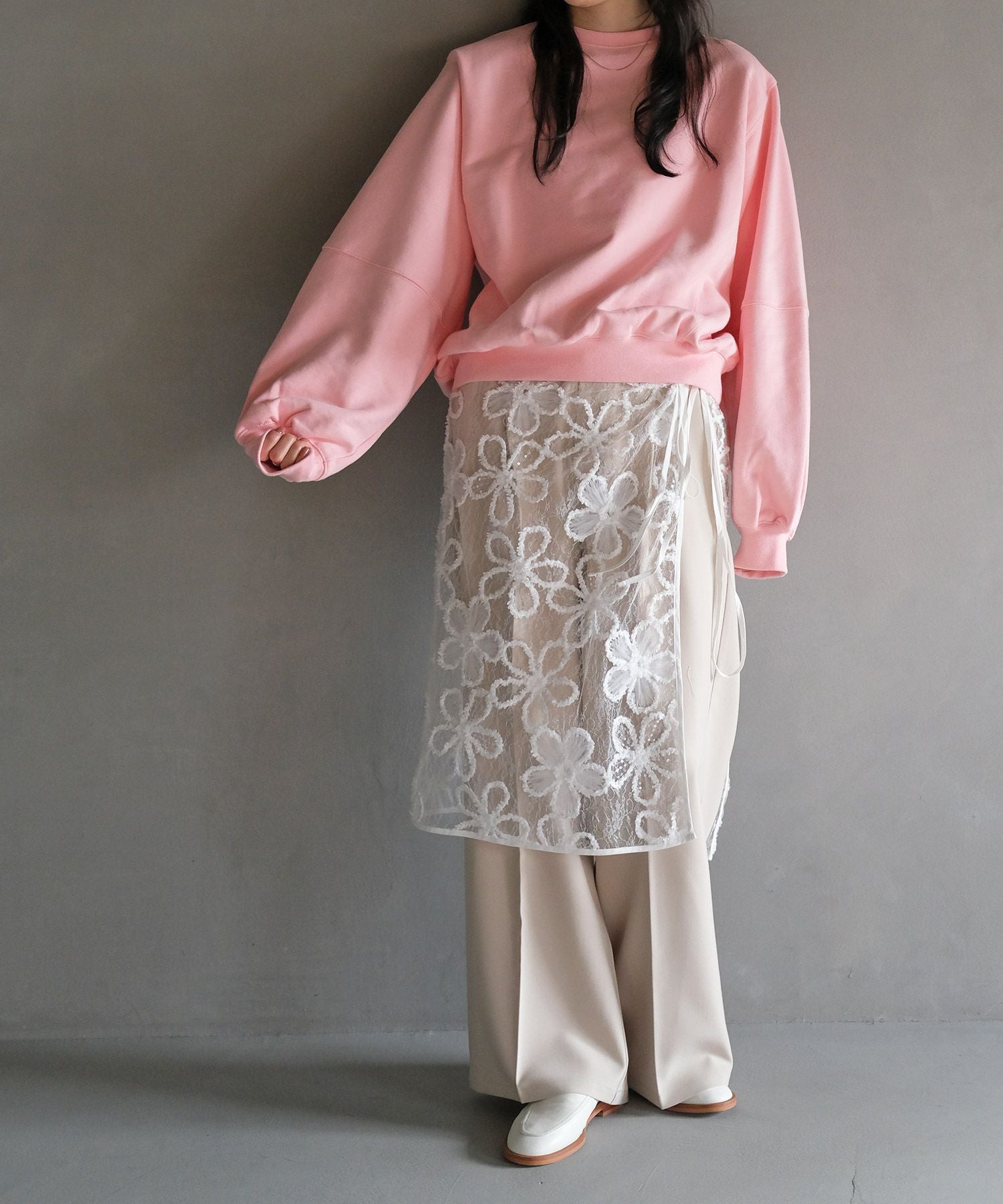 カジュアルなスウェットに取り外し可能な肩パッドを入れることでシルエットに変化が生まれ、ラフになりすぎない見え感に。