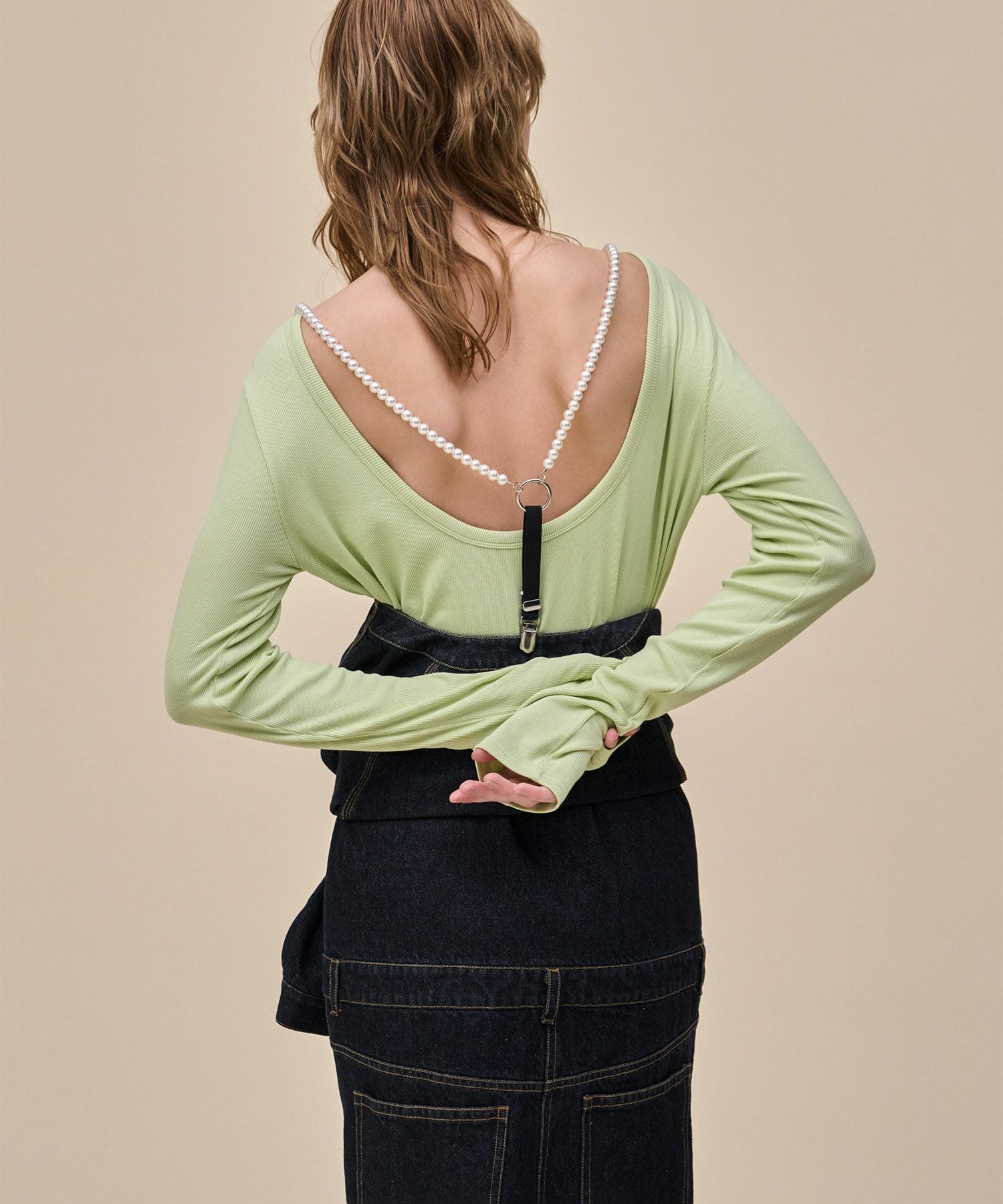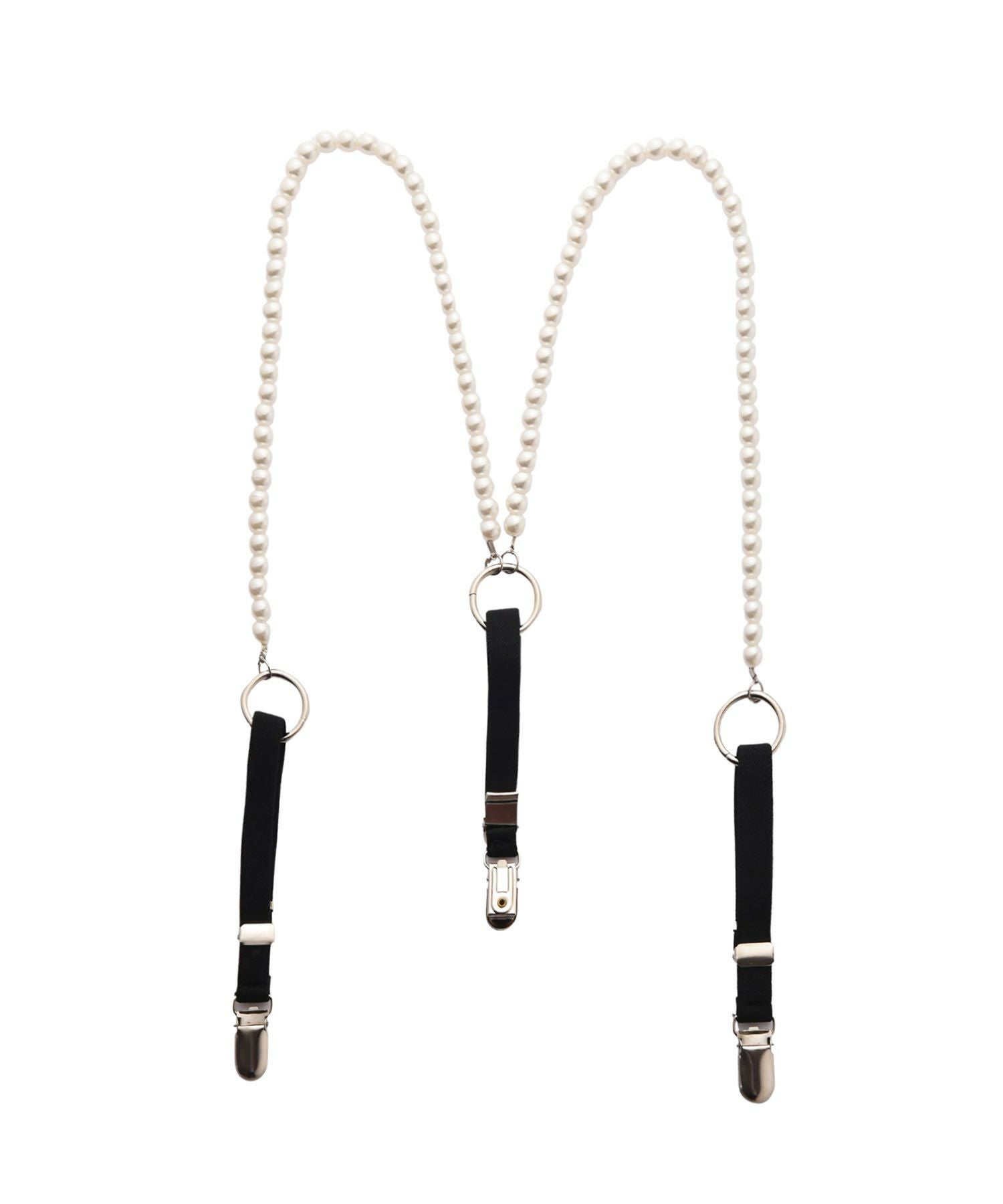 アクセサリーを身に付けているかのようなスタイリングのポイントになるパールサスペンダー