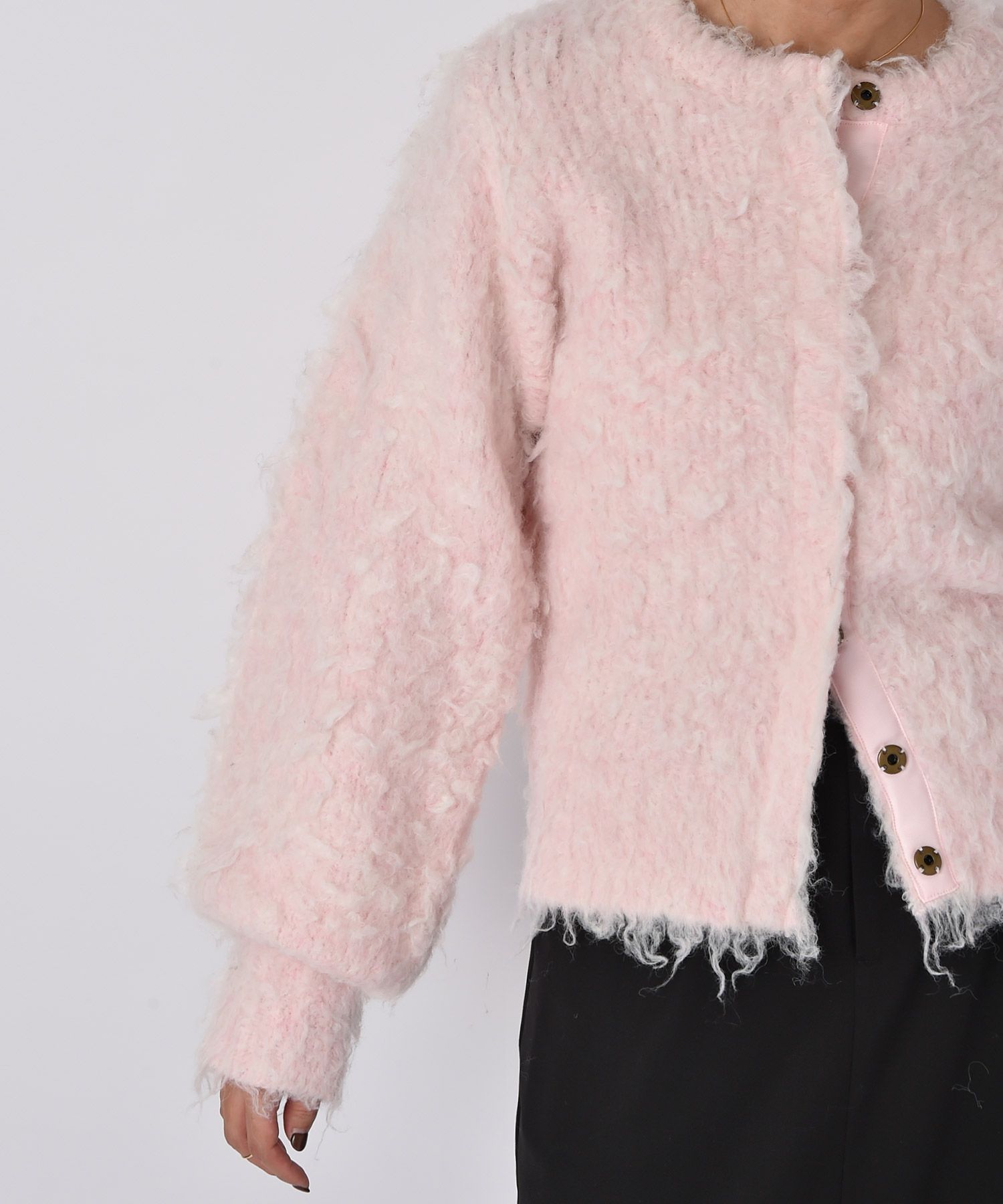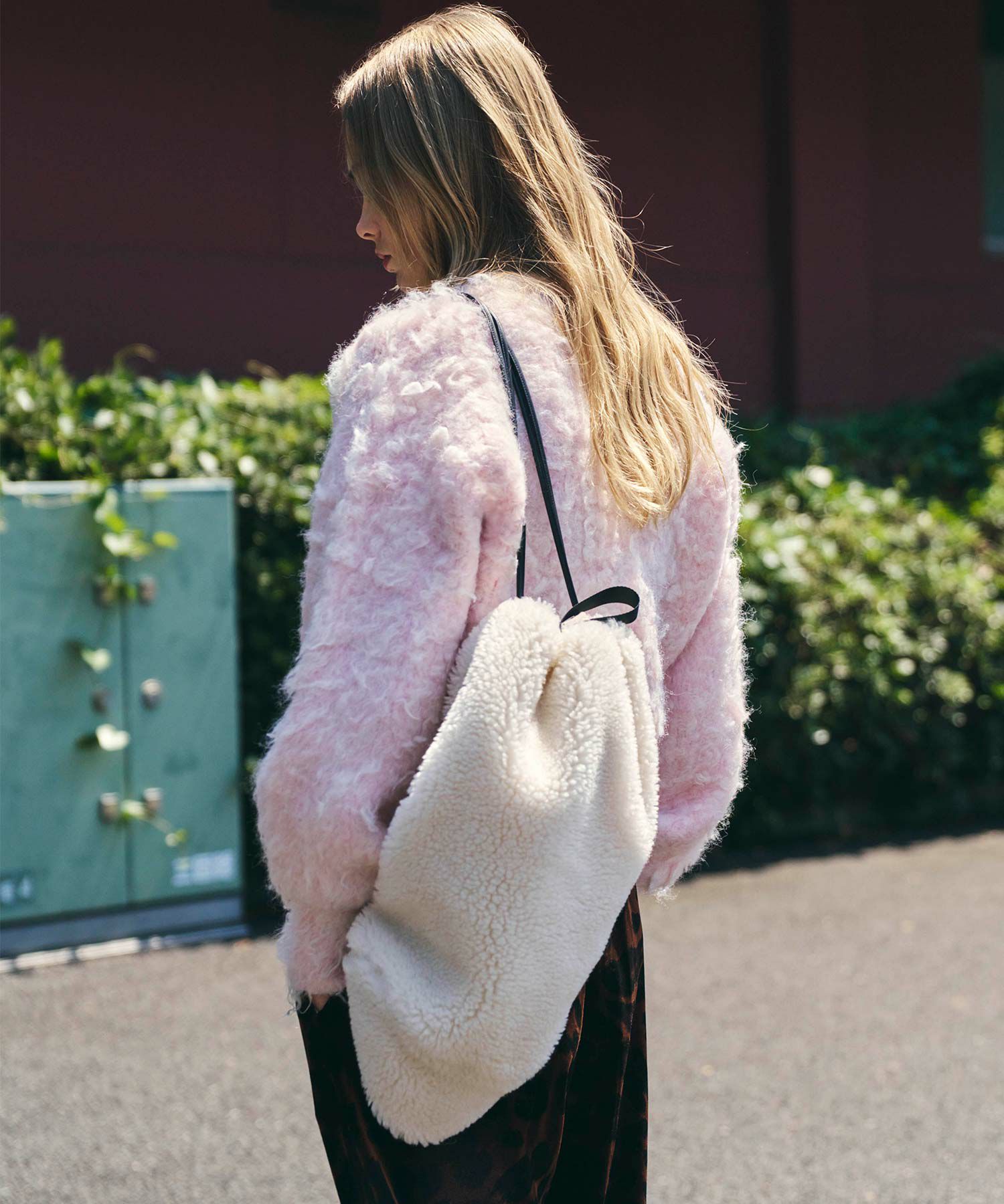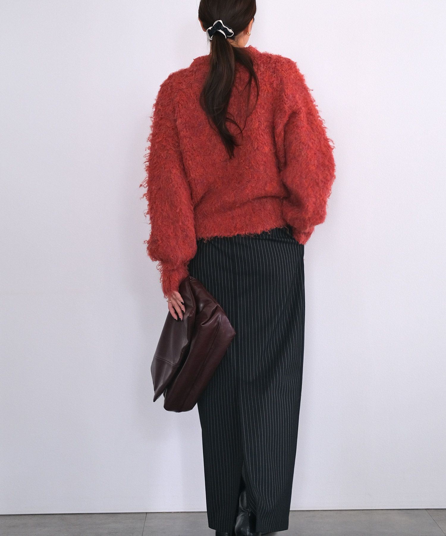 毛足の束感を出した編地が華やかを演出し、程よいサイズ感と袖のボリュームシルエットでニュアンス感もプラス。