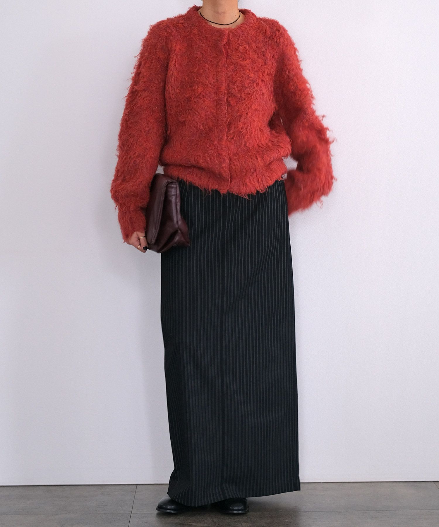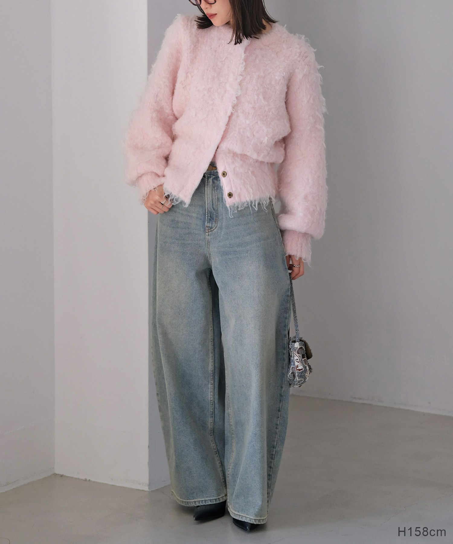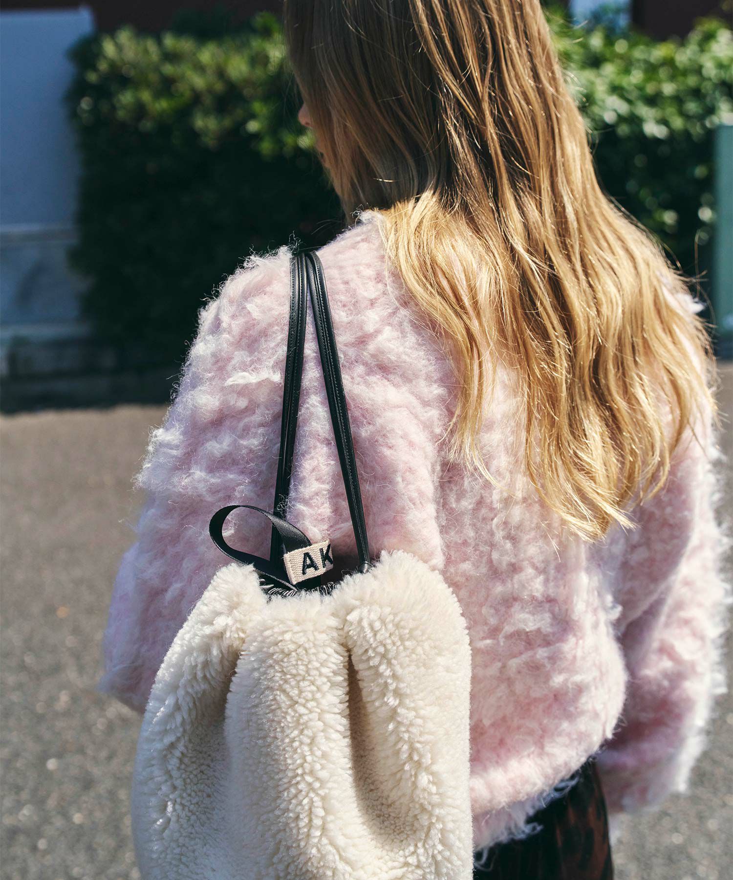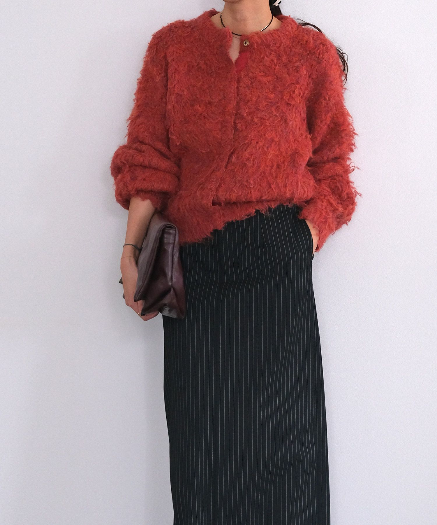 毛足の束感を出した編地が華やかを演出し、程よいサイズ感と袖のボリュームシルエットでニュアンス感もプラス。