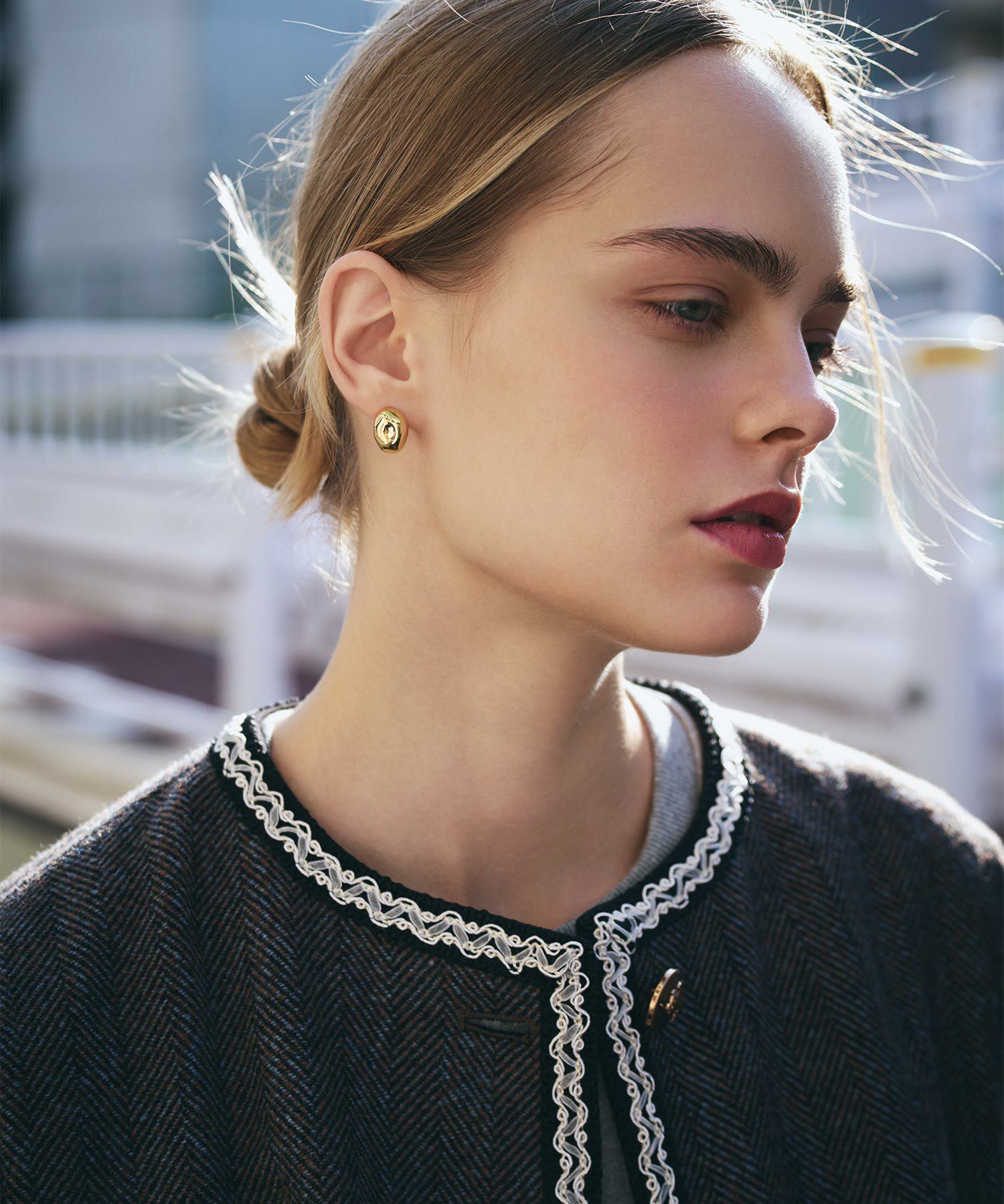 凹凸した表面のビーンズ型ピアスがスタイリングのアクセントに