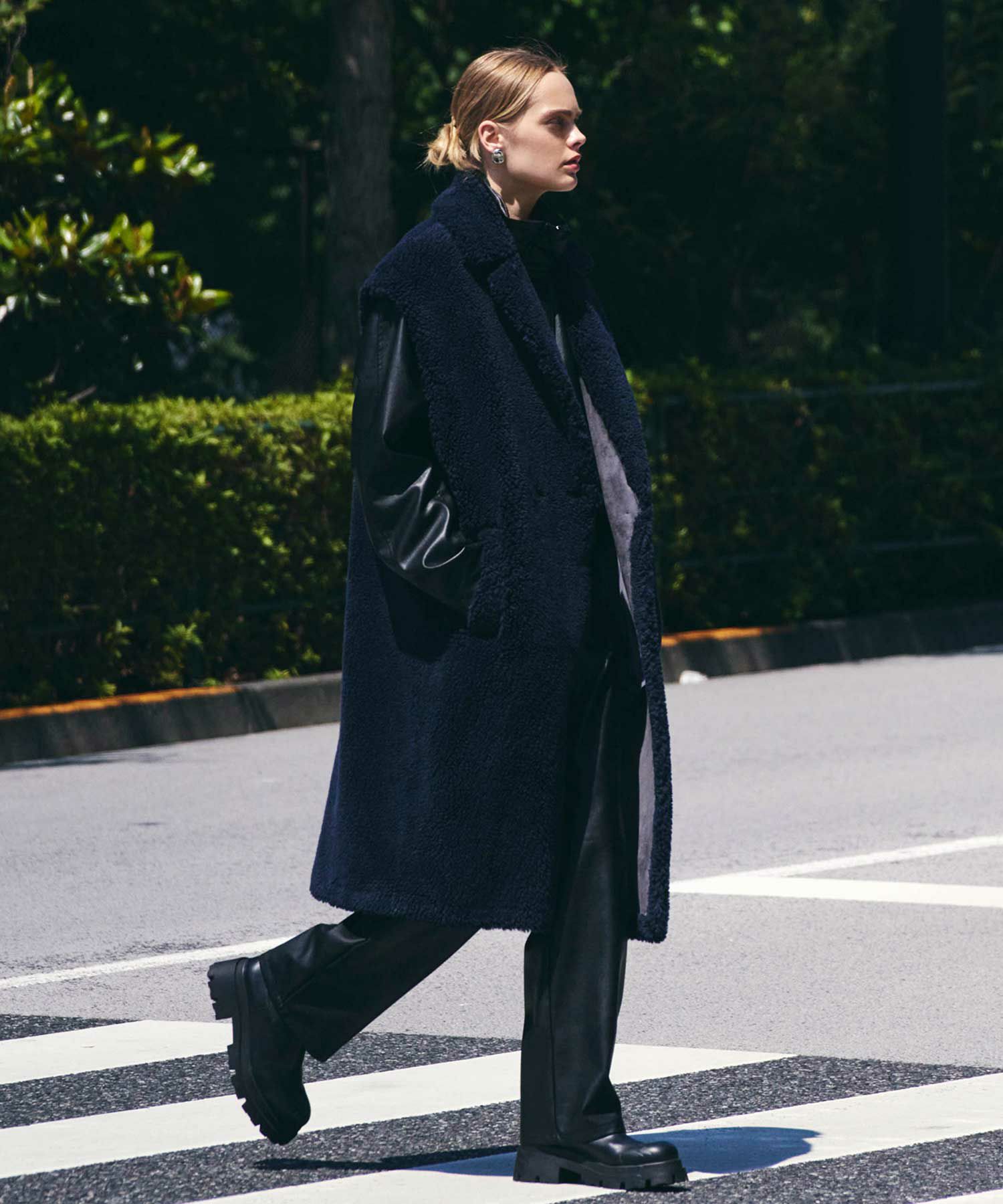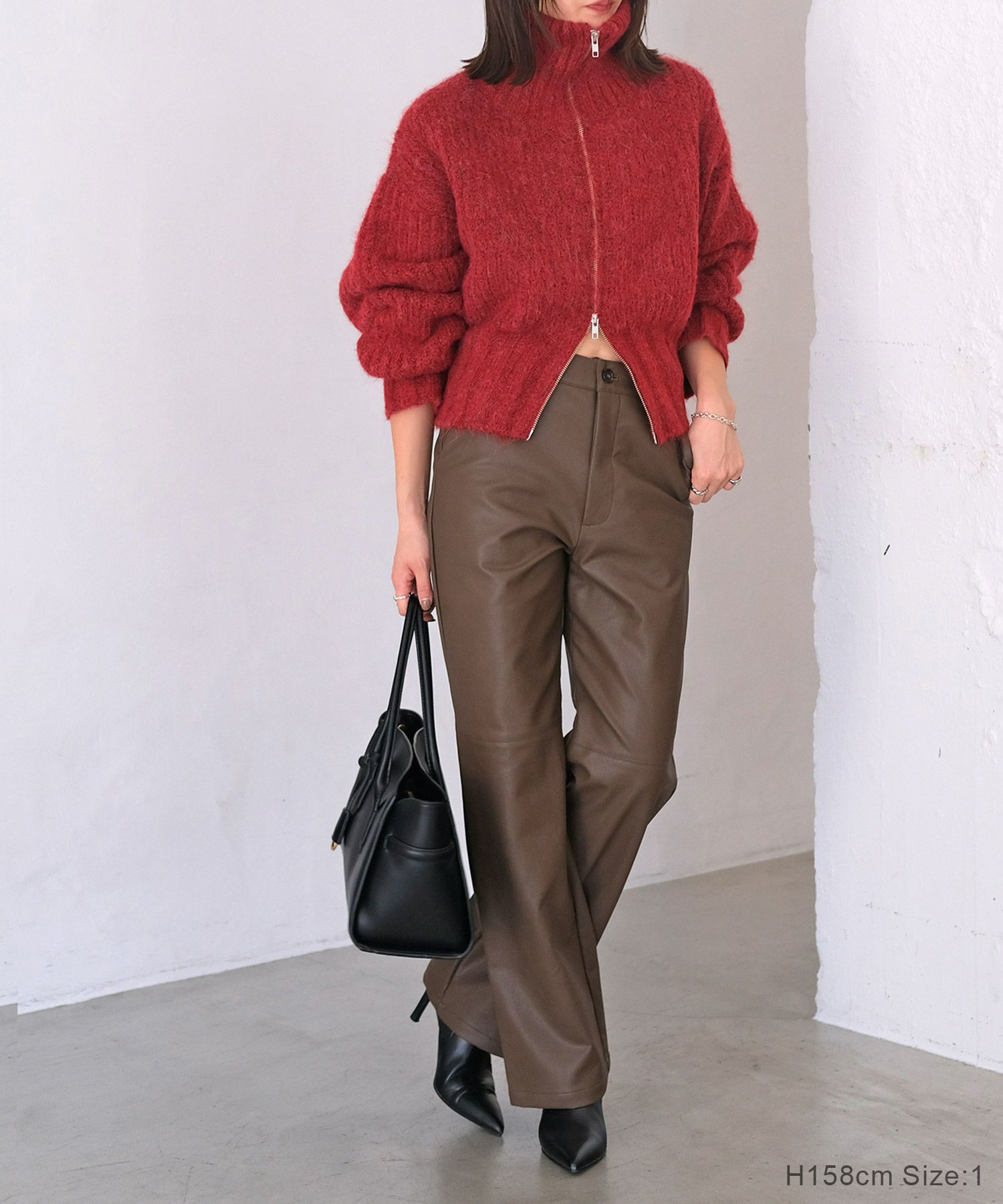 同素材のフェイクレザージップアップブルゾンとセットアップで着用すれば、よりモードな雰囲気に。