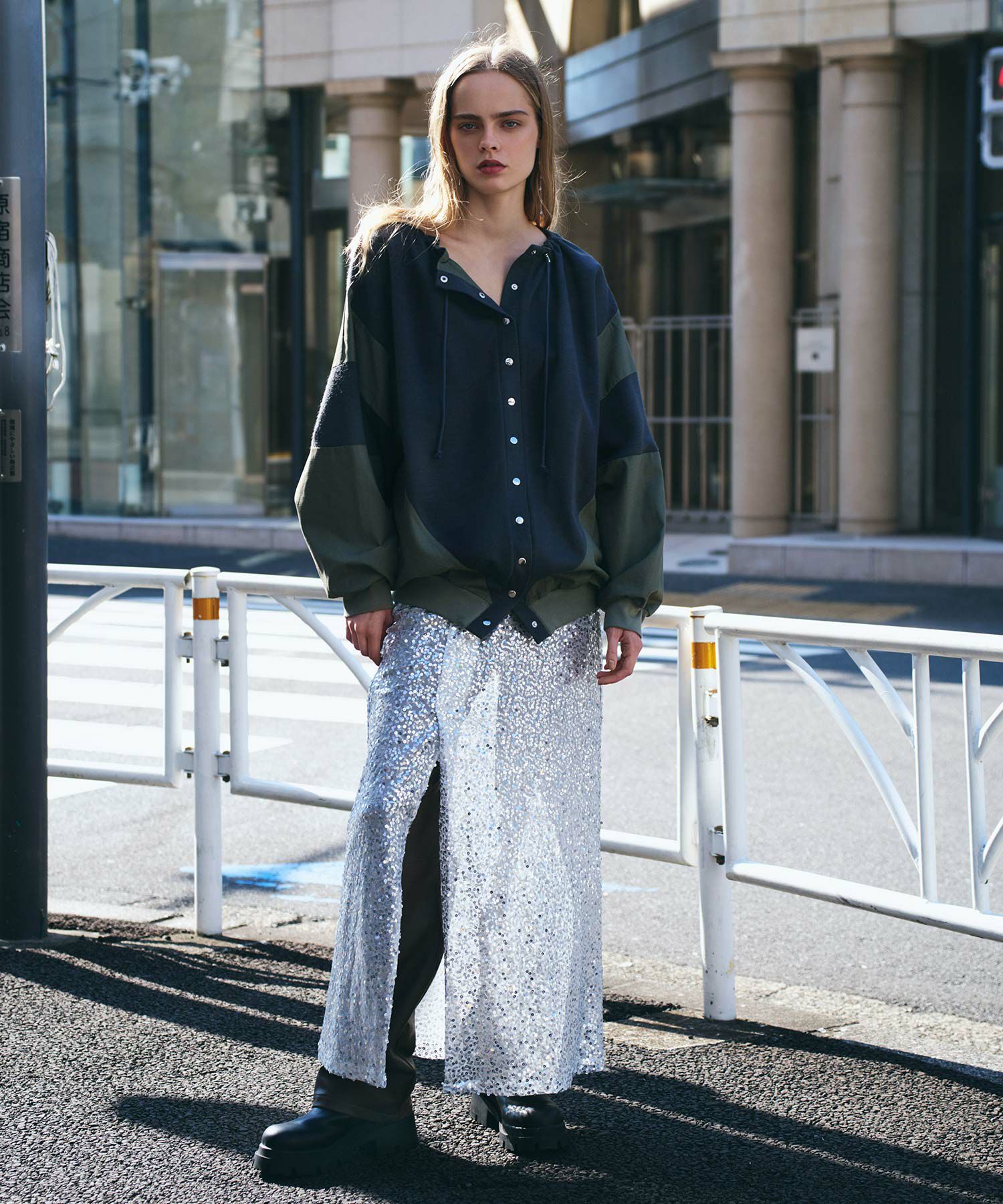 膝あたりに切り替えを入れることで立体感を出しながら、さり気ないアクセントになり、シンプルでありつつもスタイリッシュな印象に仕上がります。