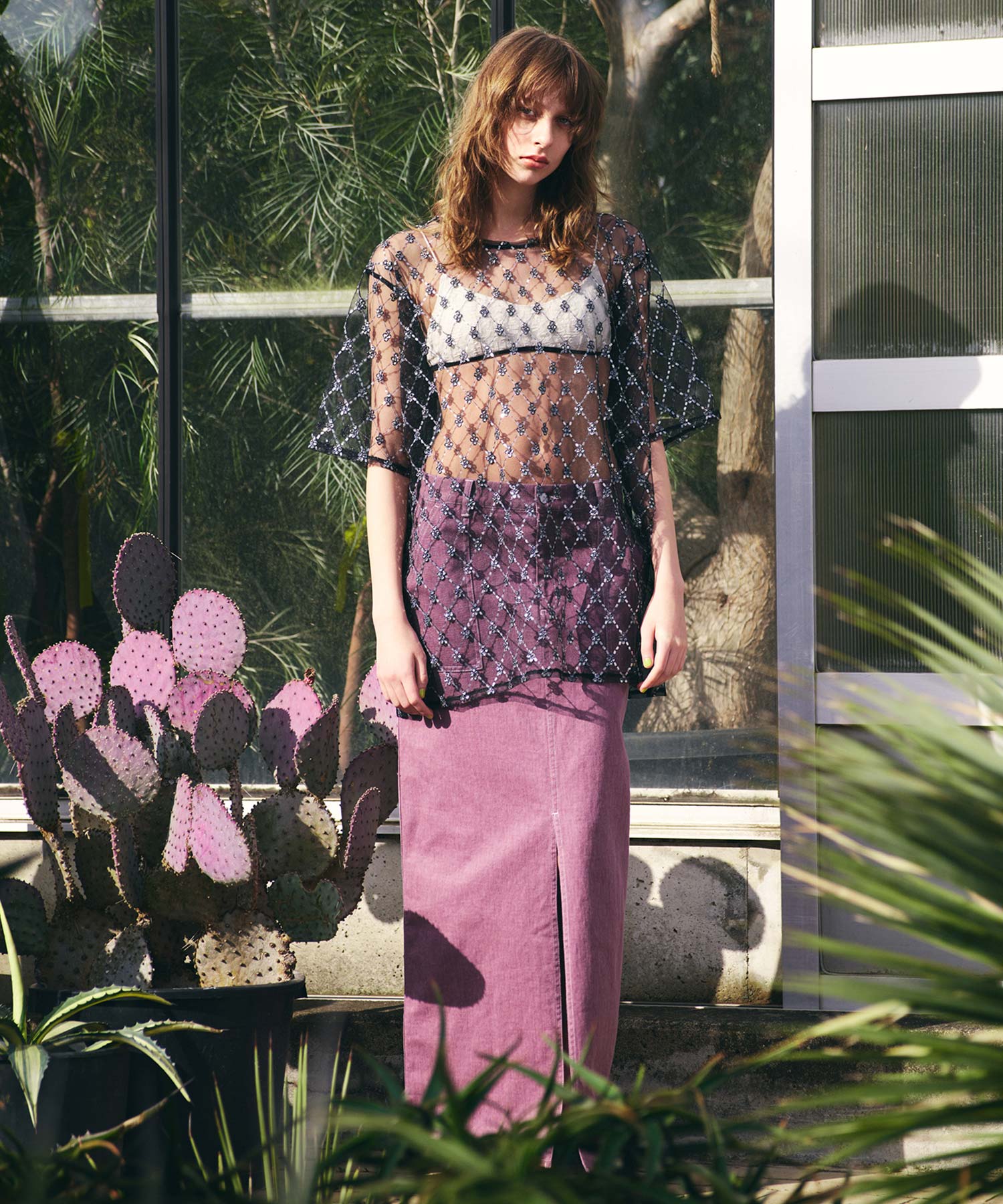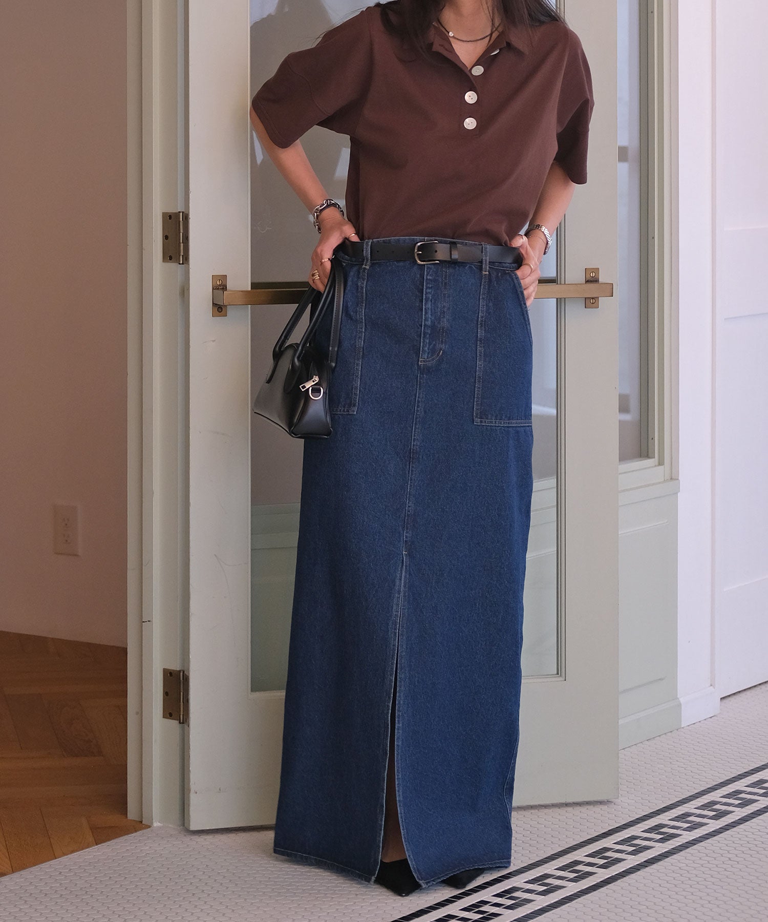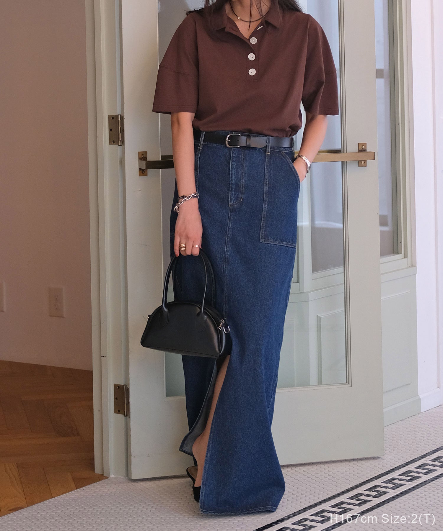 深めに入ったフロントのスリットで抜け感を演出します。