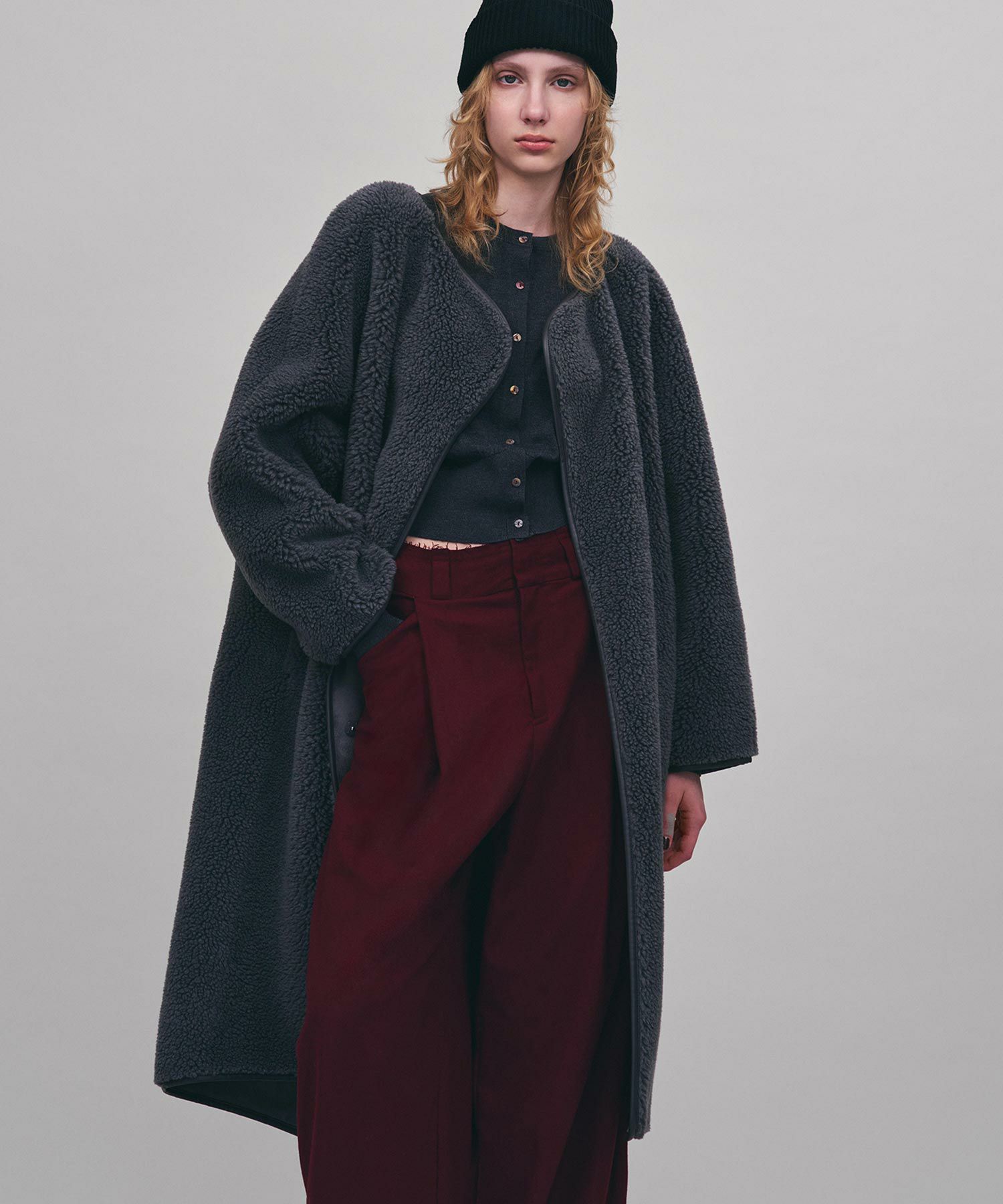 表側のボアと裏側のフェイクスウェードを貼り合わせた生地により、程よいハリ感が丸みのあるフォルムを生み出し、ボリューミーなシルエットにも女性らしさを加えてくれます。