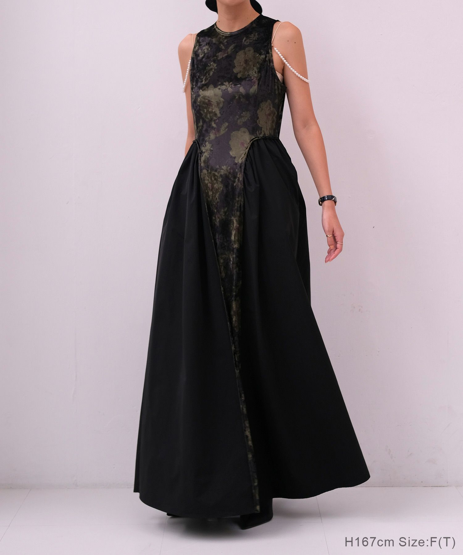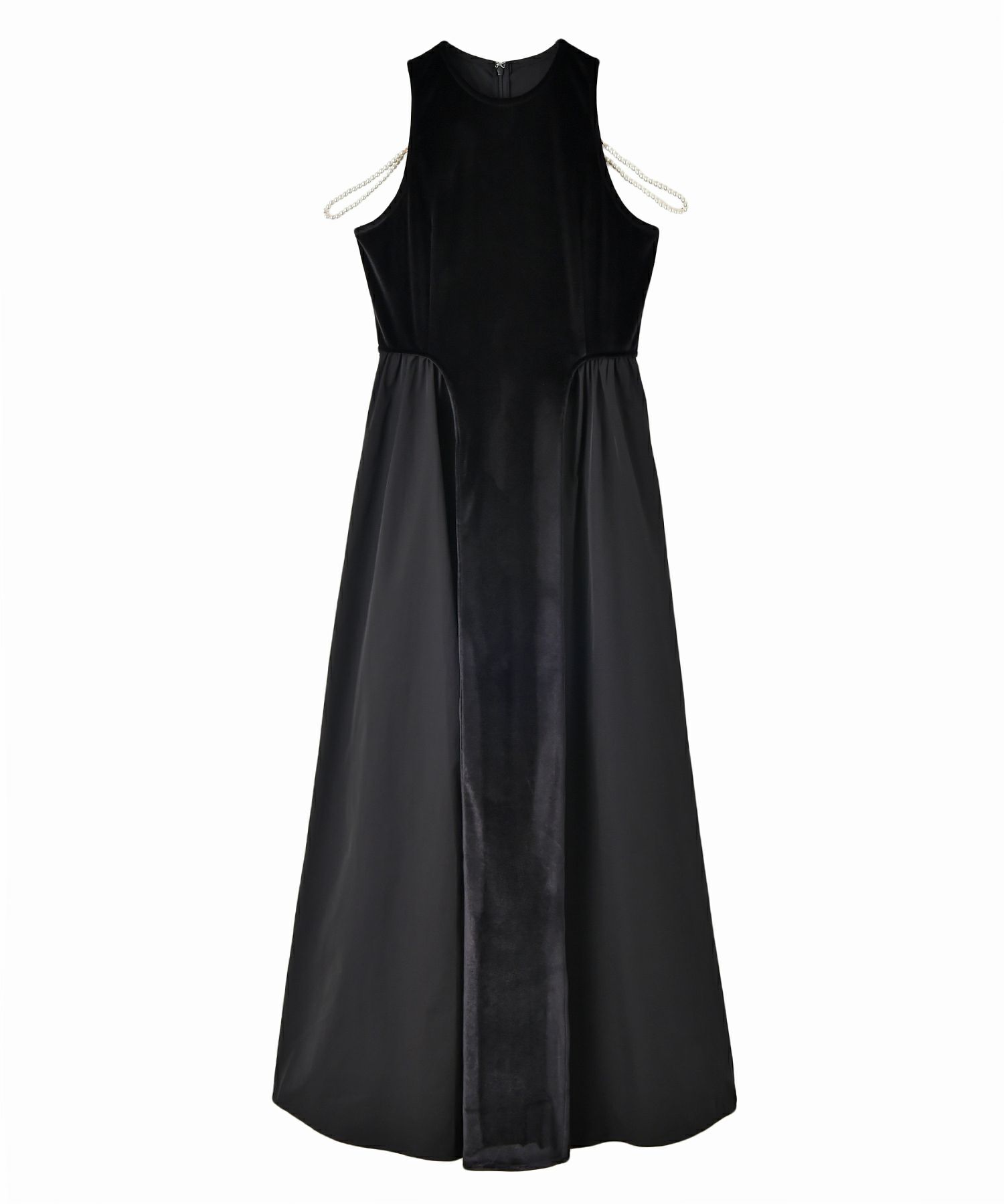パールストラップと異素材の組み合わせが特別感のあるマキシワンピース。