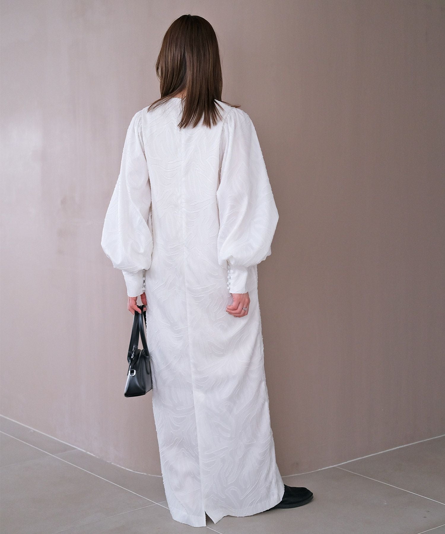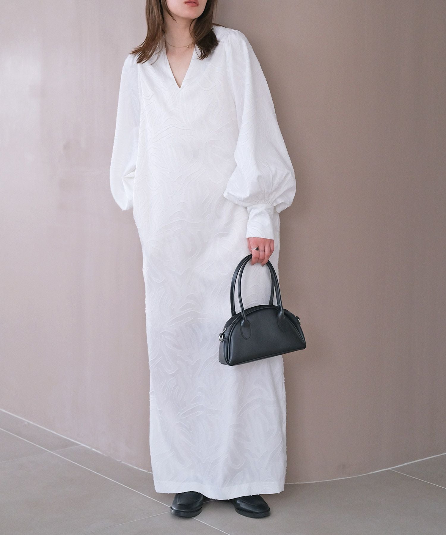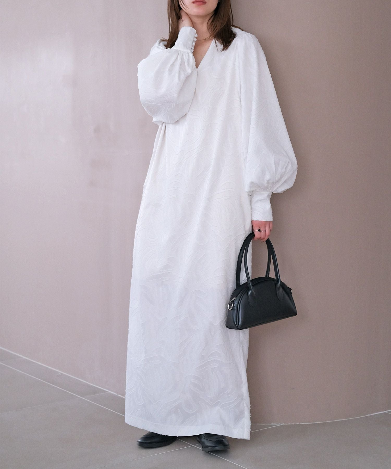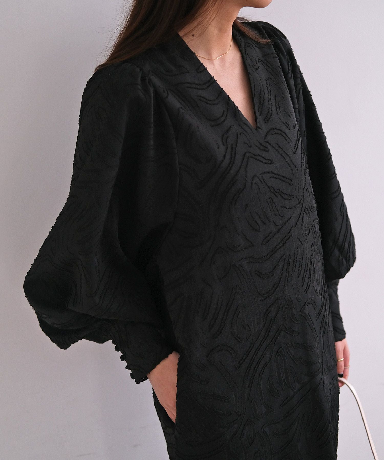 ボリュームスリーブとジャガード素材が大人に華やぐワンピース