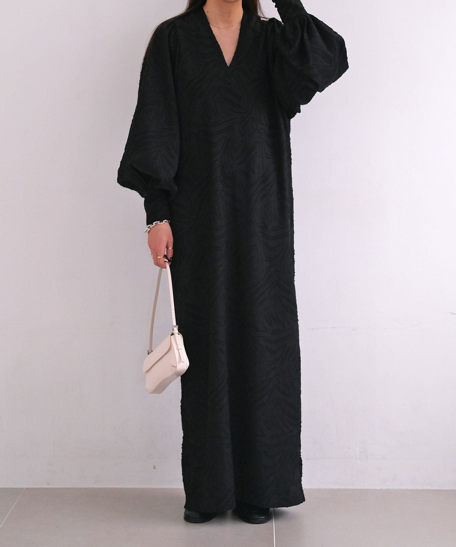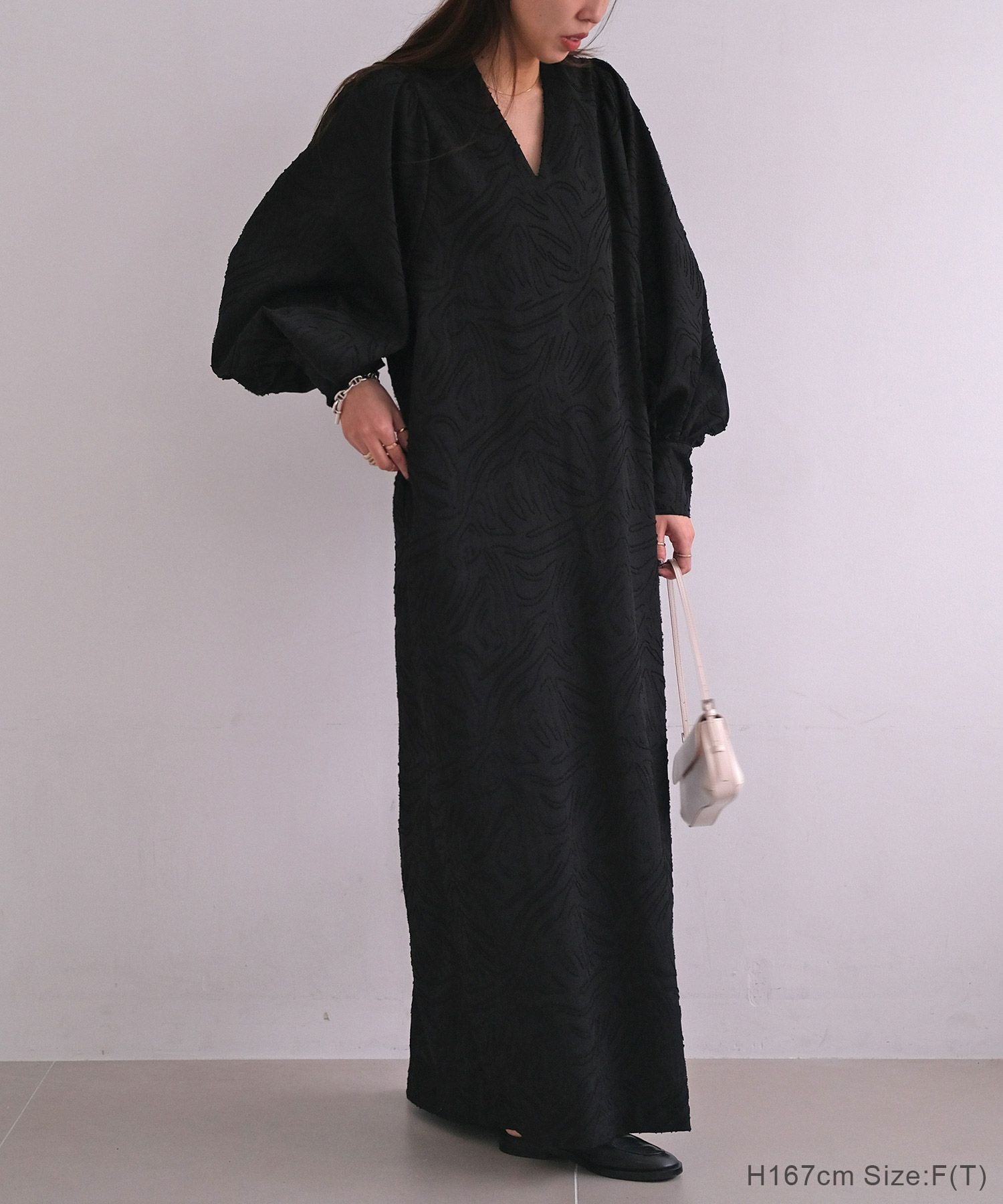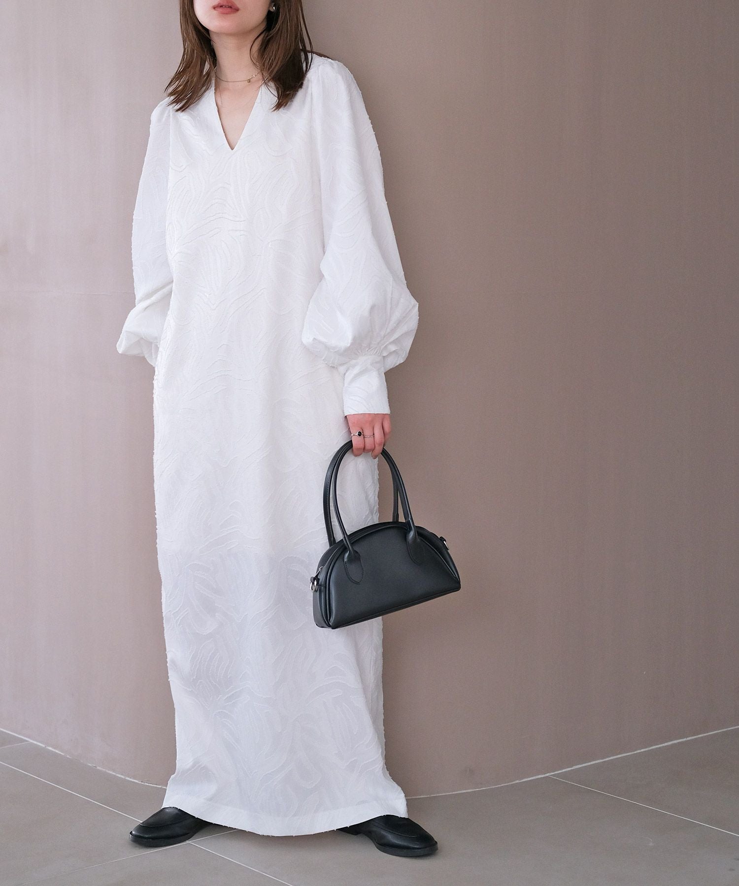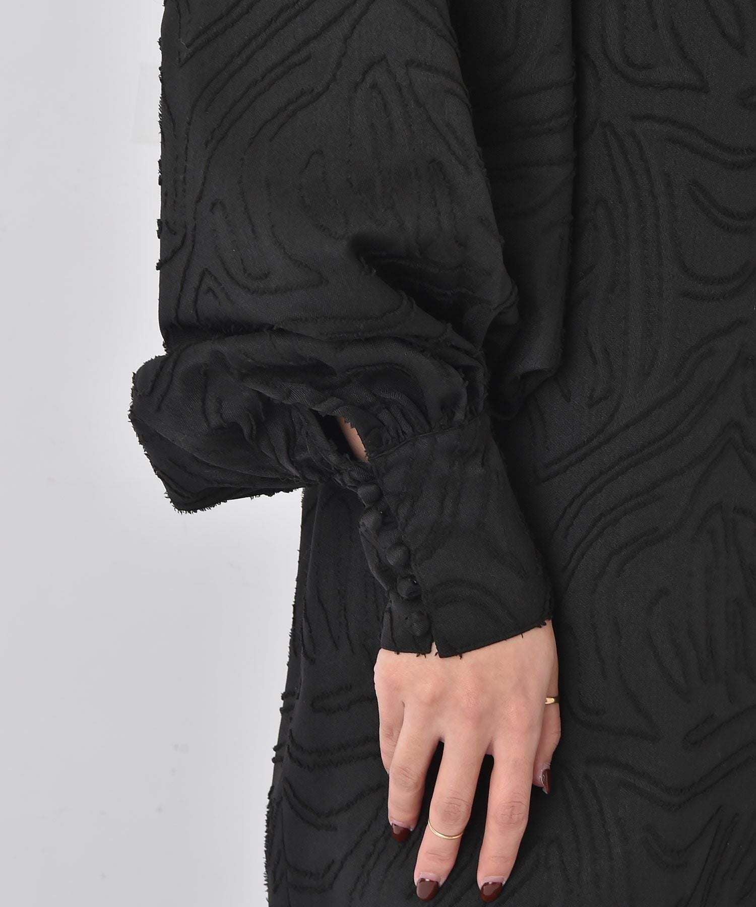 ボリュームスリーブとジャガード素材が大人に華やぐワンピース