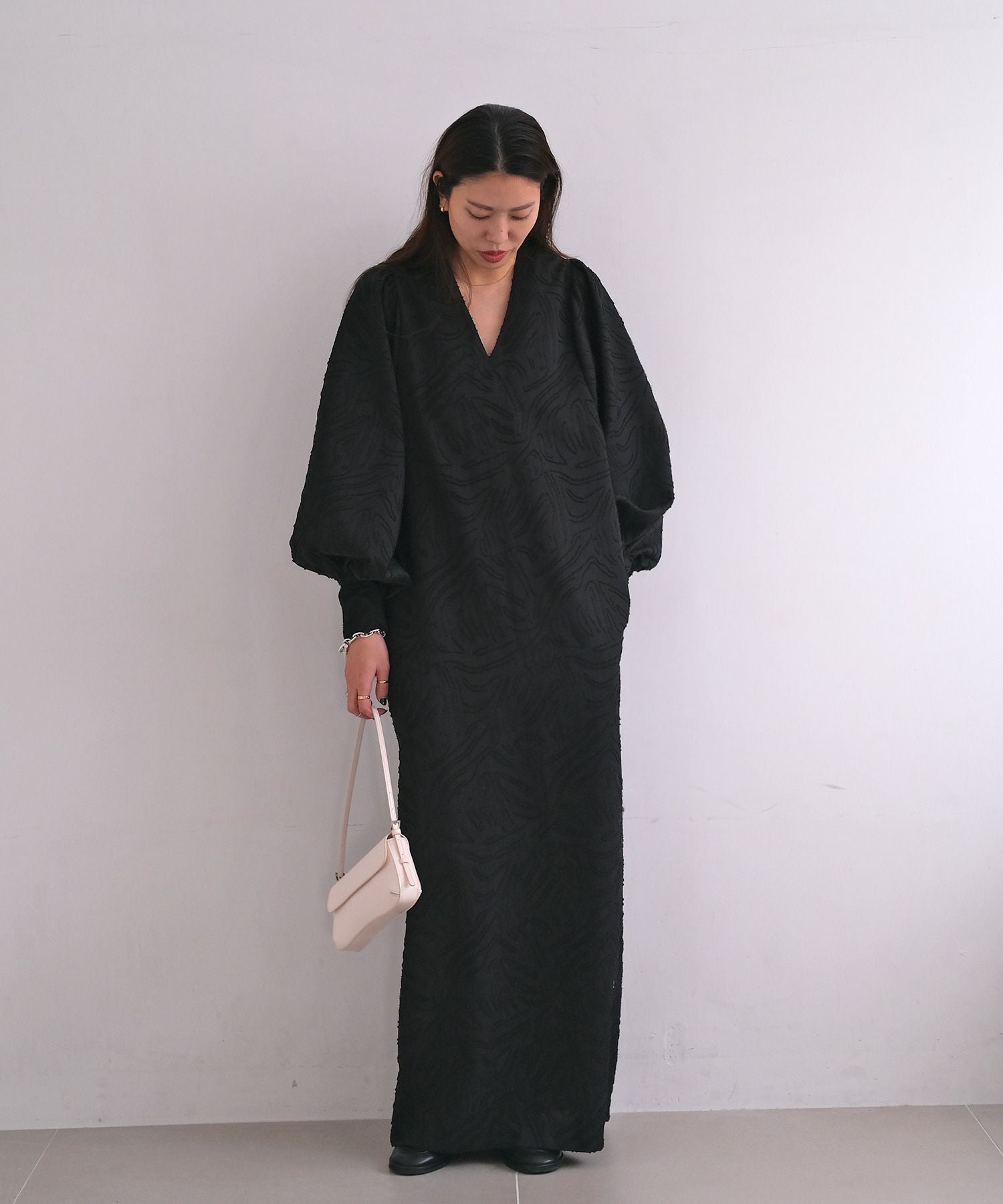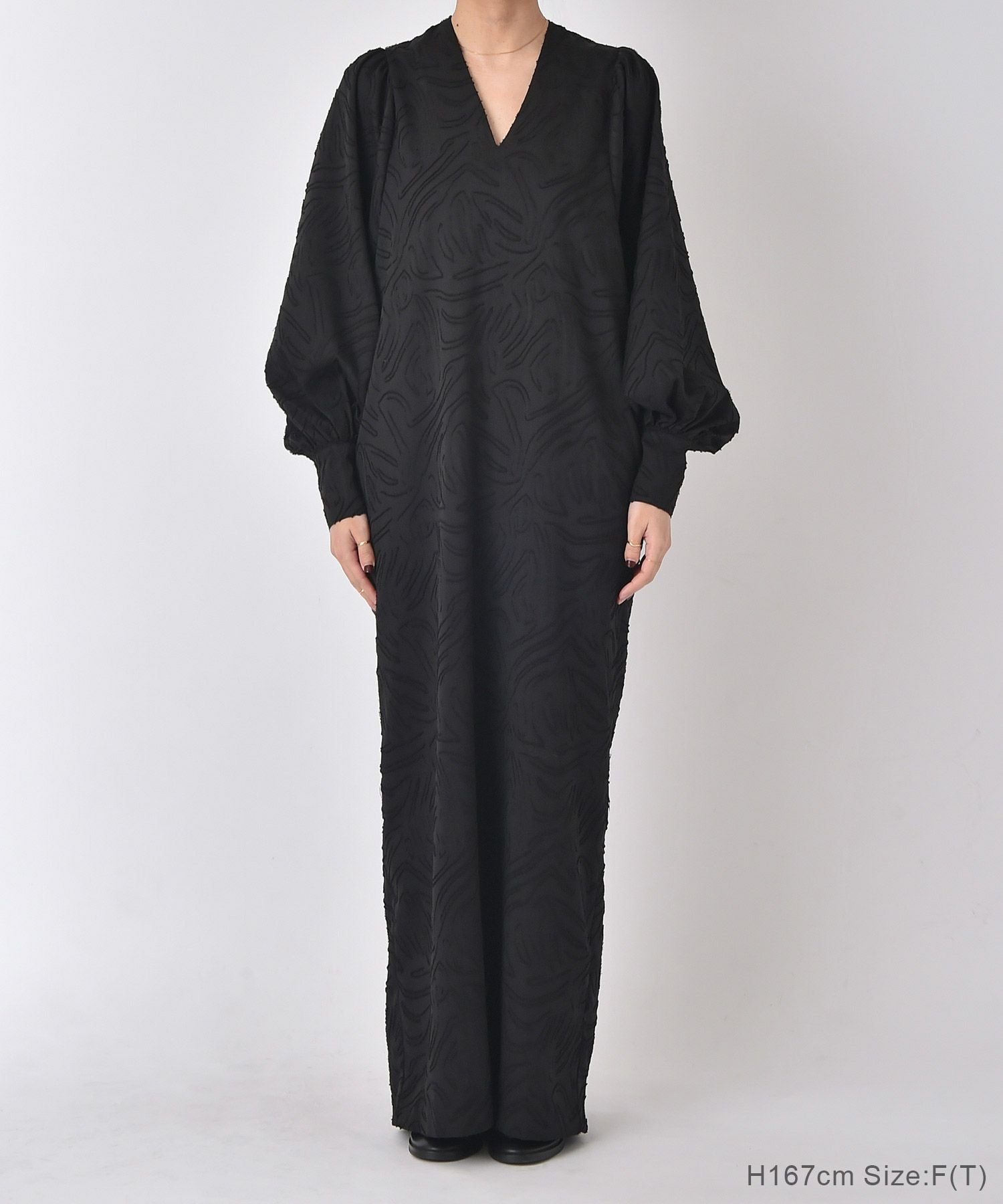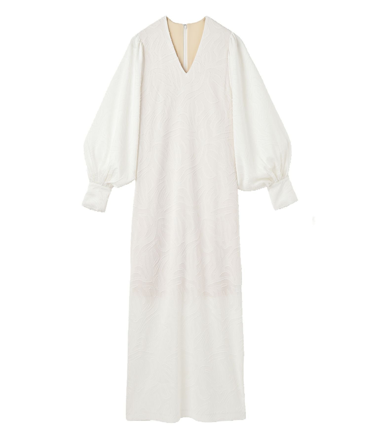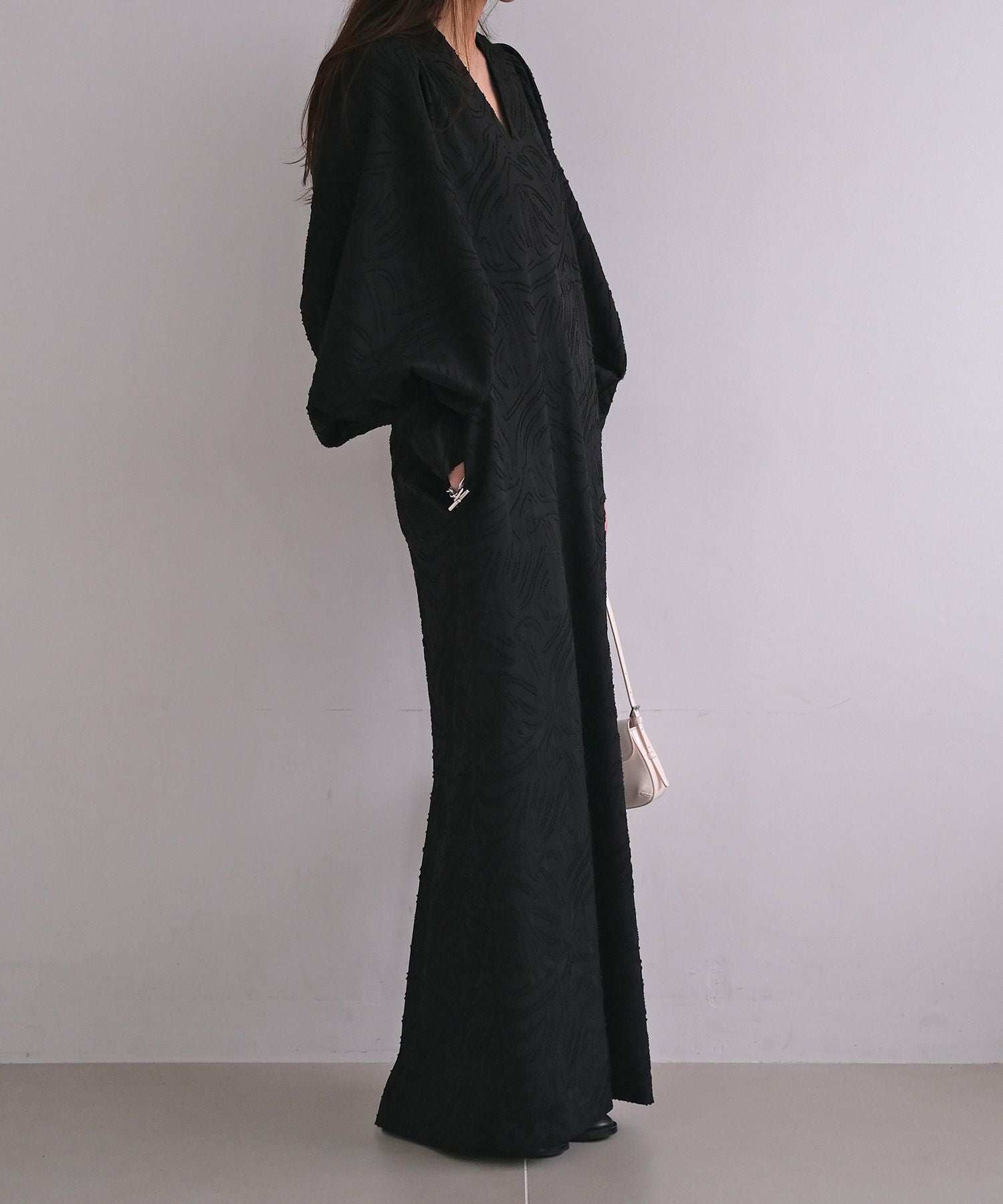 ボリュームスリーブとジャガード素材が大人に華やぐワンピース