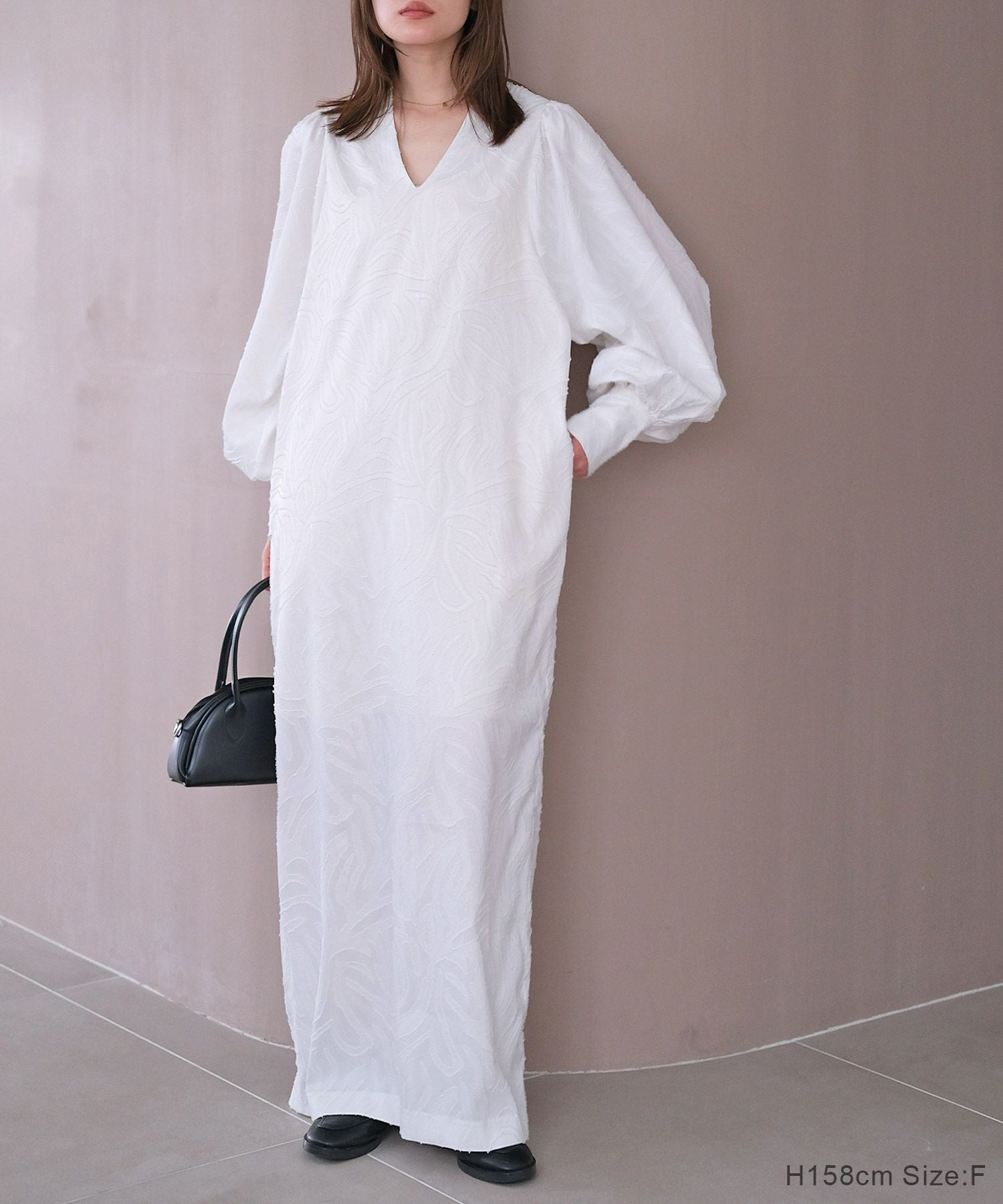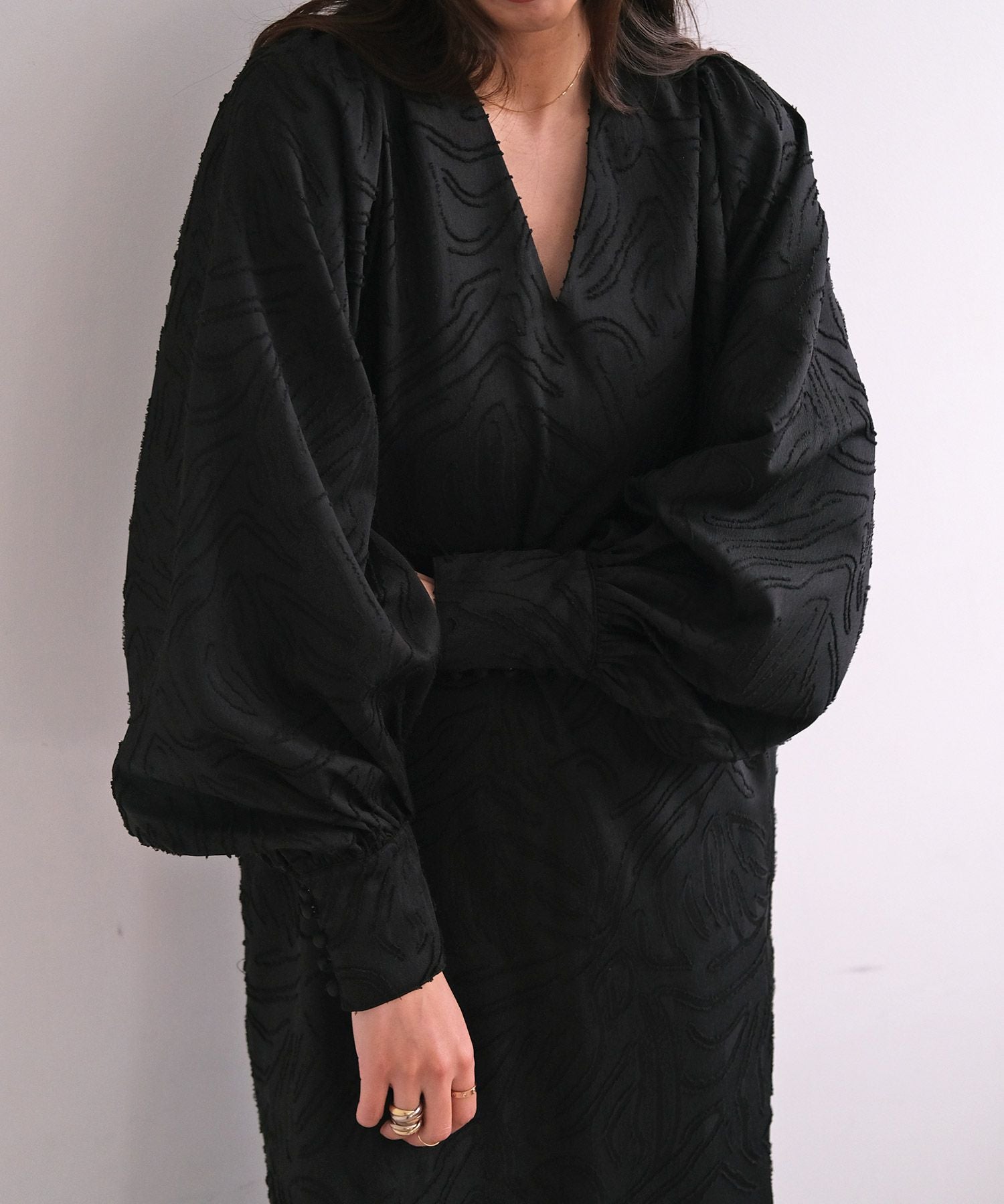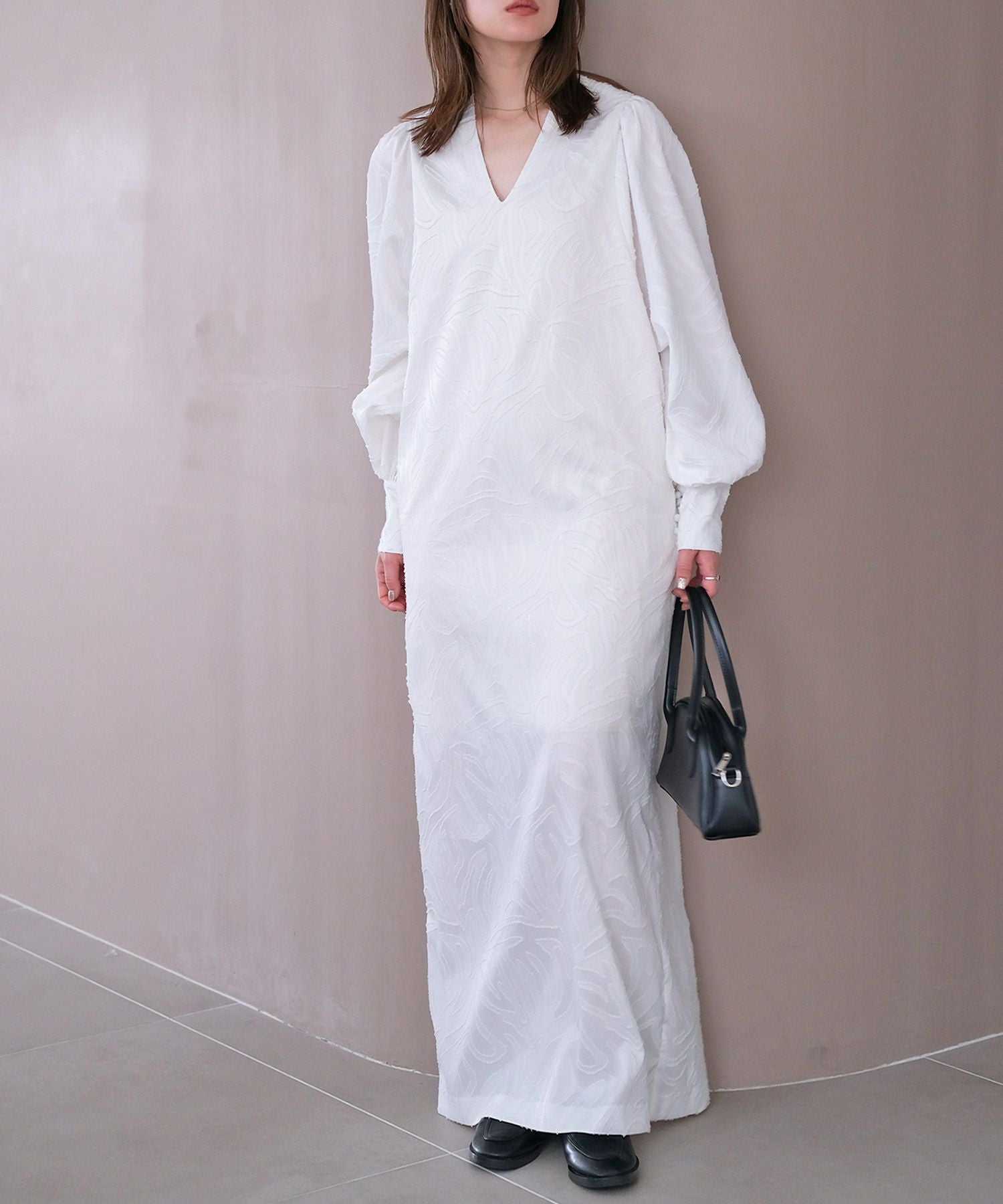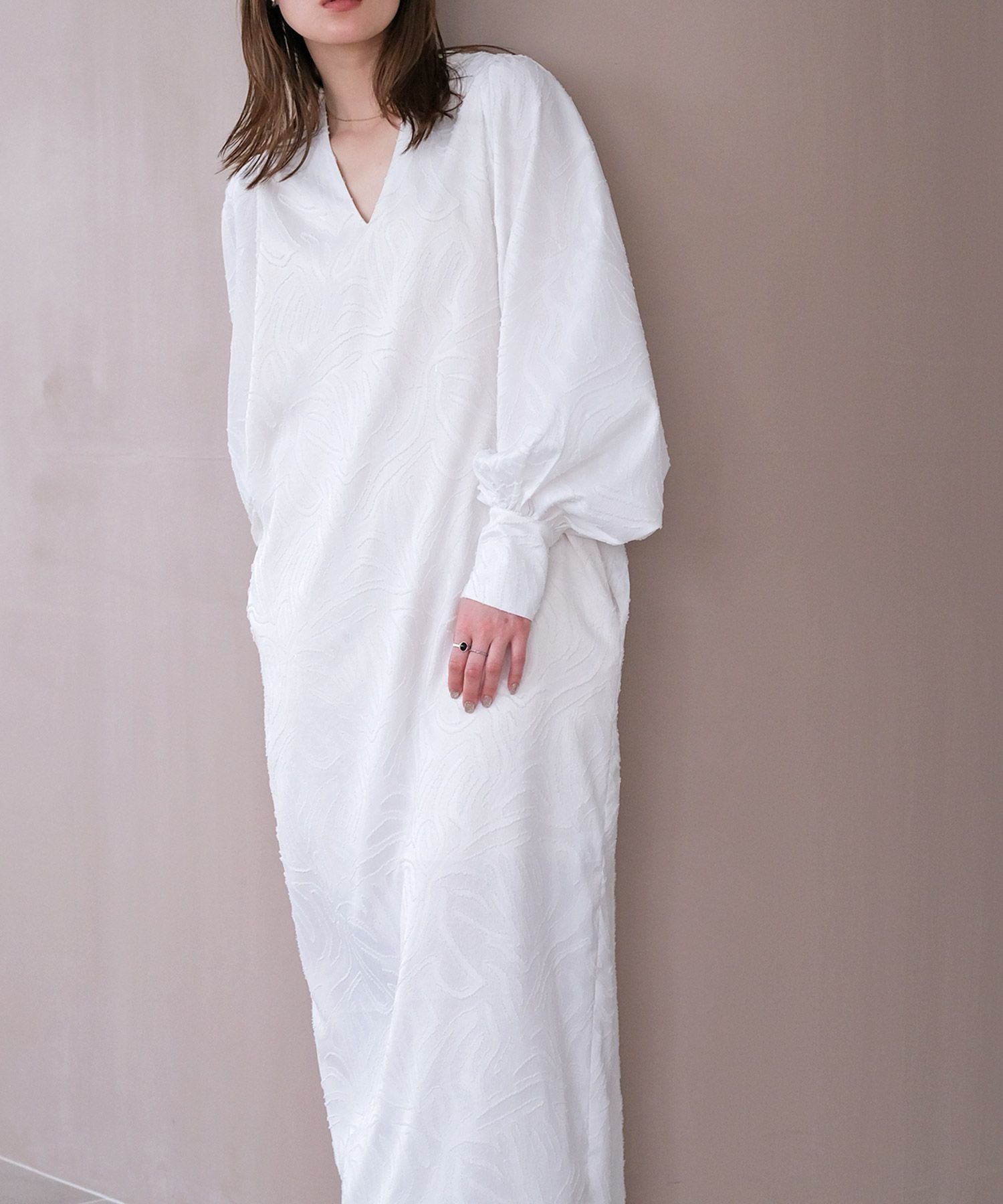 立体的な表情のジャガード生地を使用したVネックワンピース。