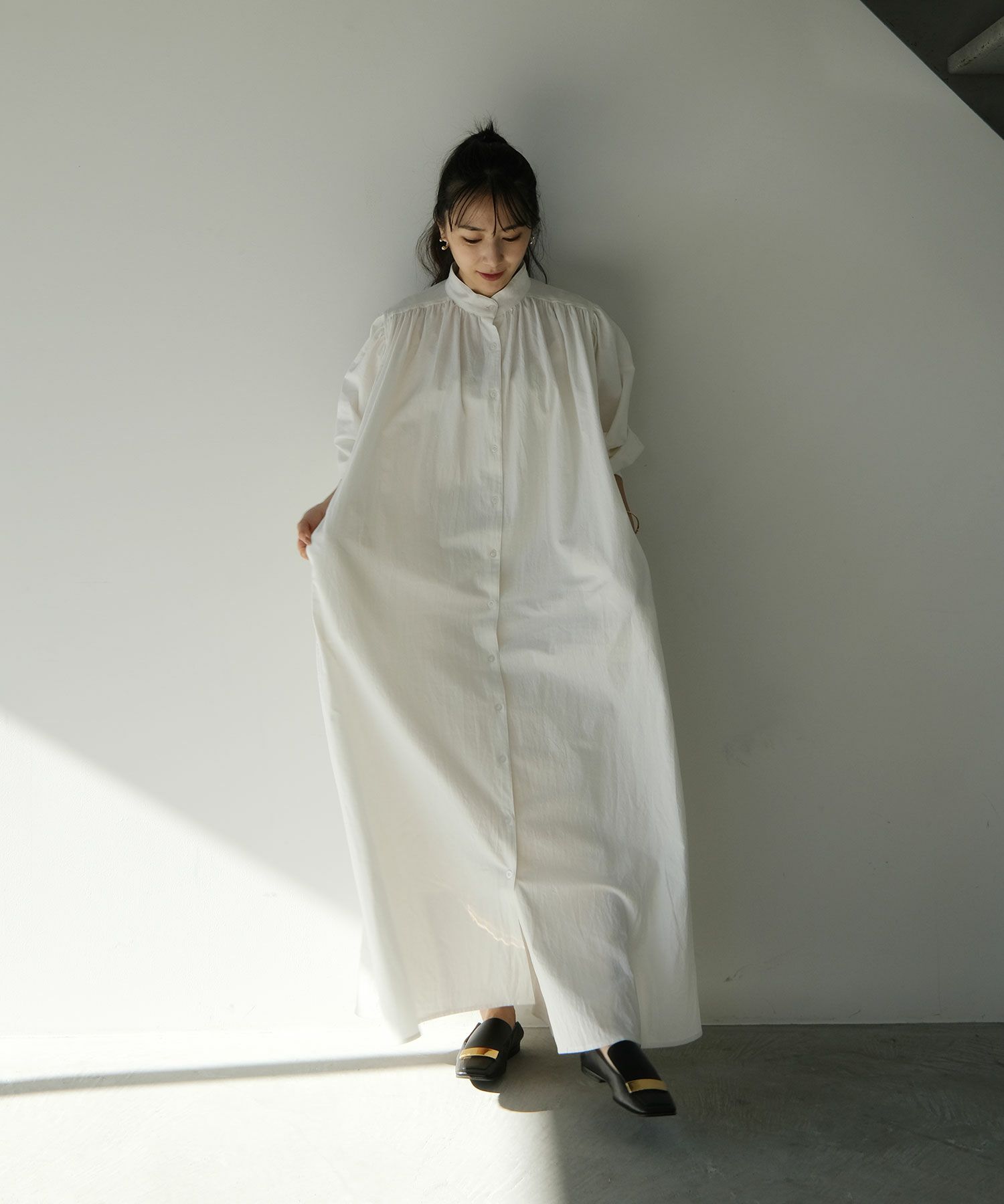 存在感があるので、さらっとシンプルに着ていただくだけで、様になる大人のシャツワンピースです。