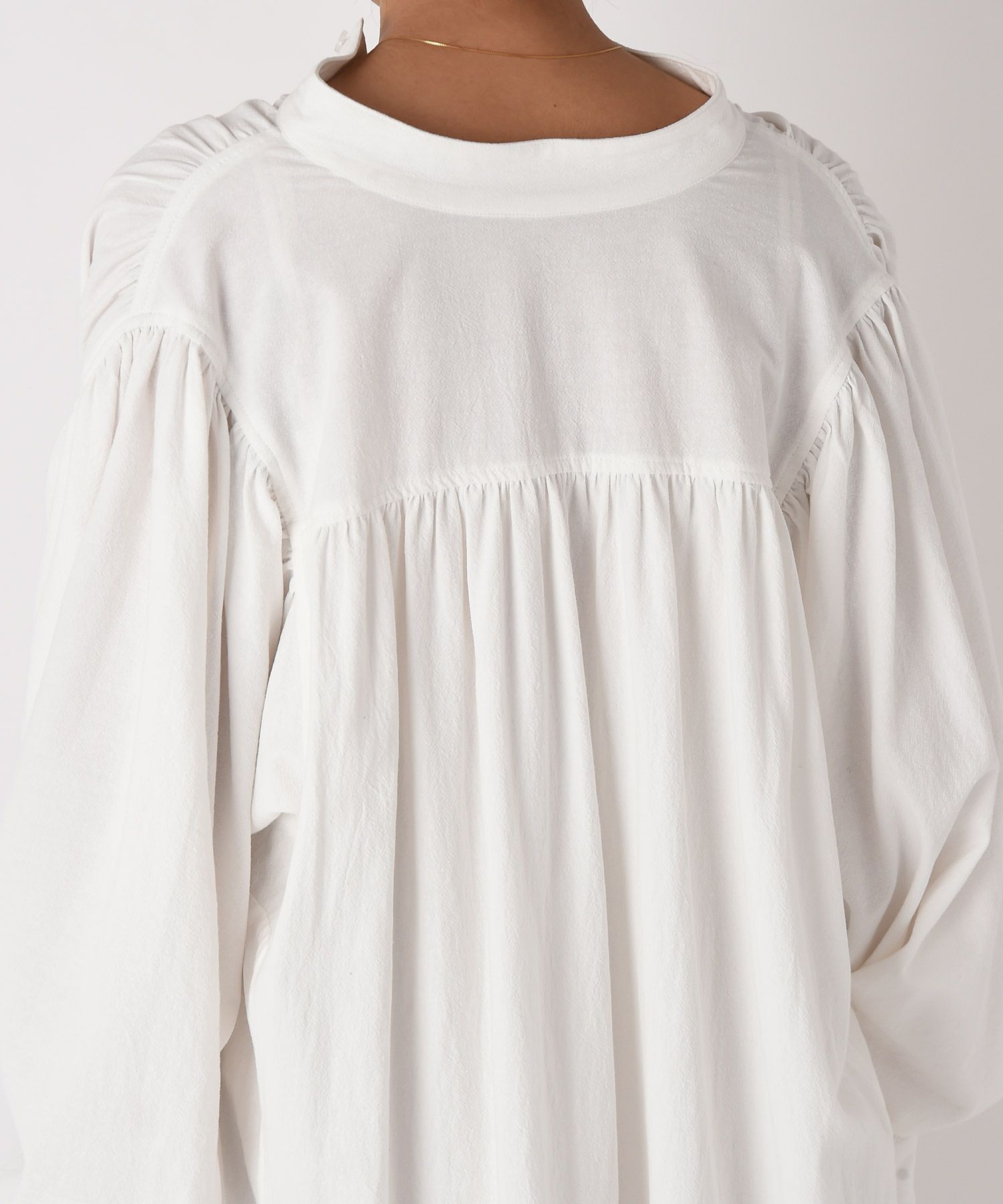 太めな袖と細めな袖口でメリハリをつけ、各所にギャザーを施すことにより、さらにボリュームを出しています。