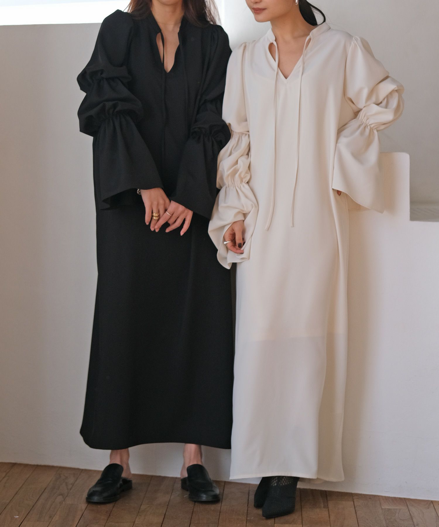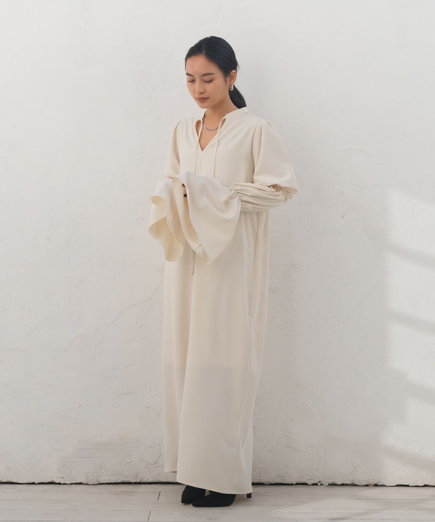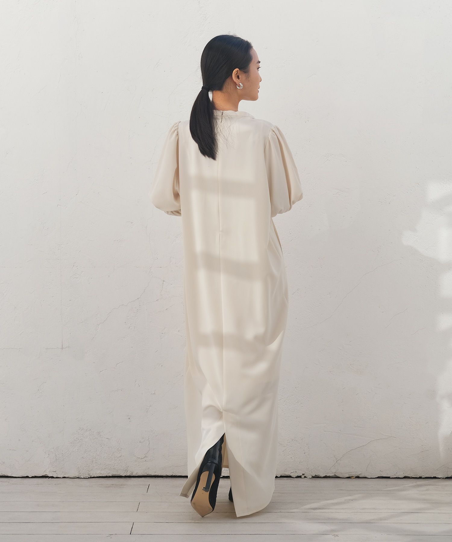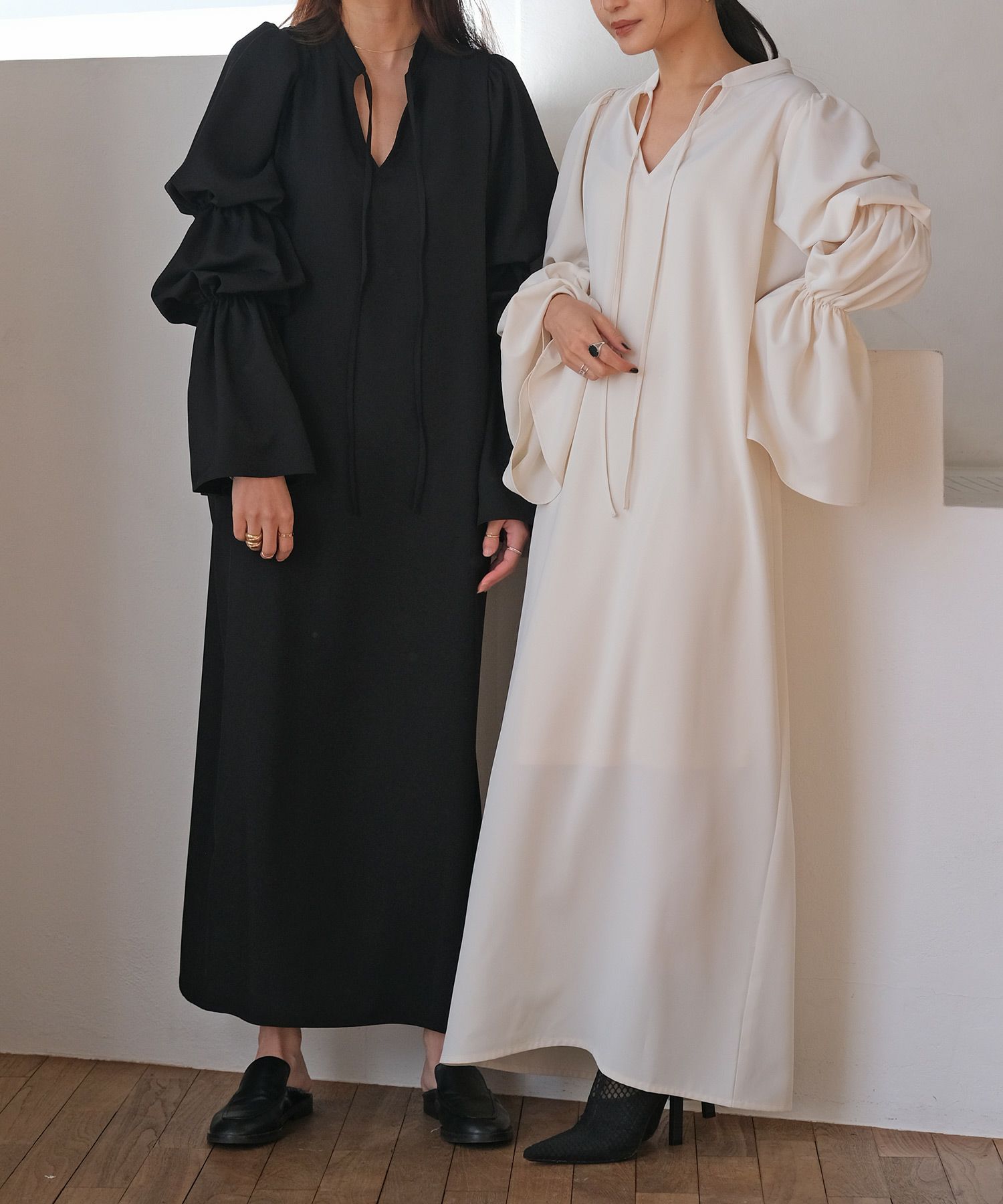 抜け感のある襟元とふんわりと膨らむボリューミーな袖がポイントのロングドレス。