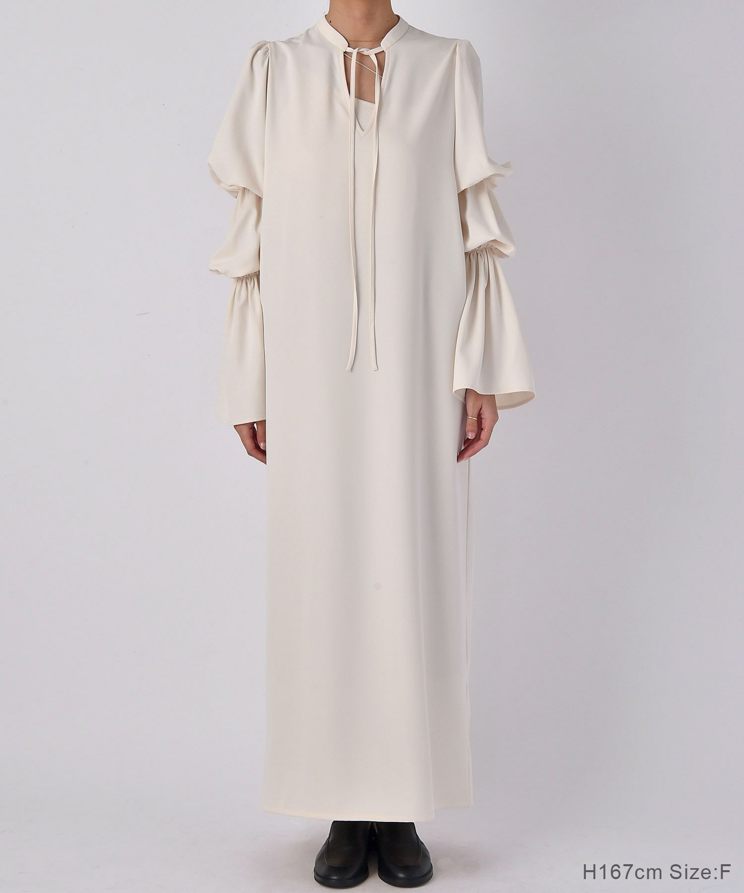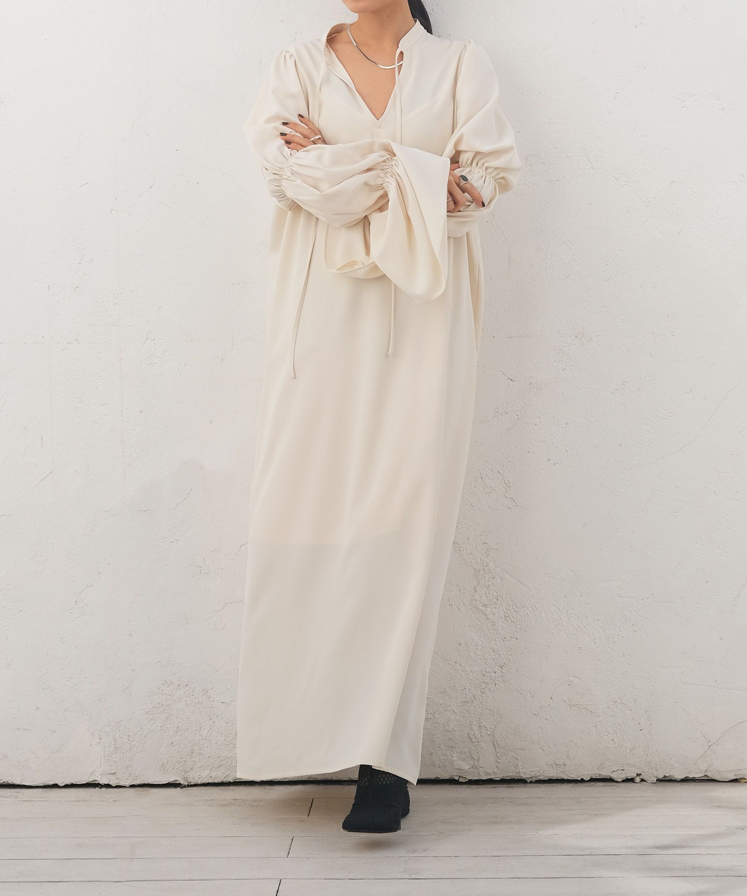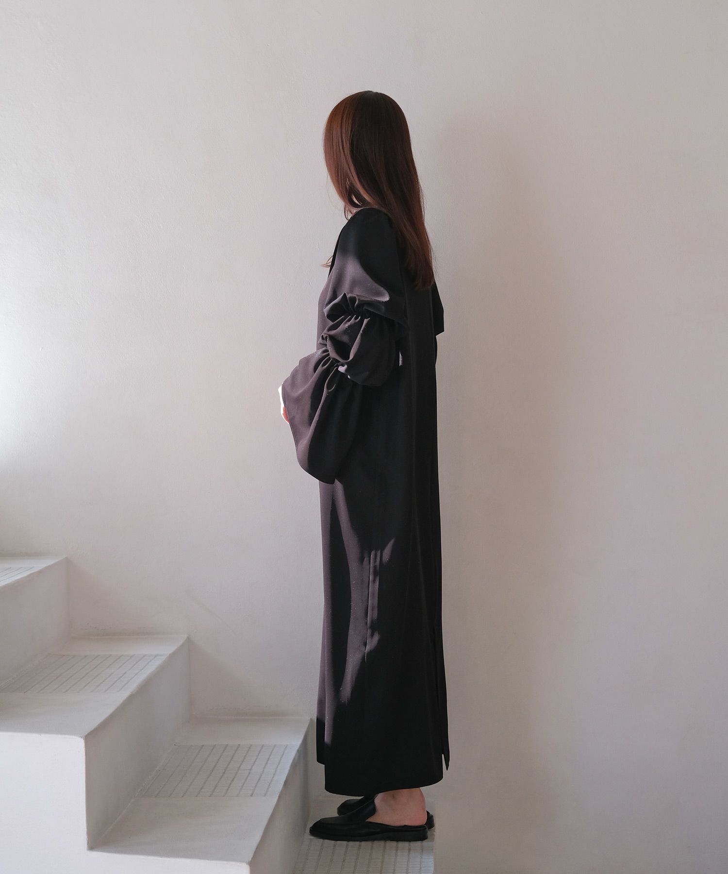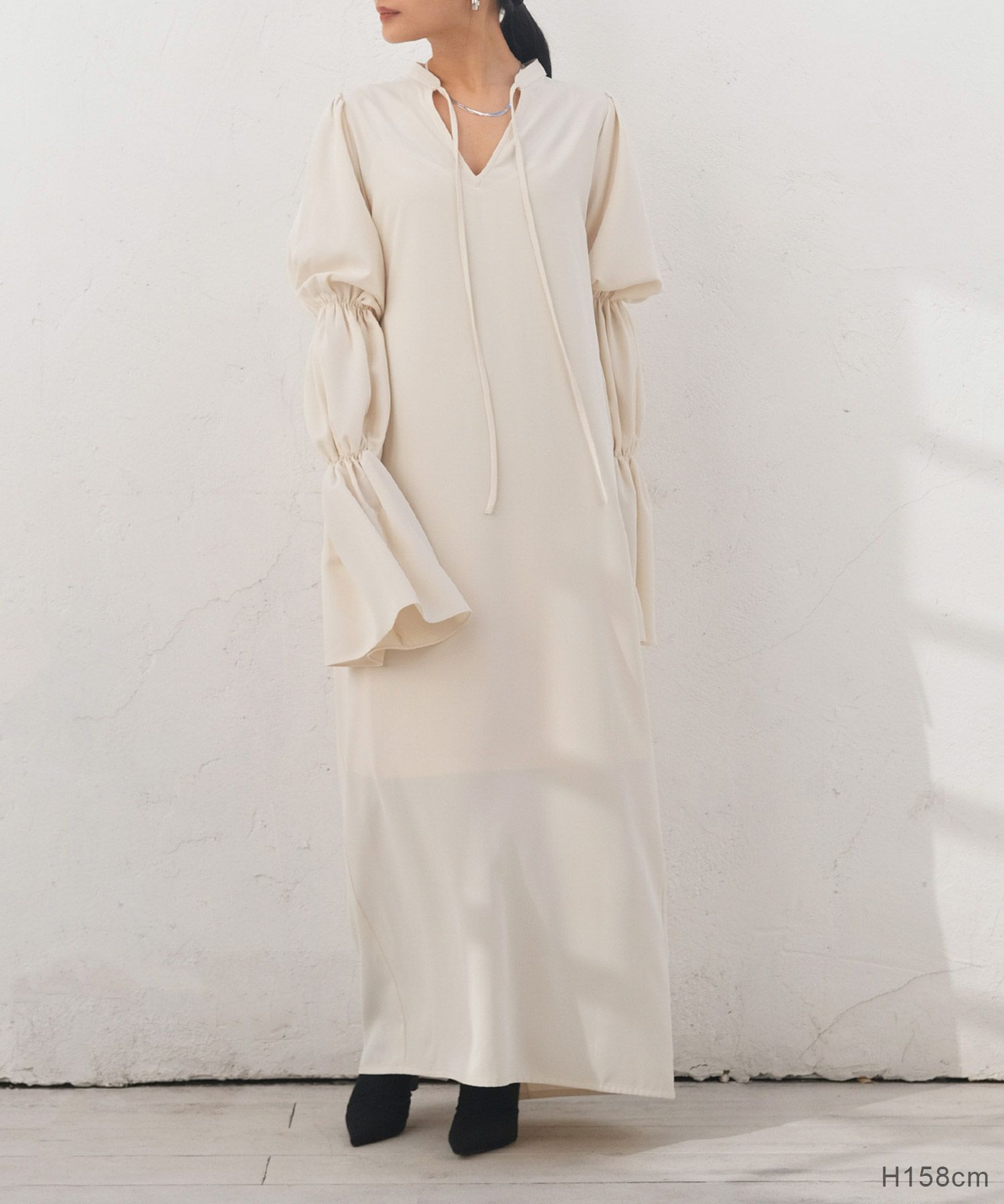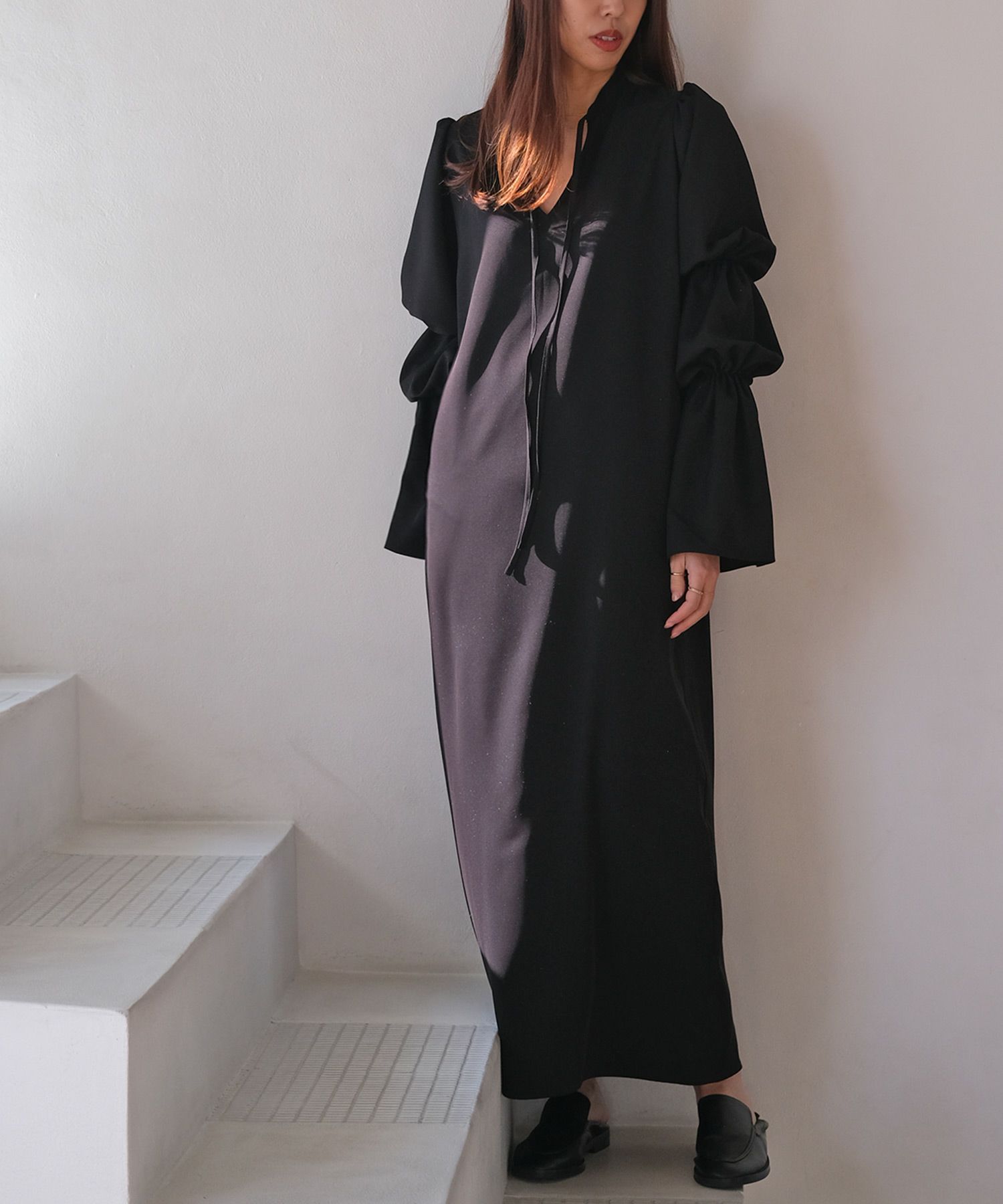 抜け感のある襟元とふんわりと膨らむボリューミーな袖がポイントのロングドレス。