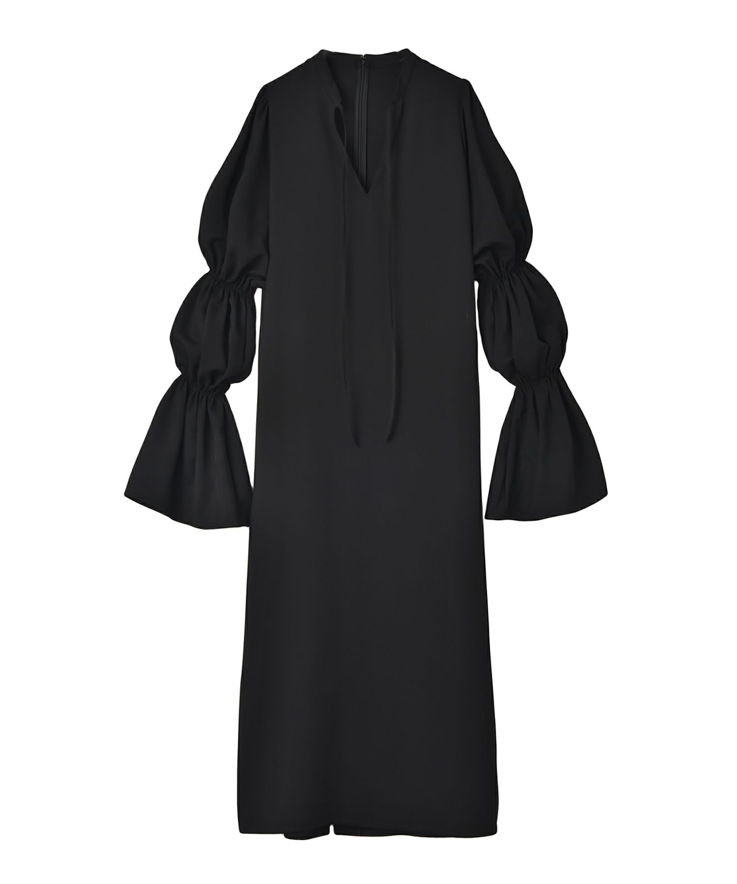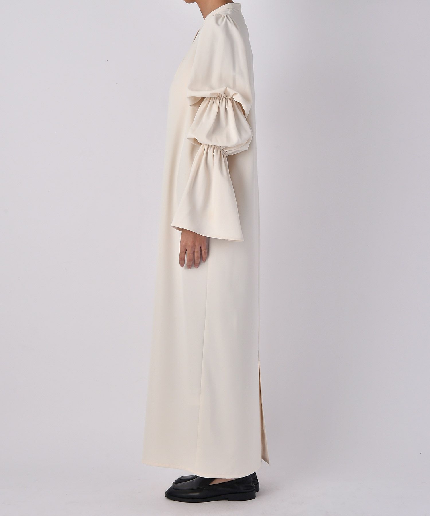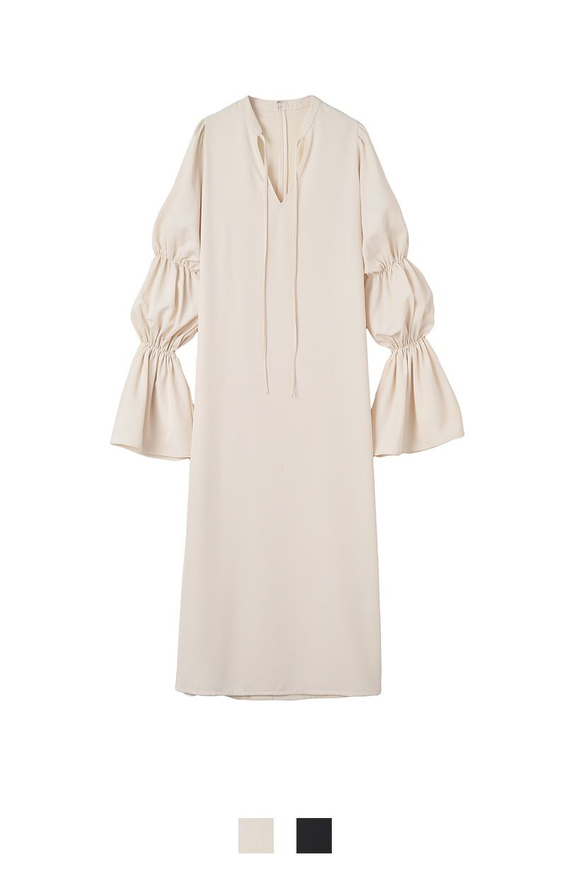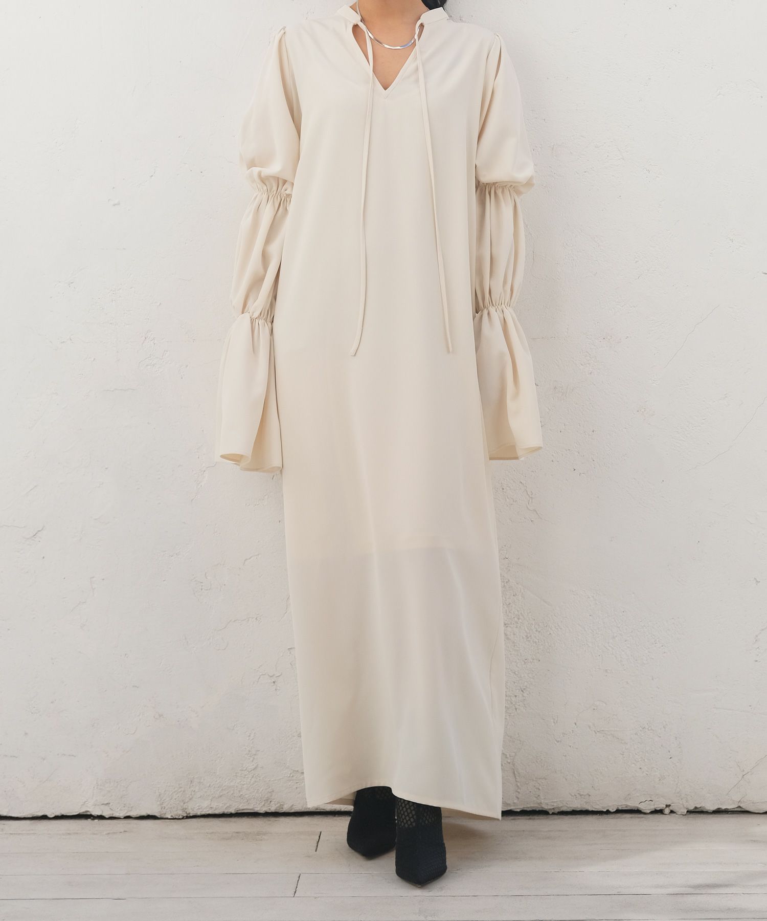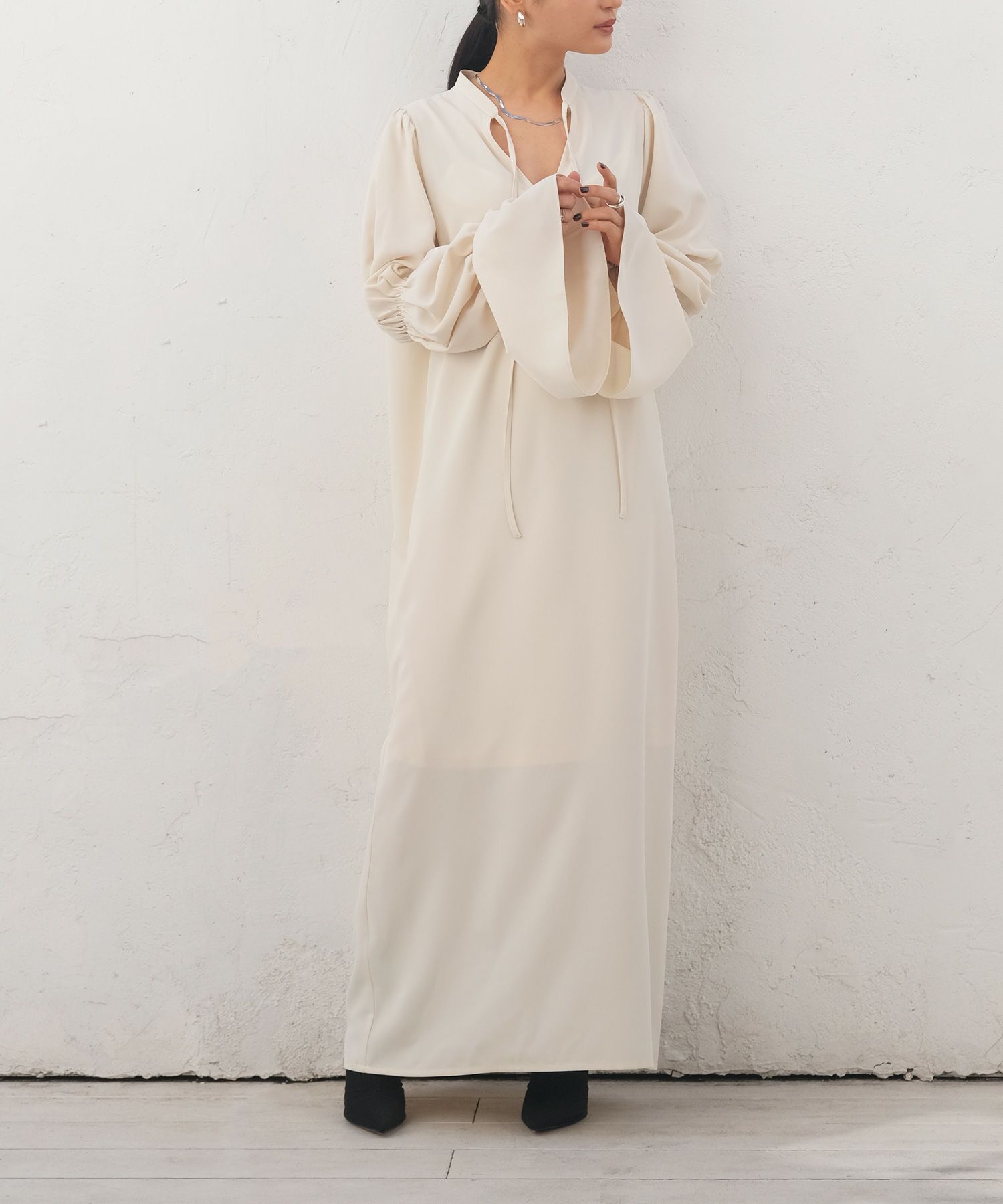 抜け感のある襟元とふんわりと膨らむボリューミーな袖がポイントのロングドレス。