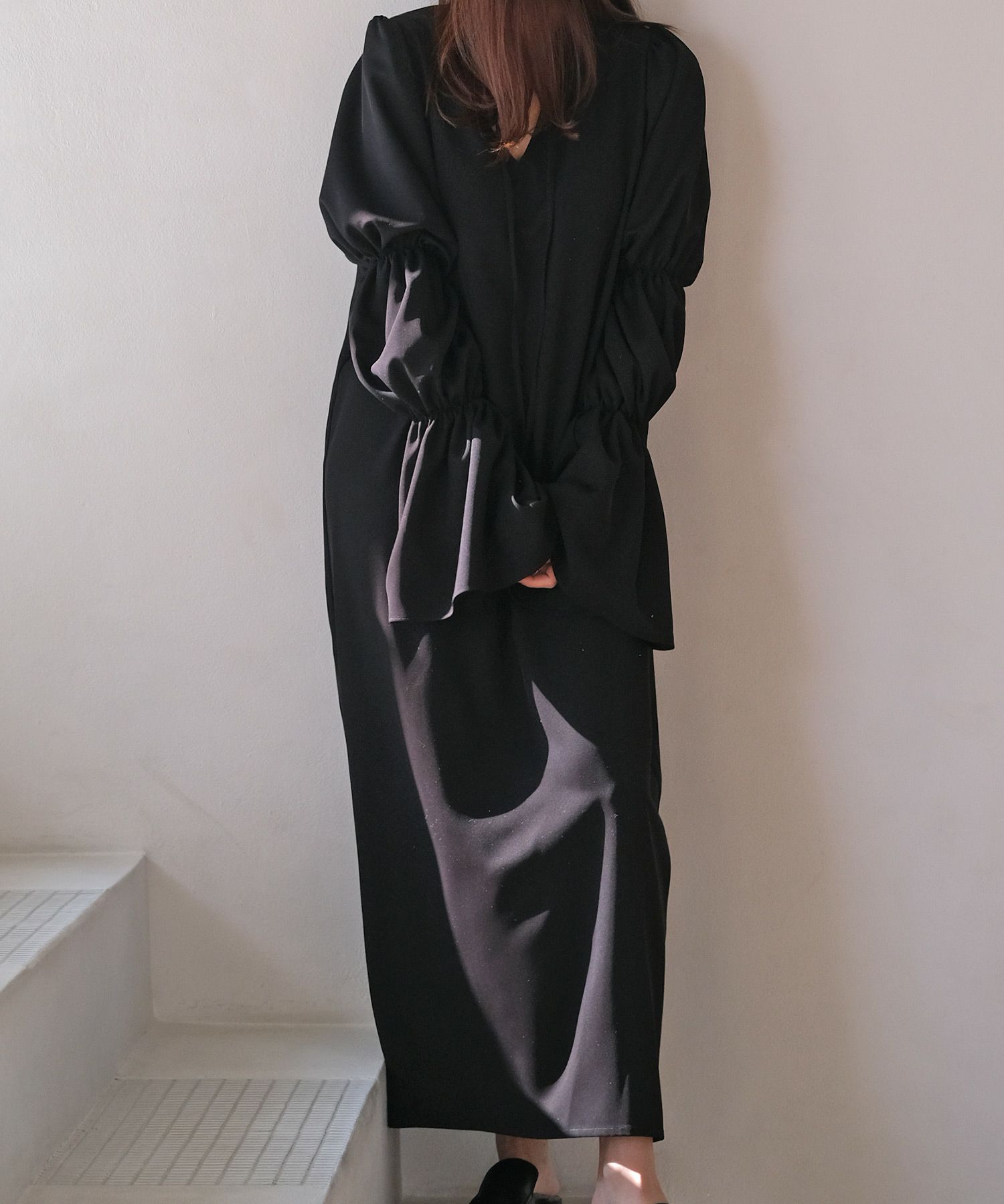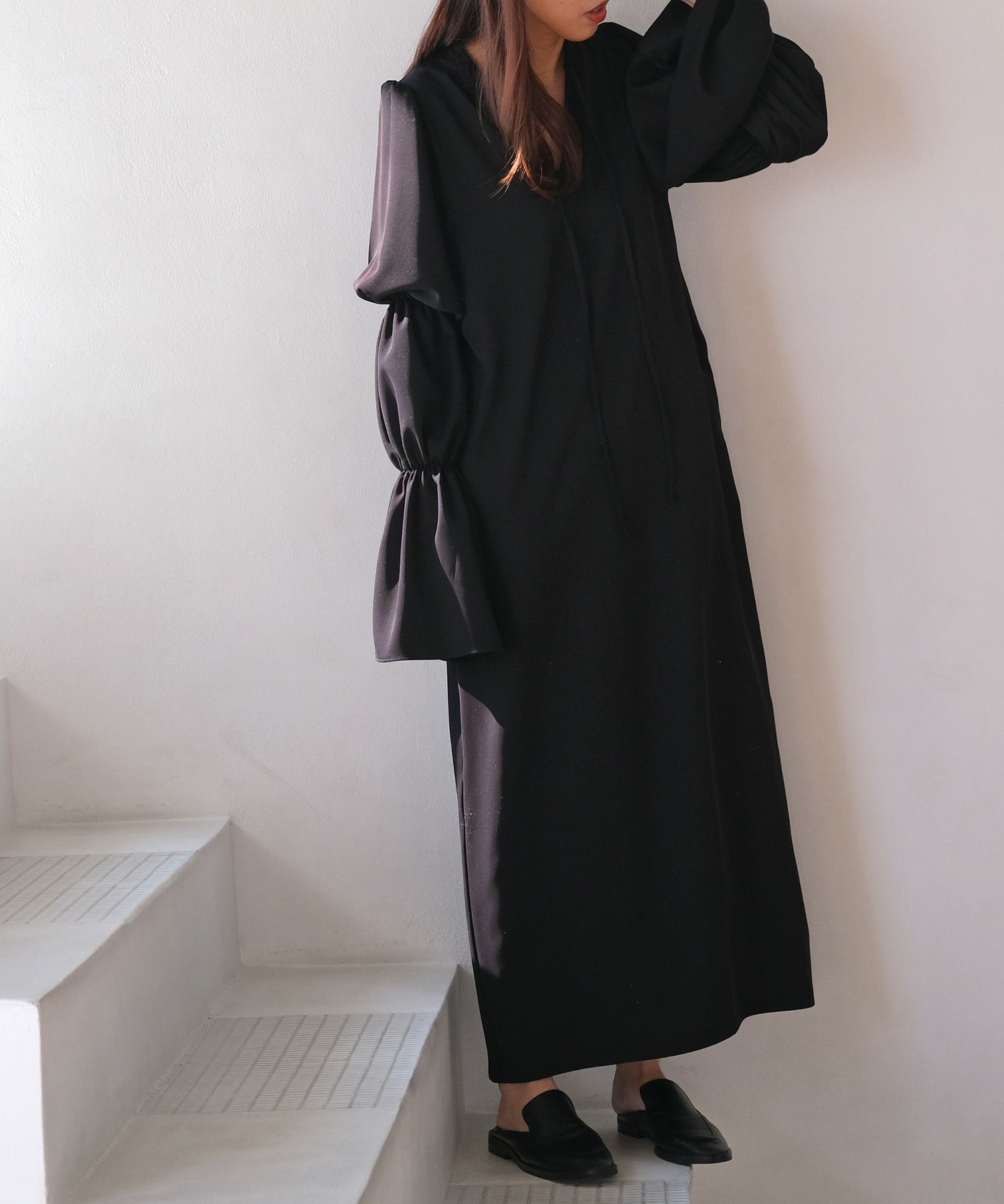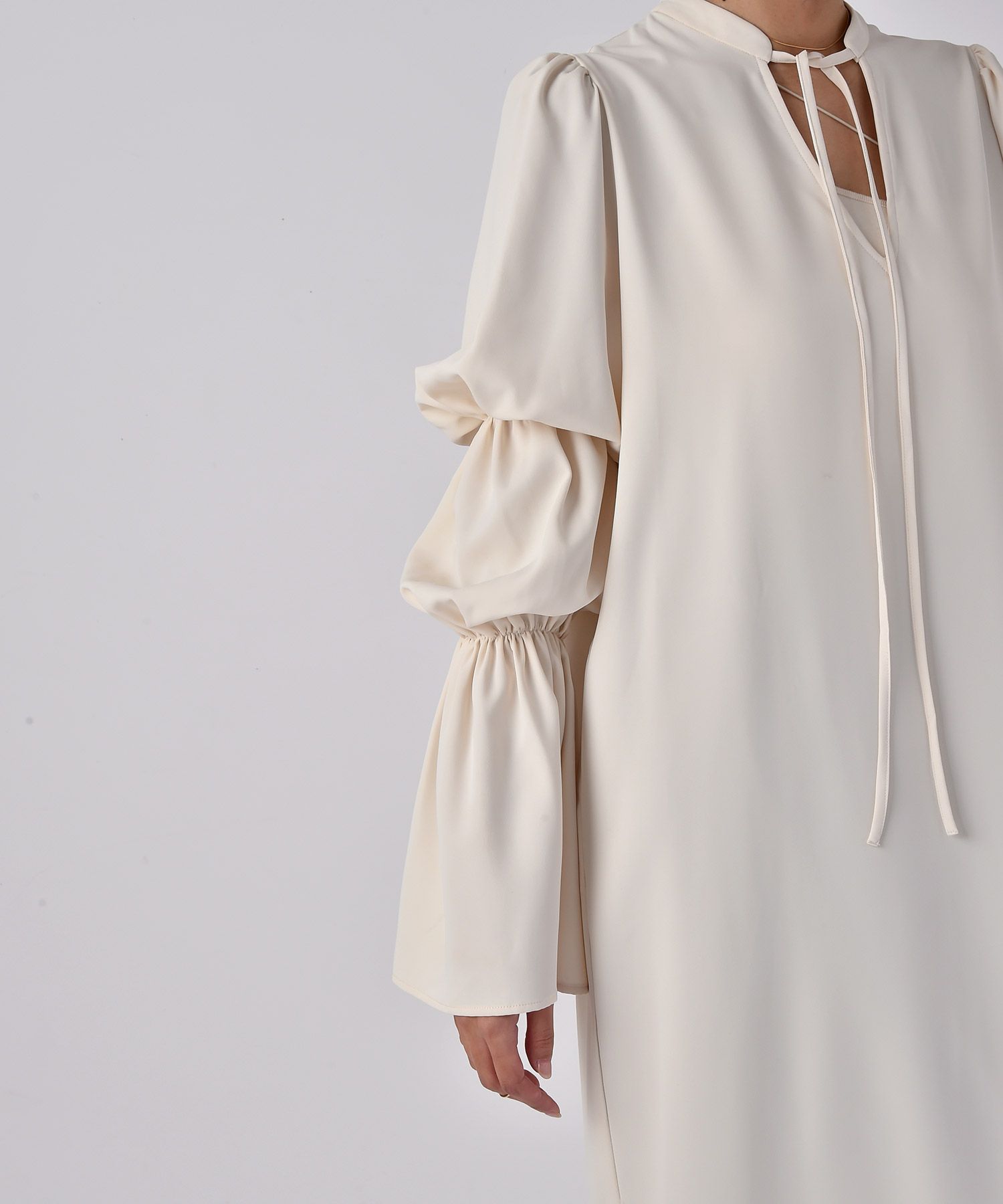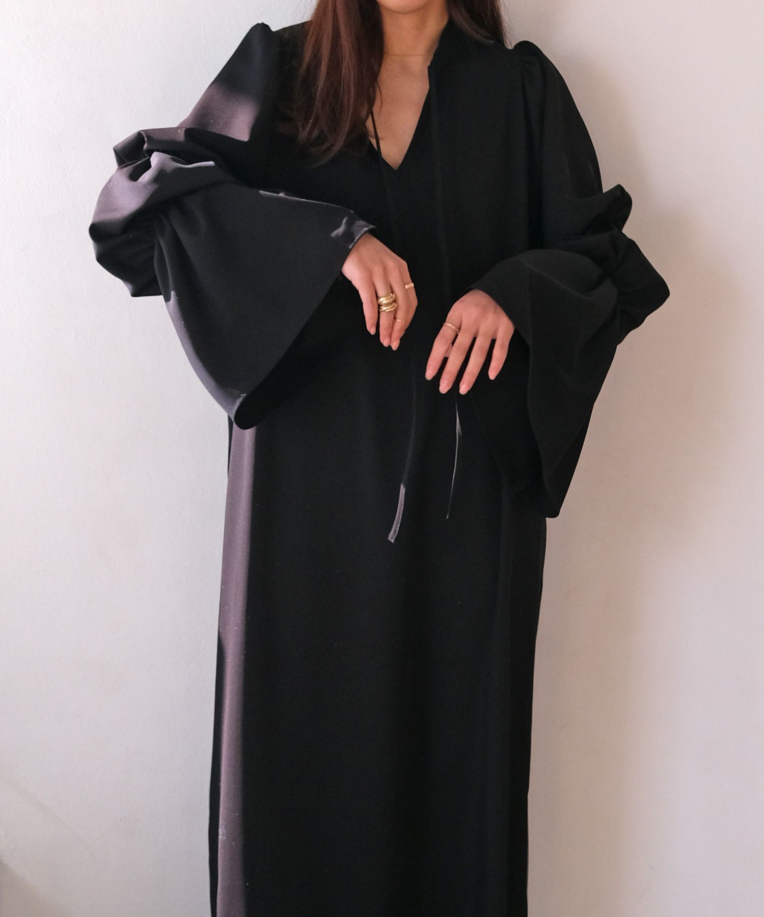 抜け感のある襟元とふんわりと膨らむボリューミーな袖がポイントのロングドレス。