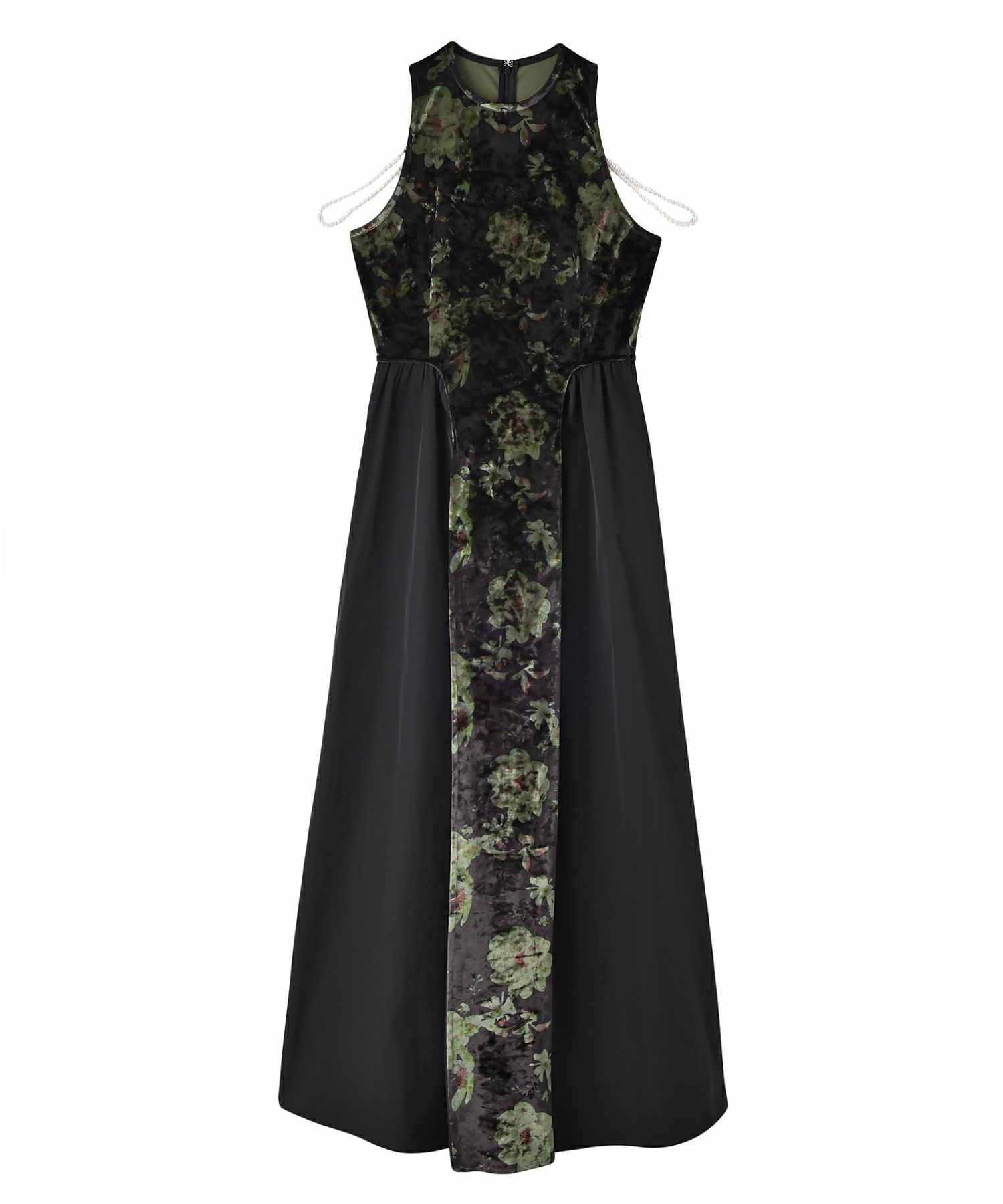 パールストラップと異素材の組み合わせが特別感のあるマキシワンピース。