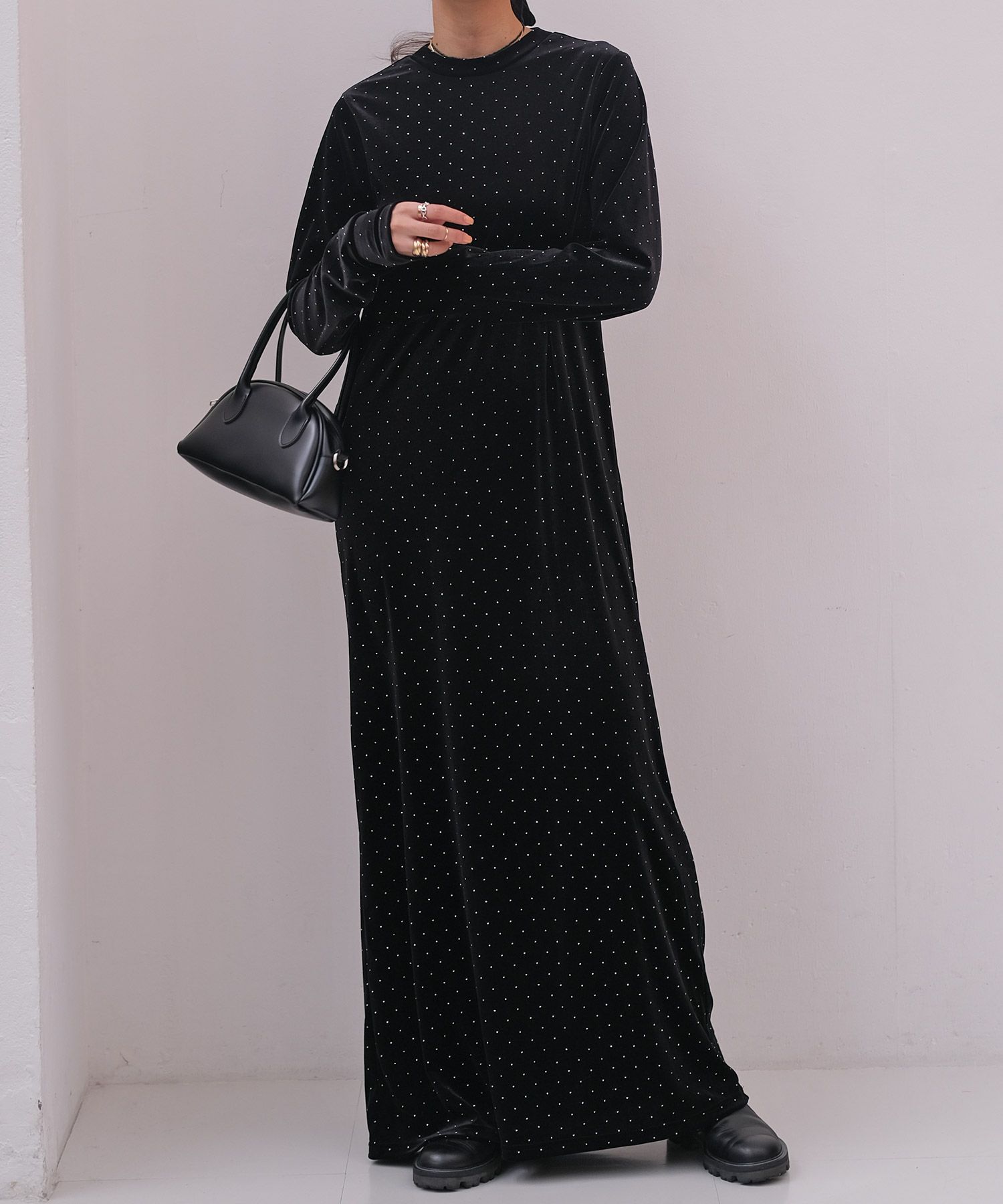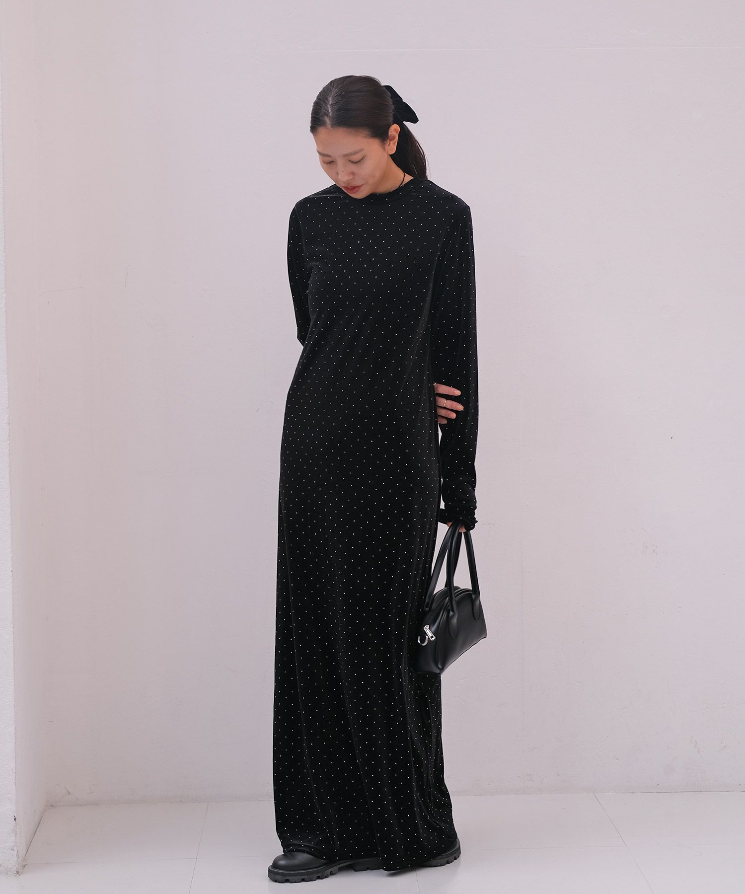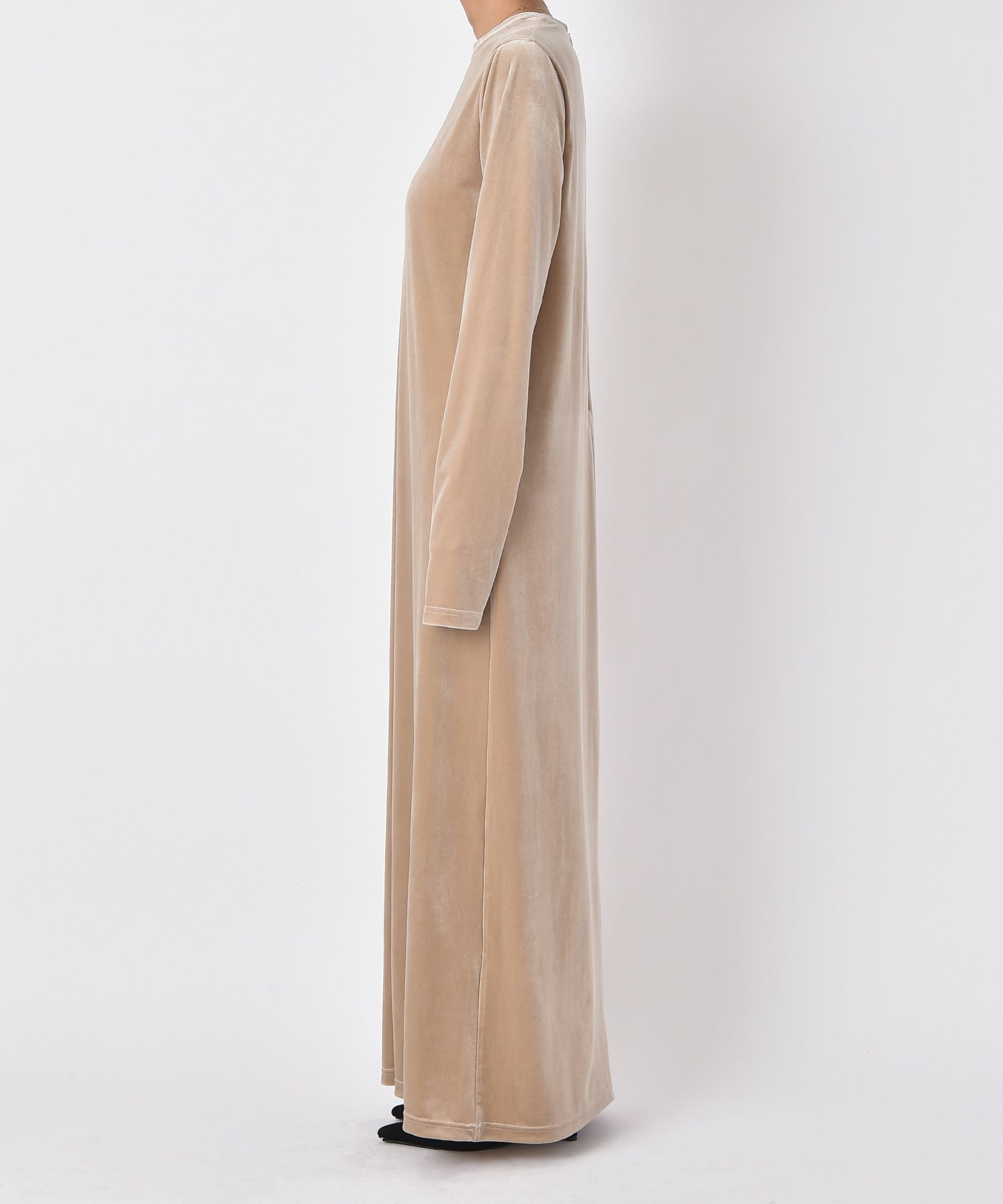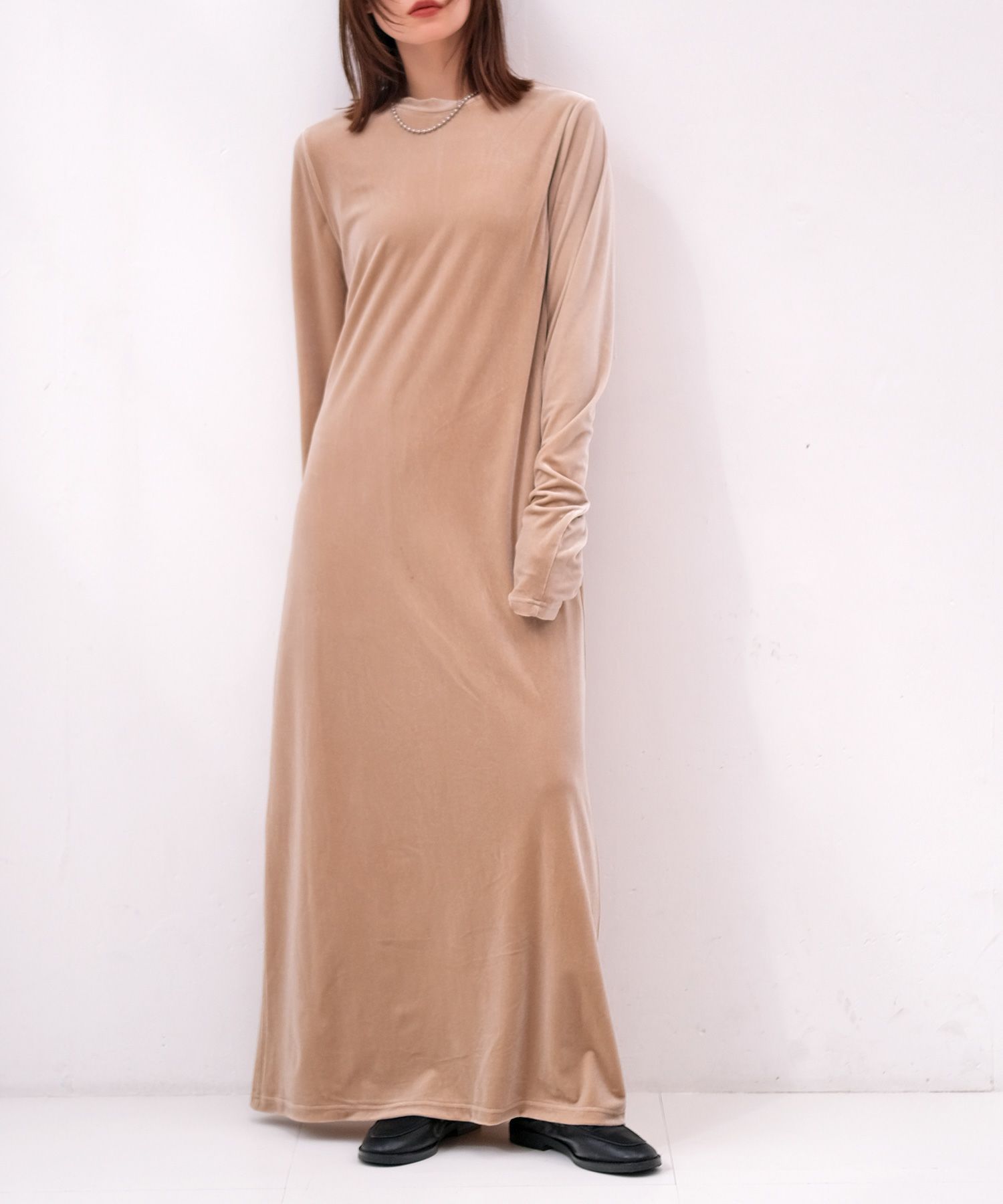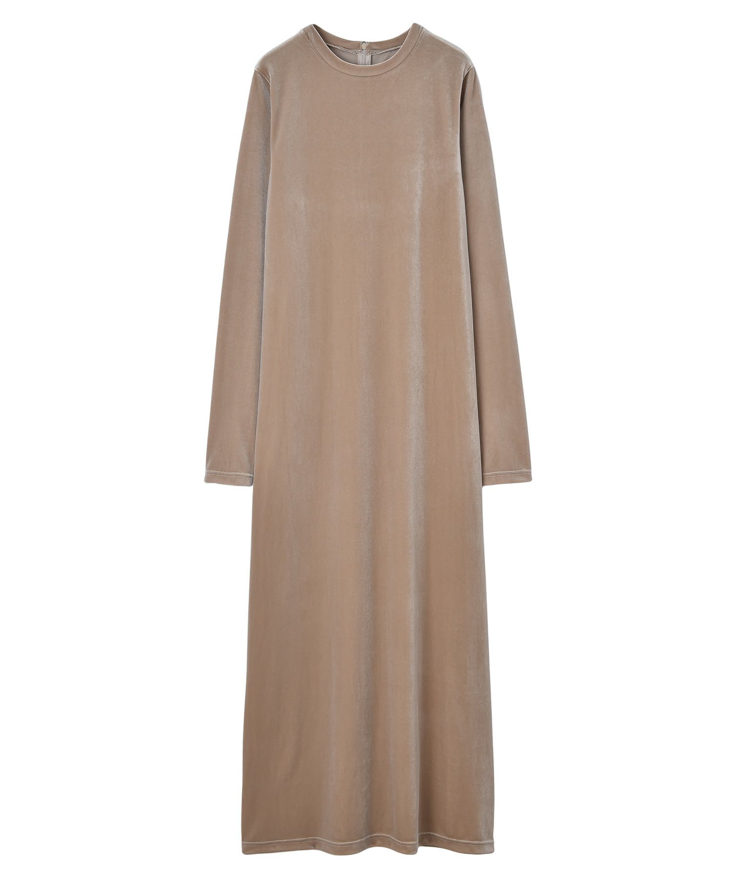 シーズンムード漂うベロア素材を使用したミニマルデザインのワンピース。