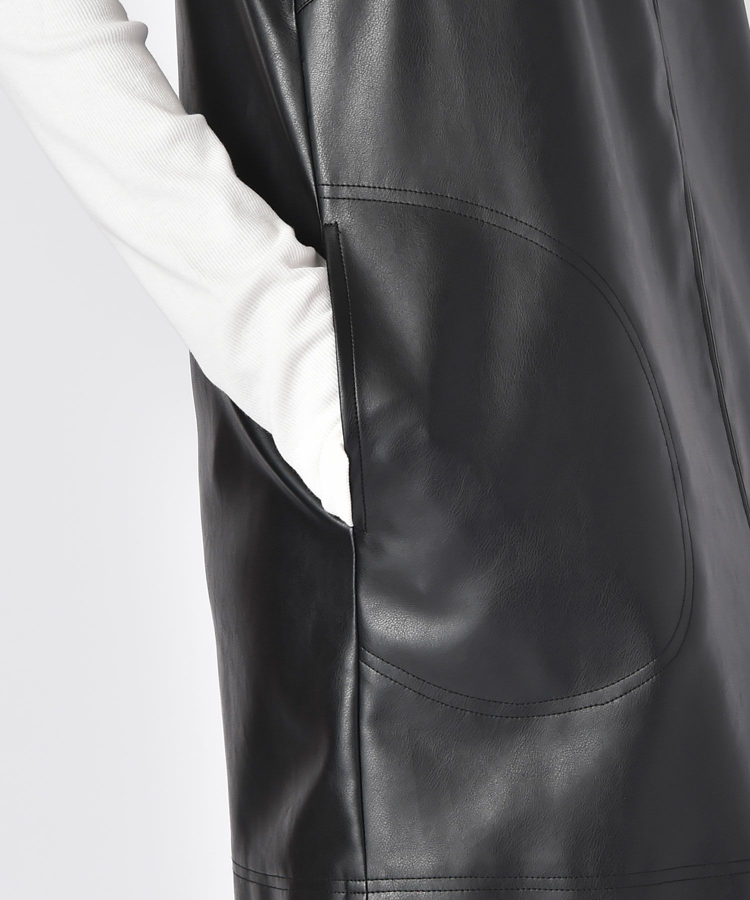 胸元やポケットなど各所にアウトステッチを施すことでフェイクレザーの固さの中にメリハリをプラス。