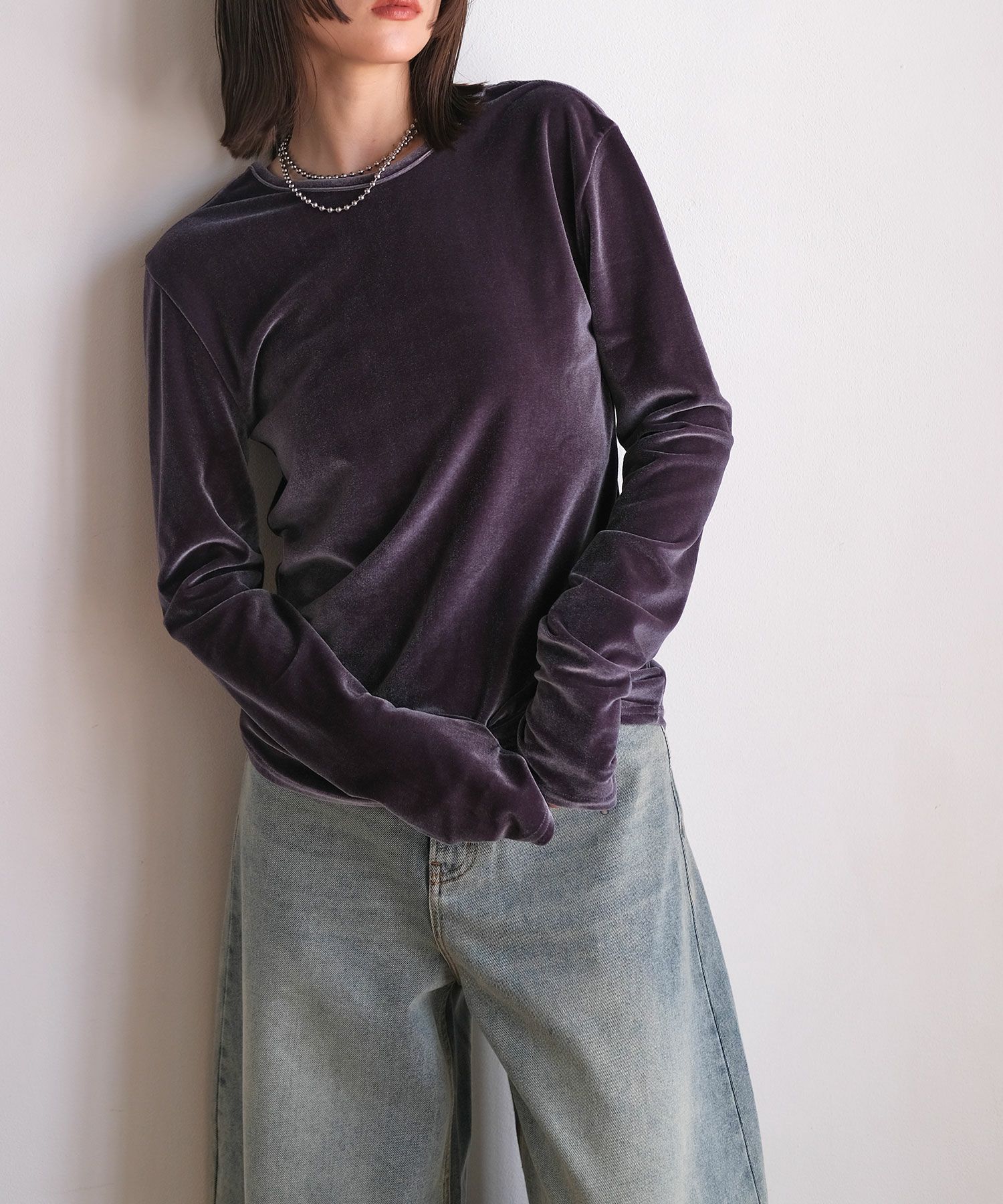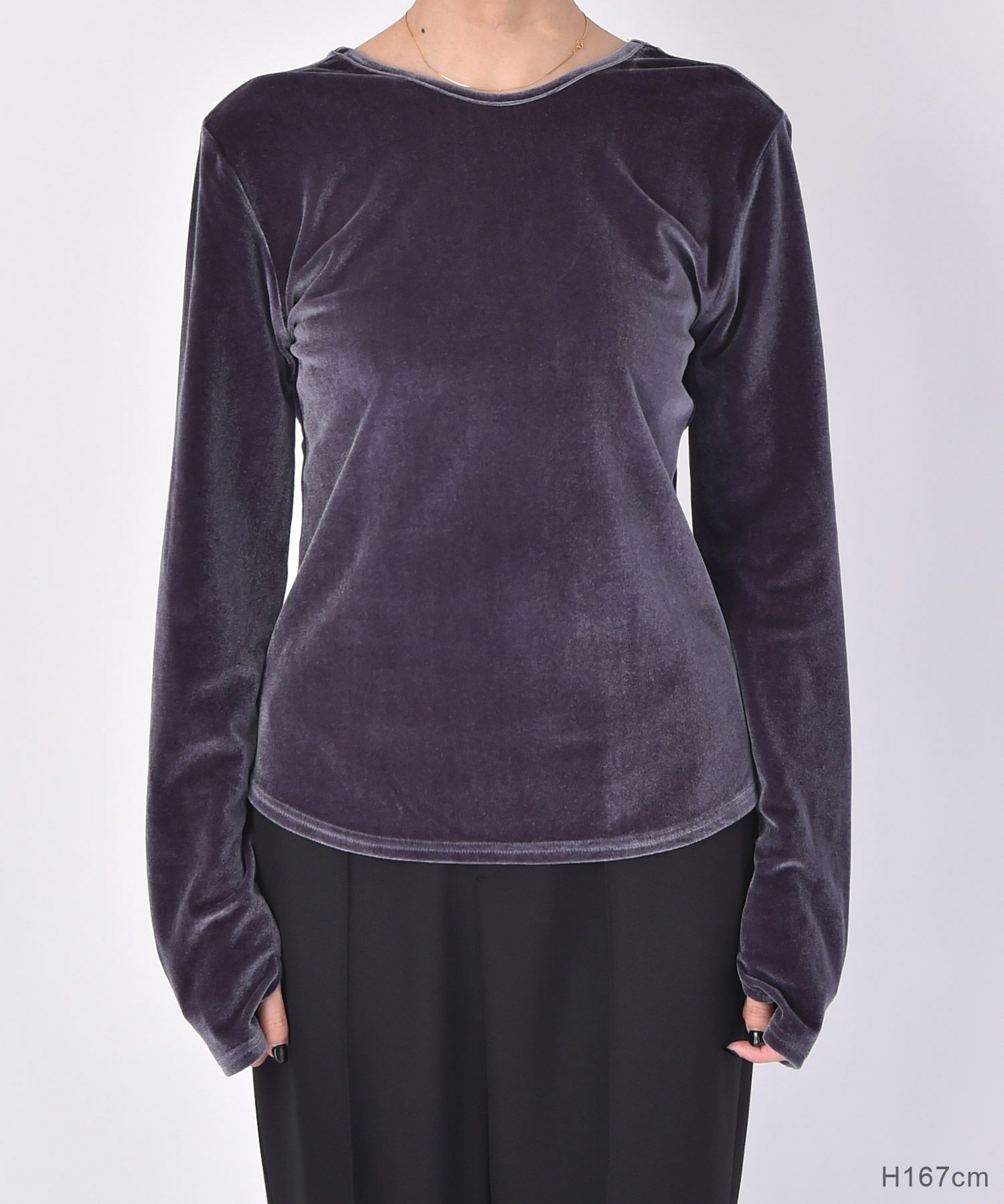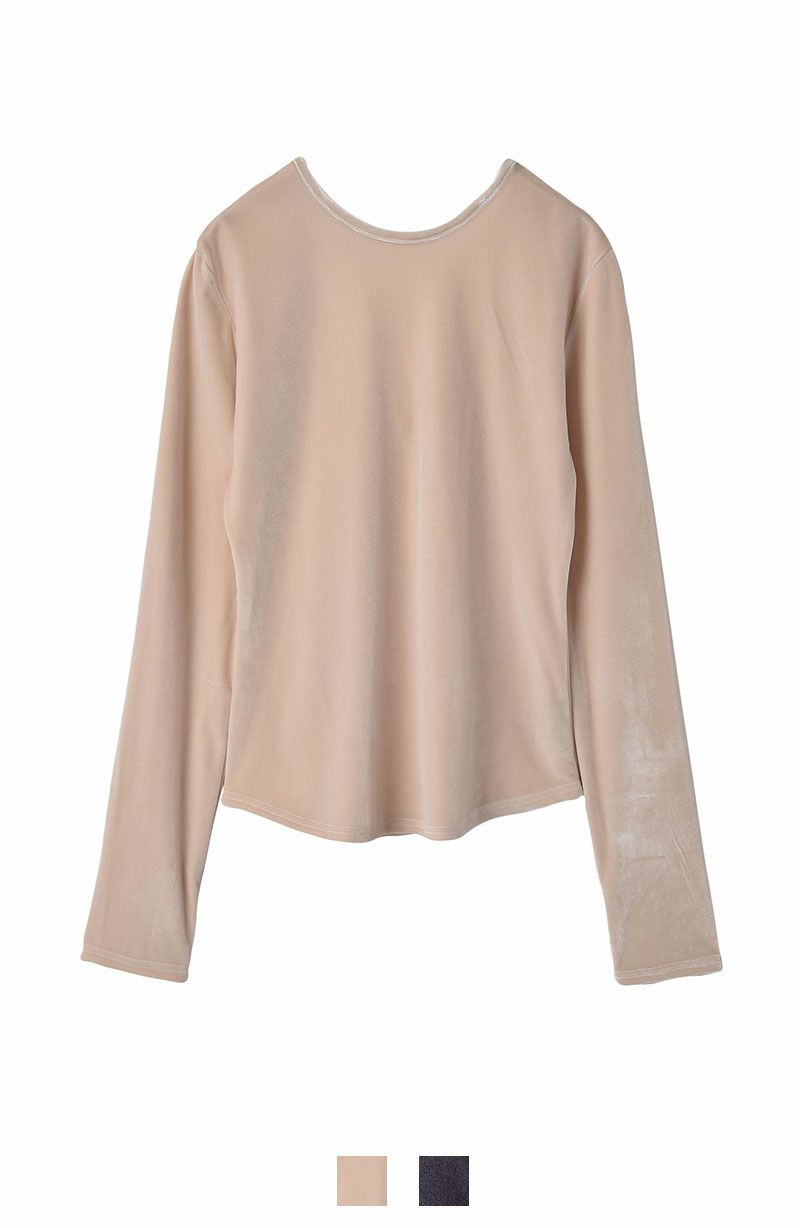 上品な光沢のあるベロアと大胆に開いたバックデザインが女性らしさを引き立てるプルオーバー