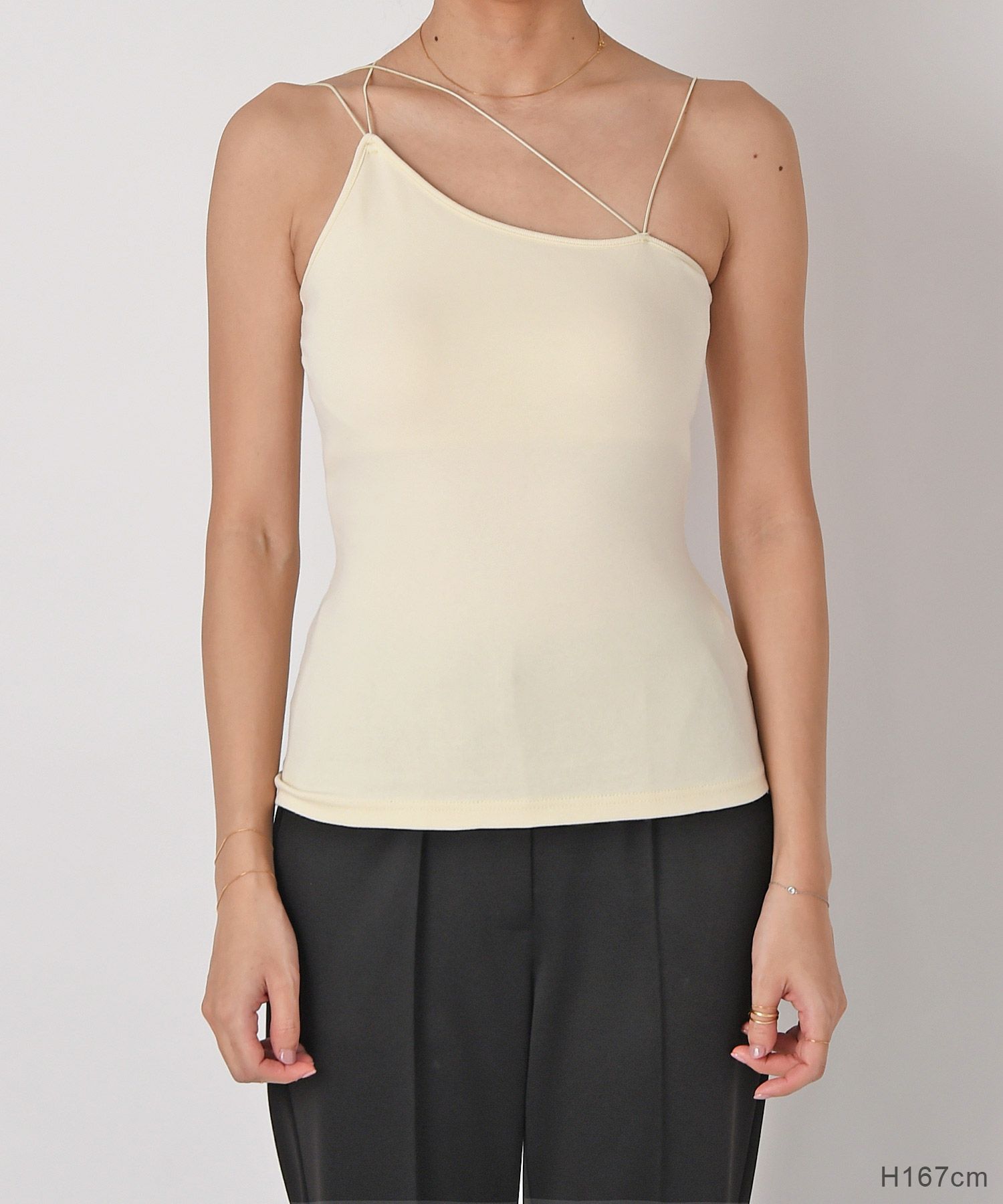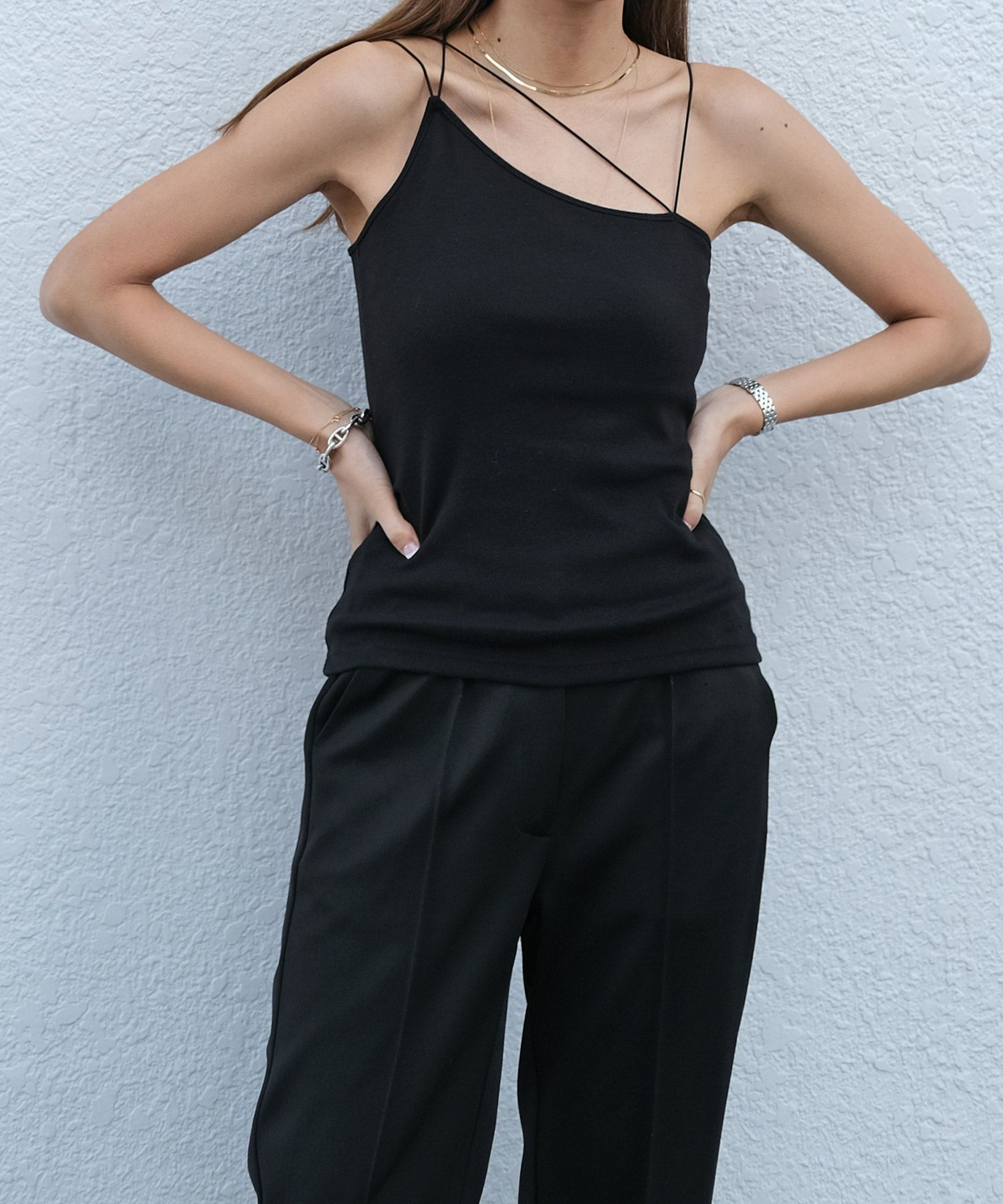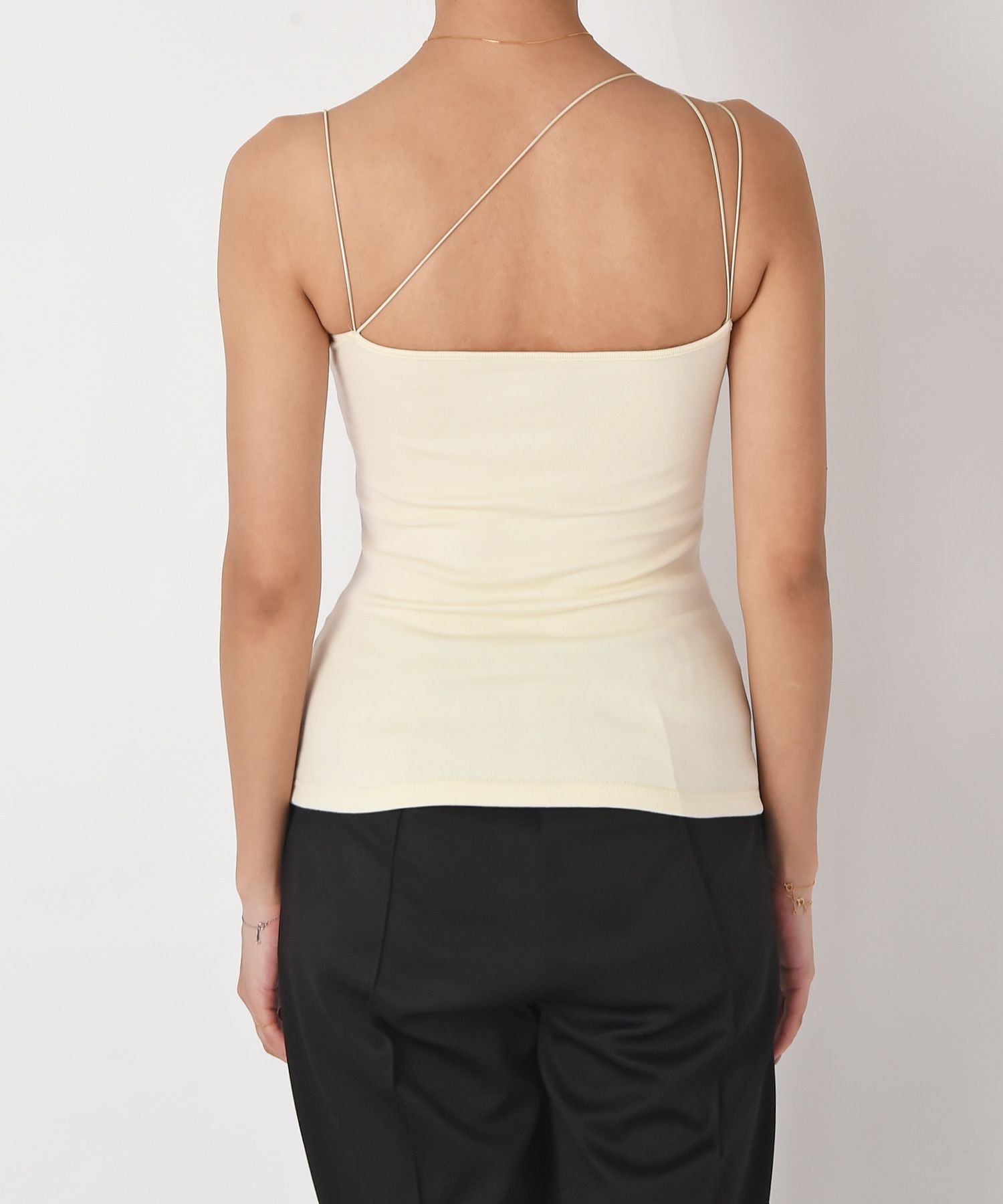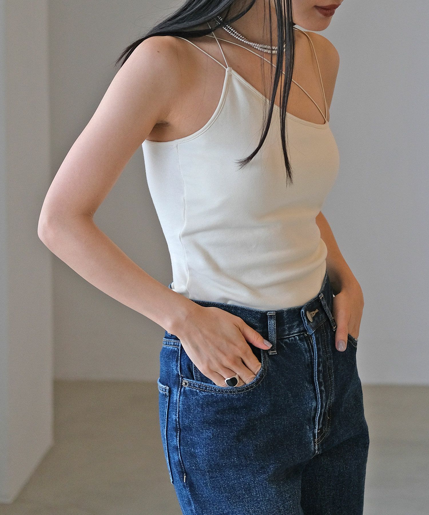 一枚で着ていただくのはもちろん、首元があいたトップスや、バックオープントップスのインナーとして、ランダムストラップを見せ、アクセントをプラスしたスタイリングもおすすめです。