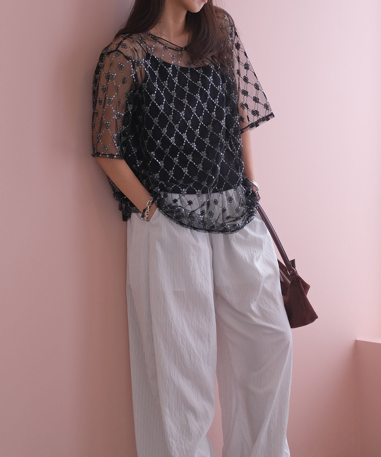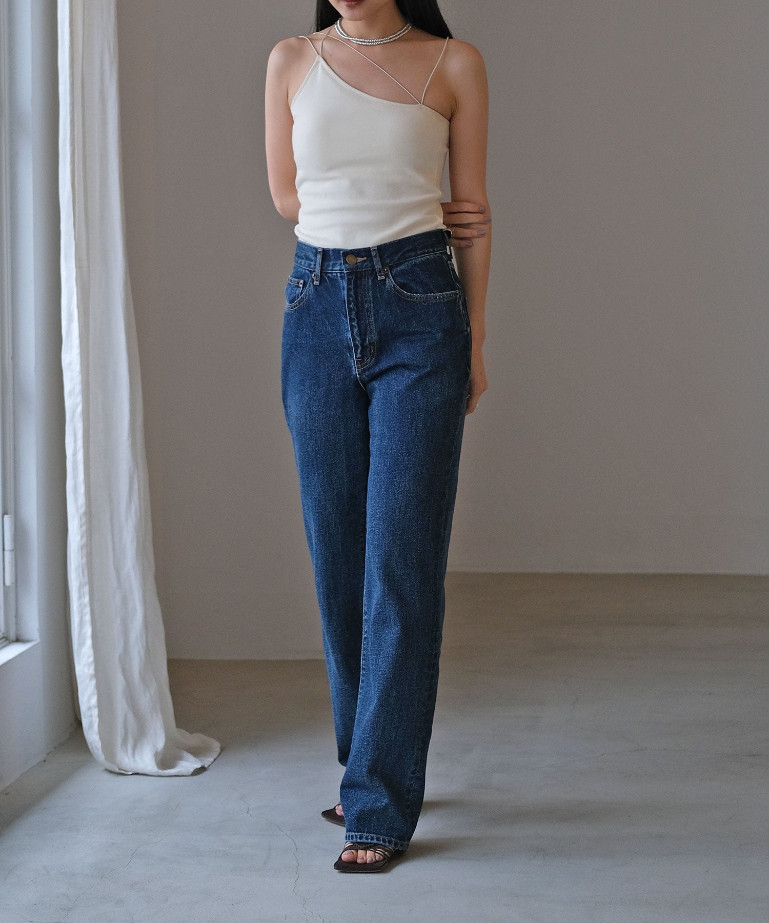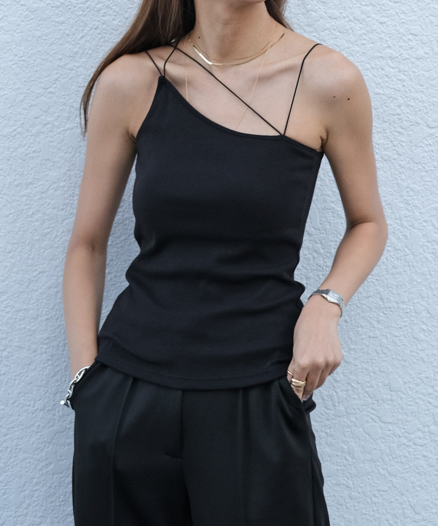 一枚で着ていただくのはもちろん、首元があいたトップスや、バックオープントップスのインナーとして、ランダムストラップを見せ、アクセントをプラスしたスタイリングもおすすめです。