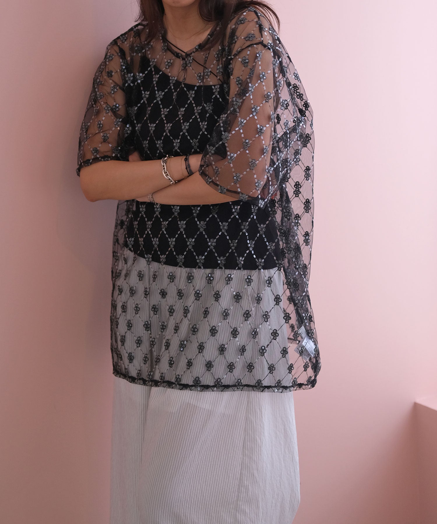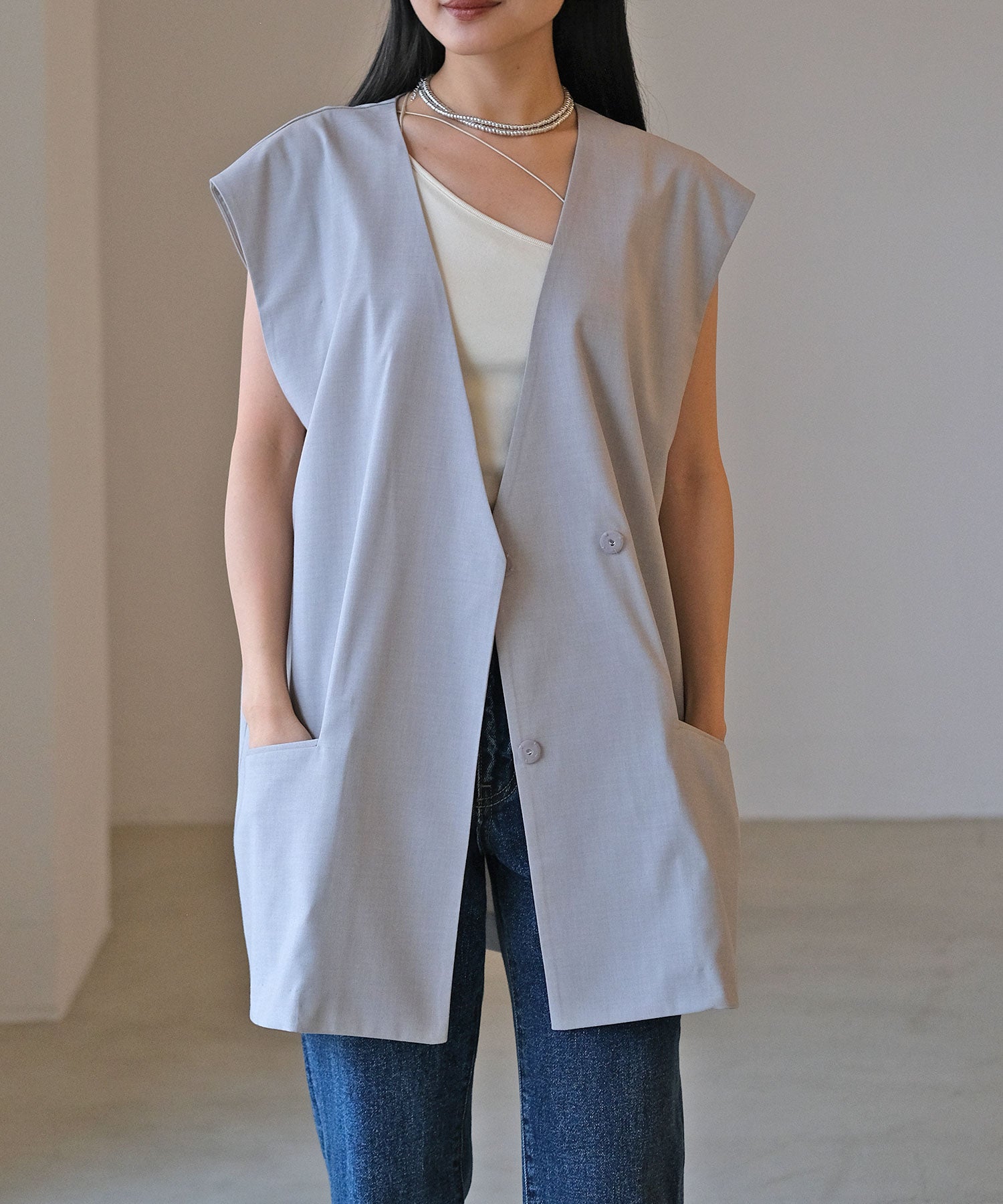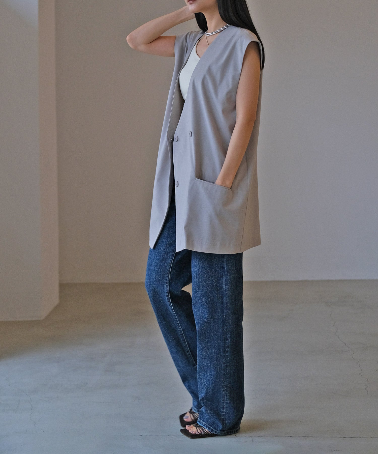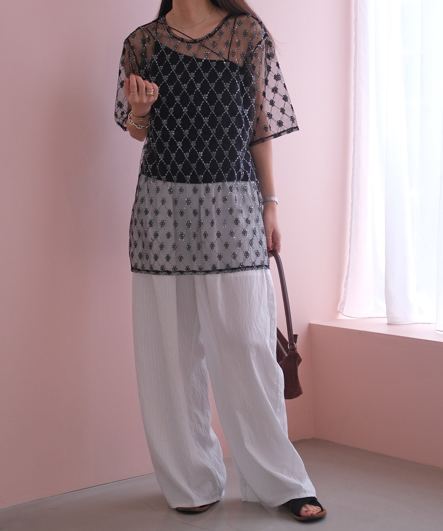 一枚で着ていただくのはもちろん、首元があいたトップスや、バックオープントップスのインナーとして、ランダムストラップを見せ、アクセントをプラスしたスタイリングもおすすめです。