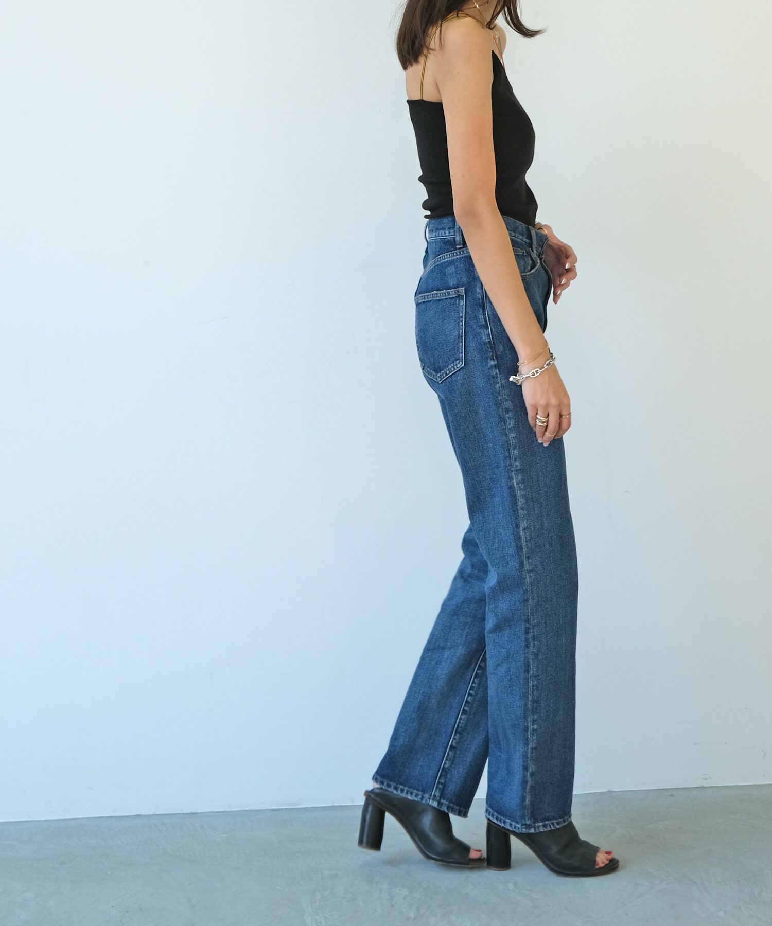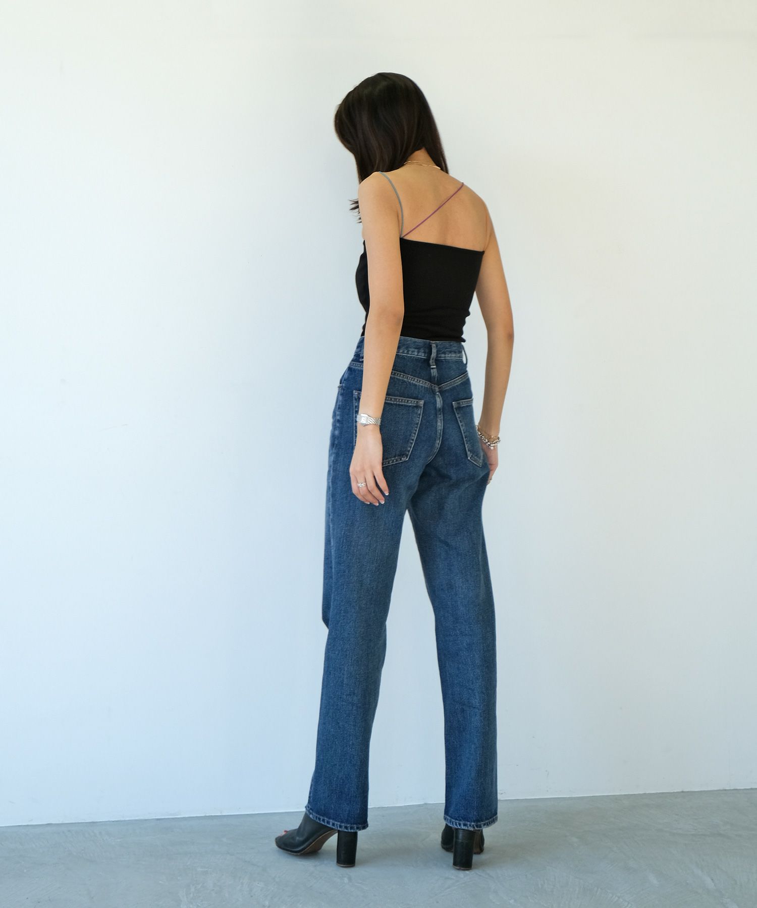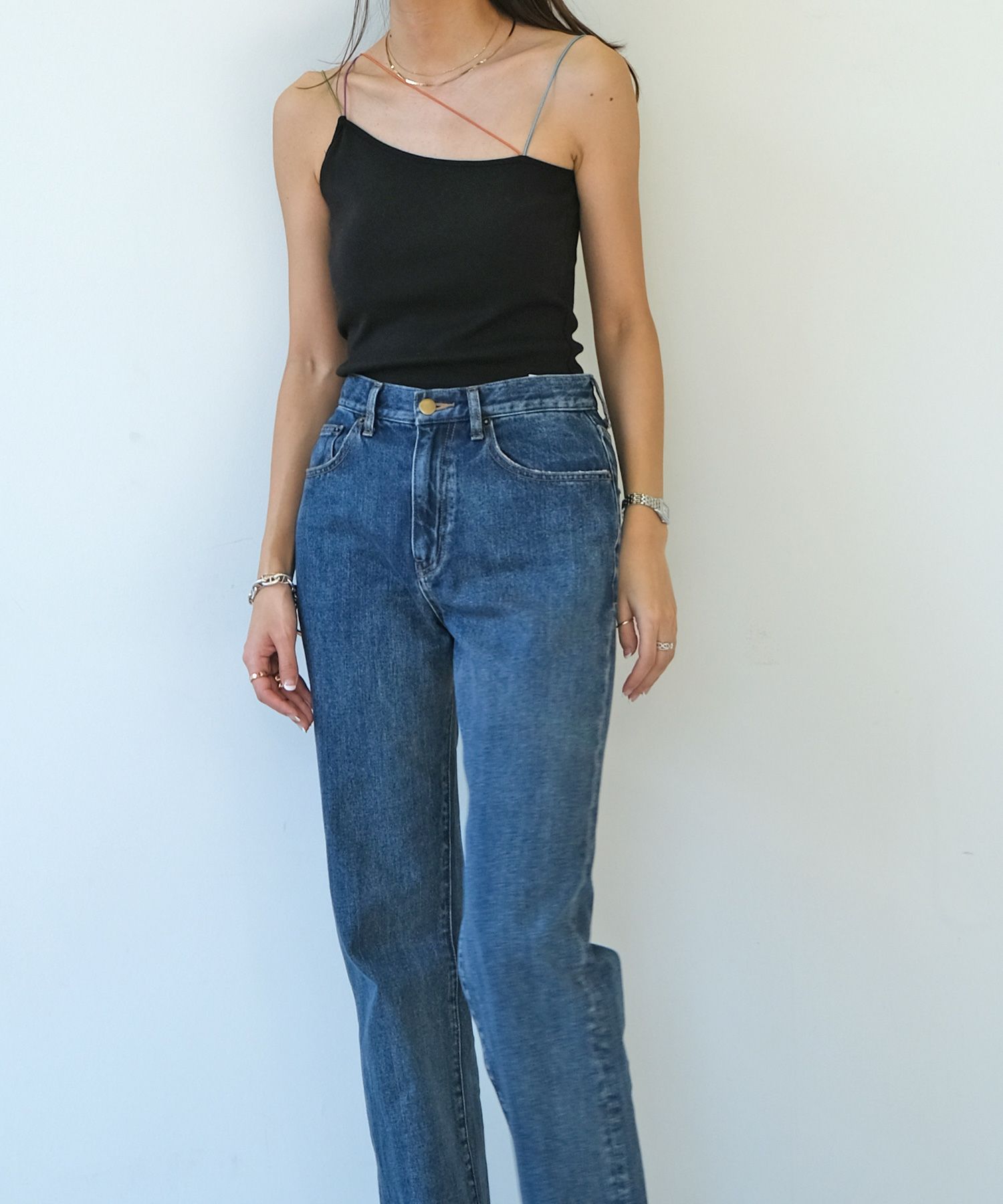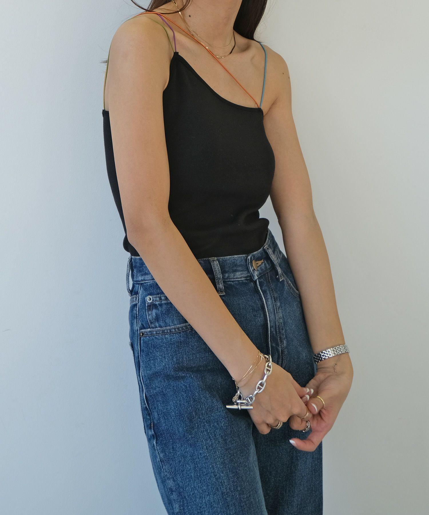 一枚で着ていただくのはもちろん、首元があいたトップスや、バックオープントップスのインナーとしてカラーストラップを見せるスタイリングもおすすめ。