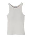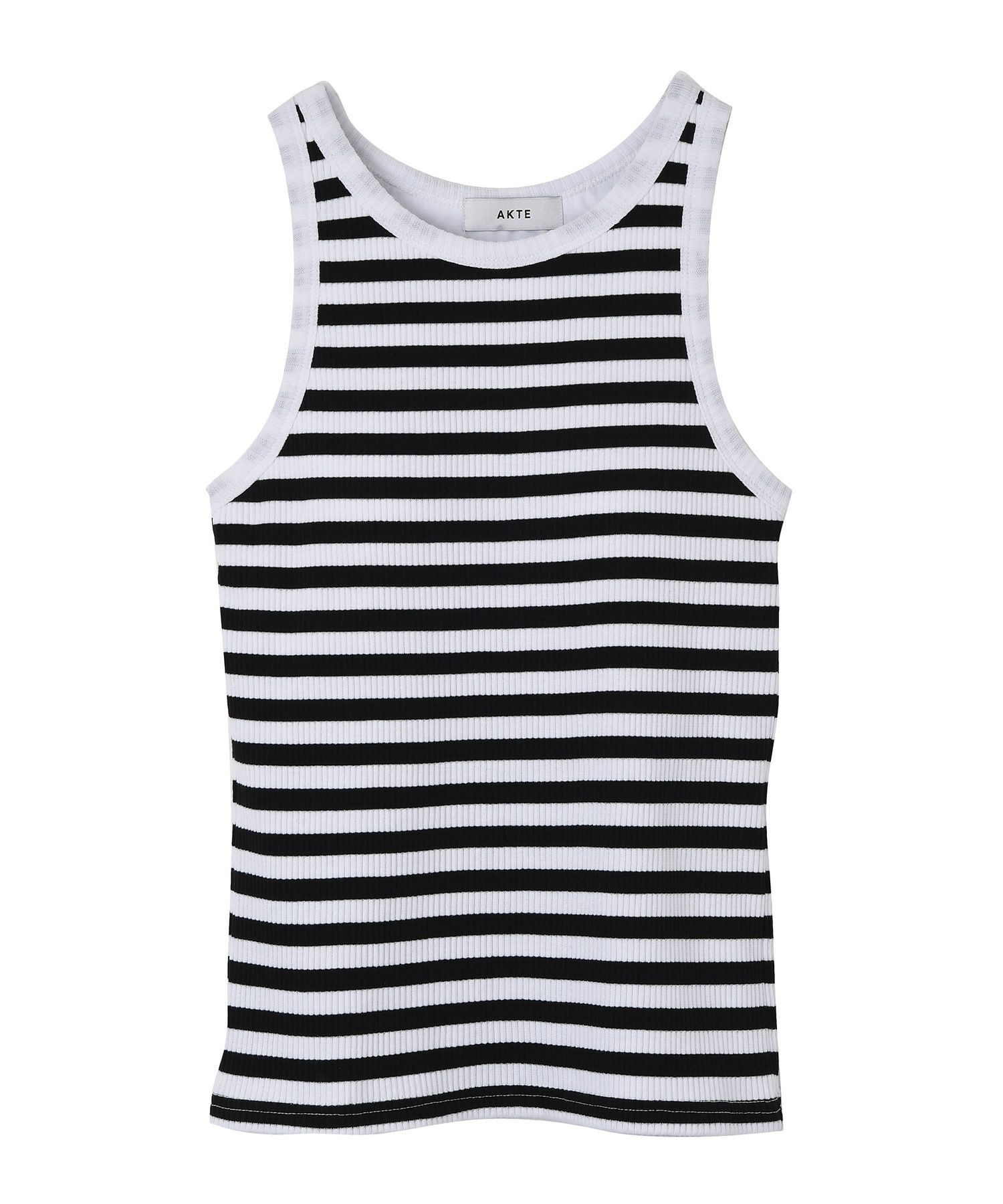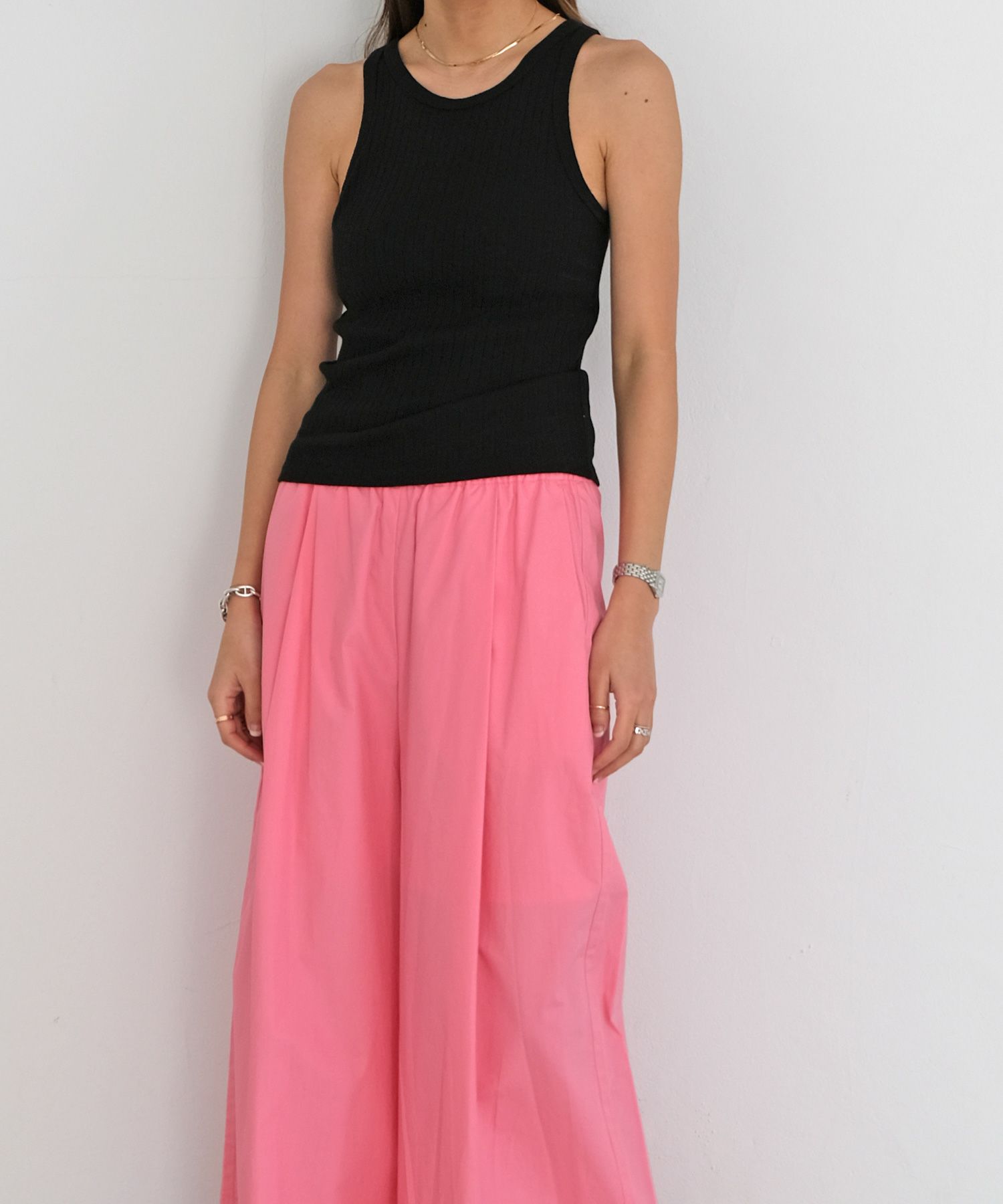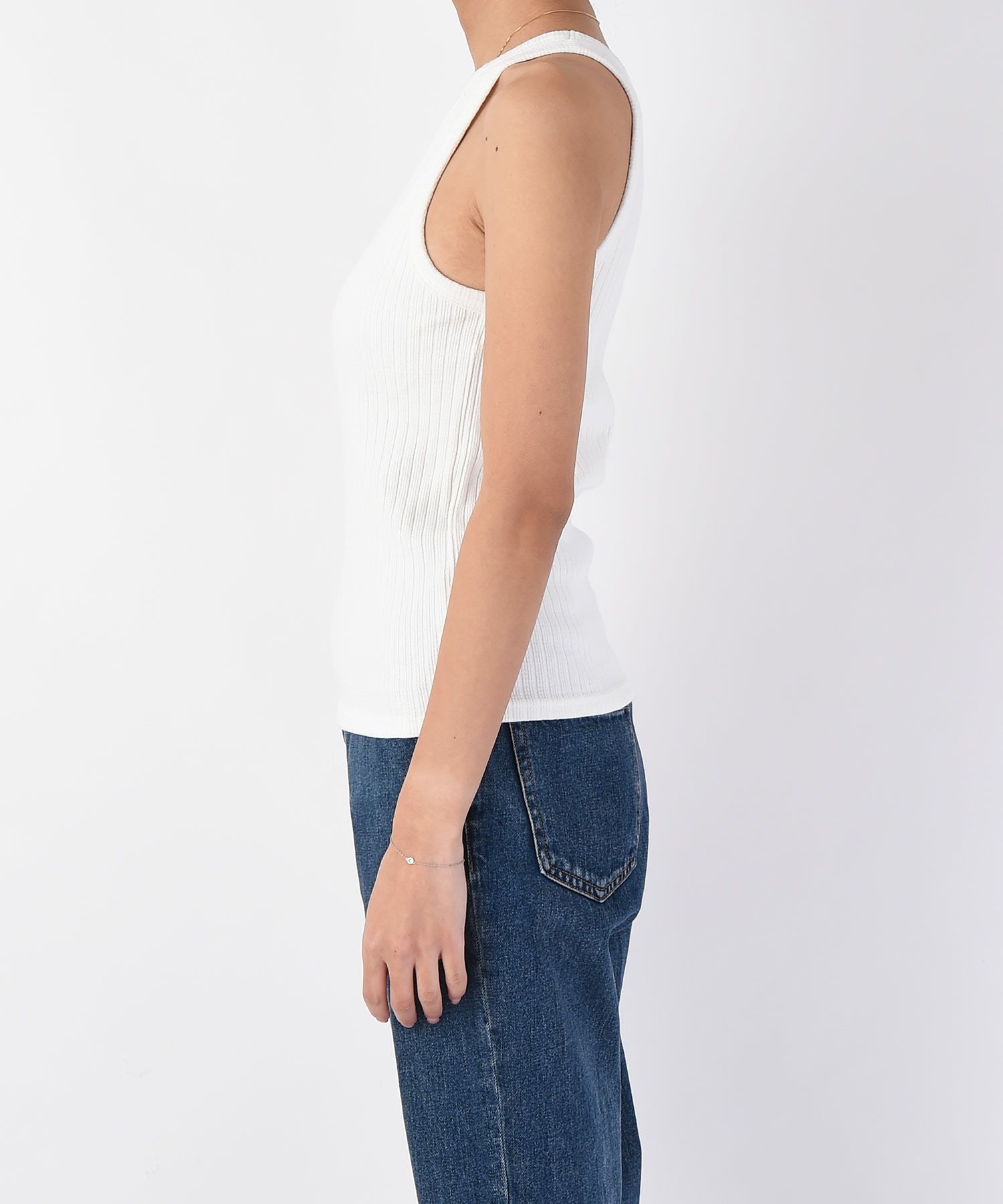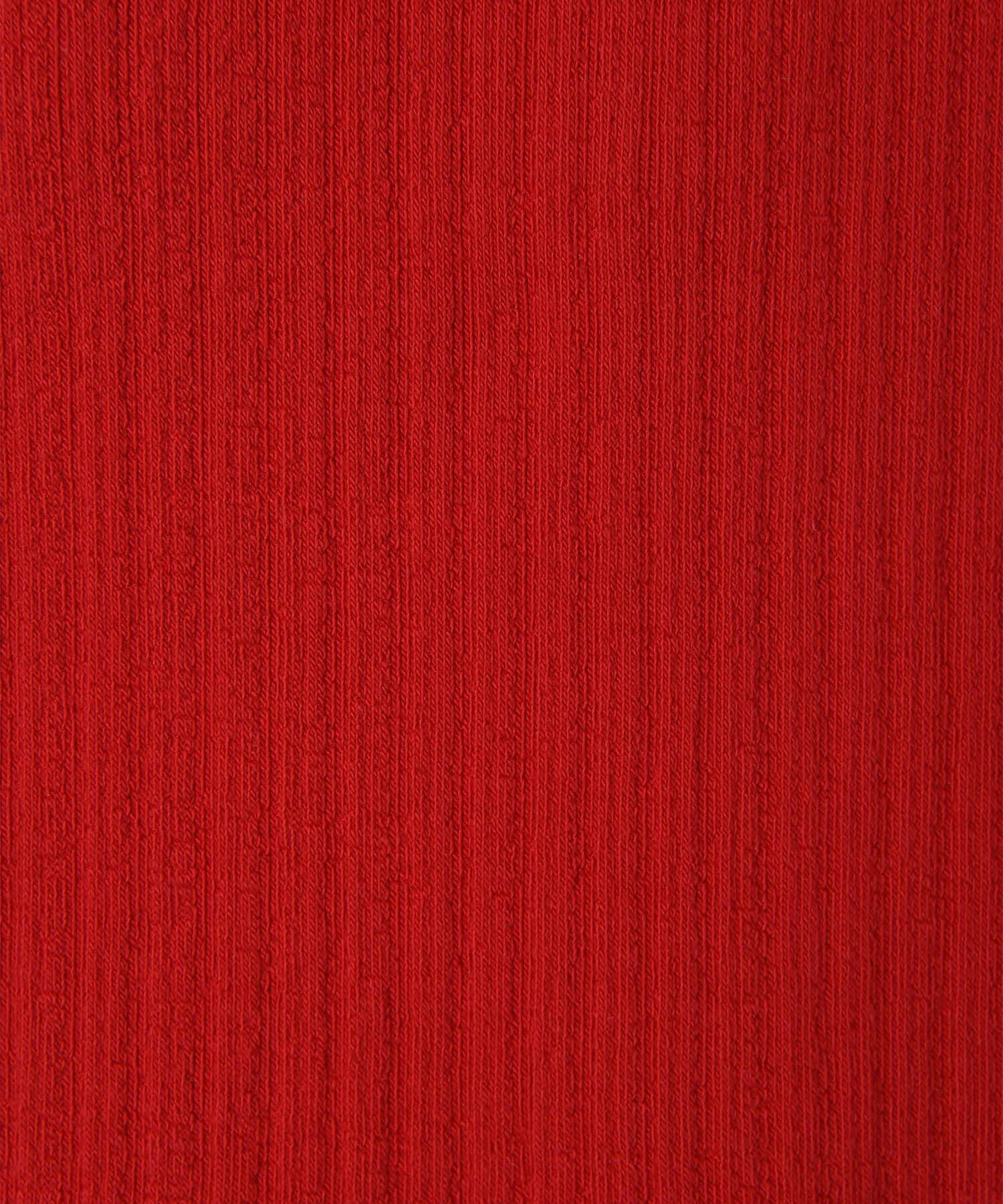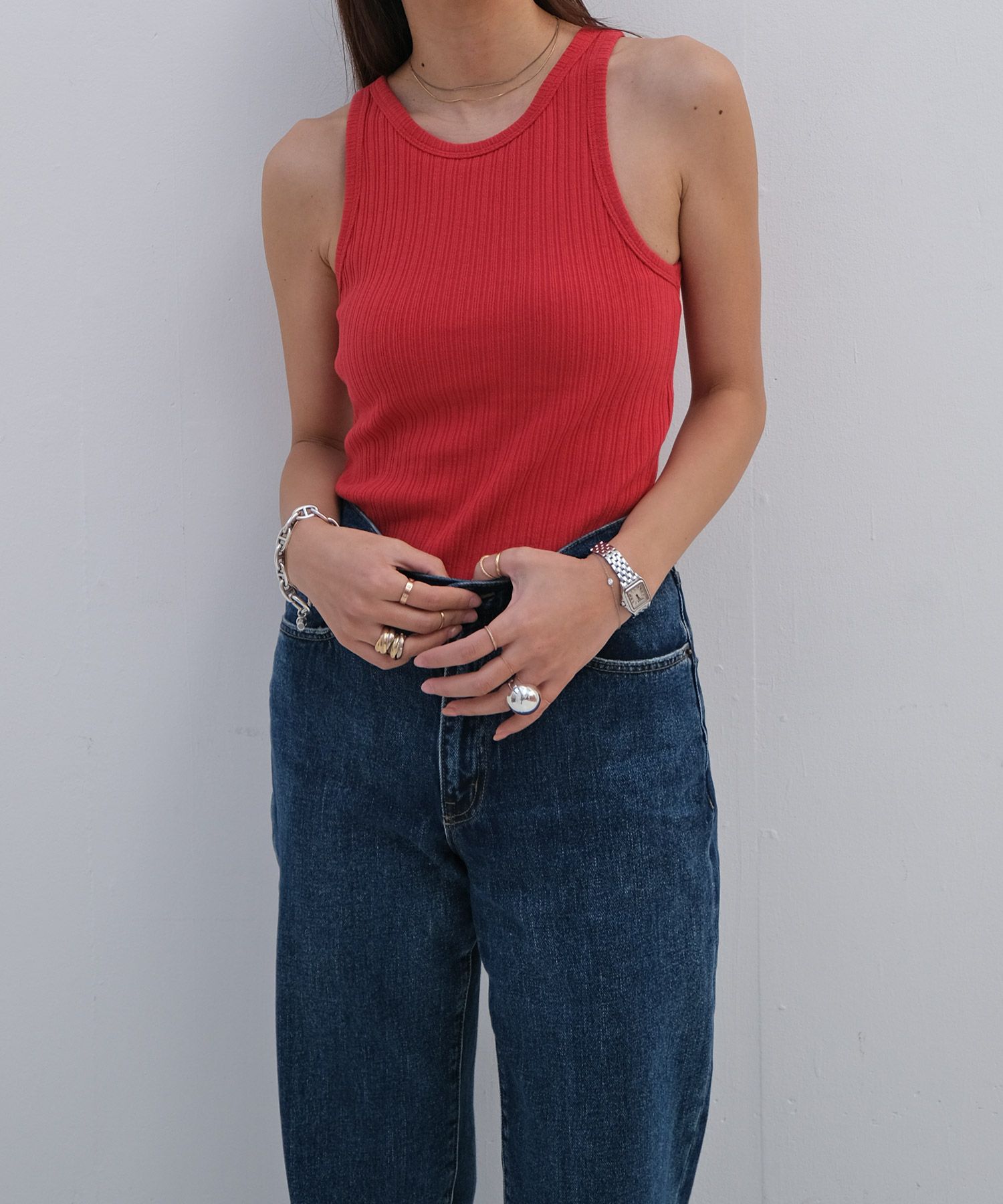 伸縮性に富んだリブ素材を使用し、ボディにソフトフィットすることで、すっきりとしたシルエットが女性らしくヘルシーな印象に。