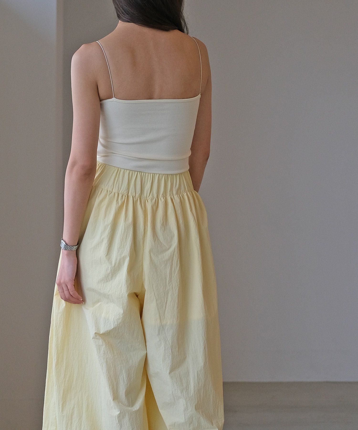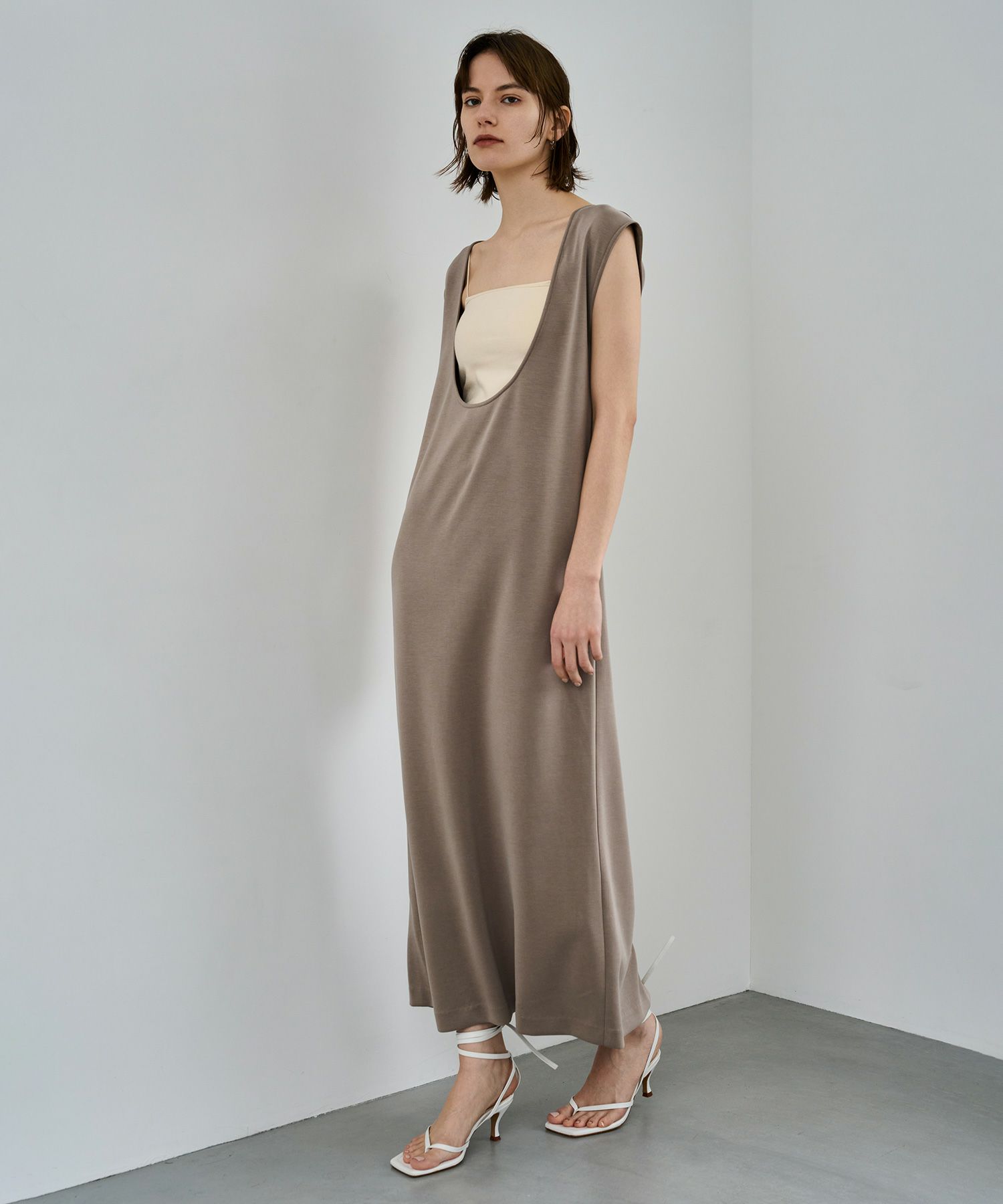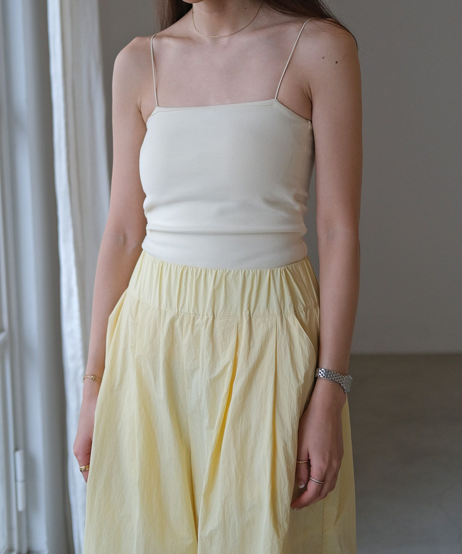 細めのストラップがデコルテや肩周りを華奢に見せ、女性らしさを感じる一枚。