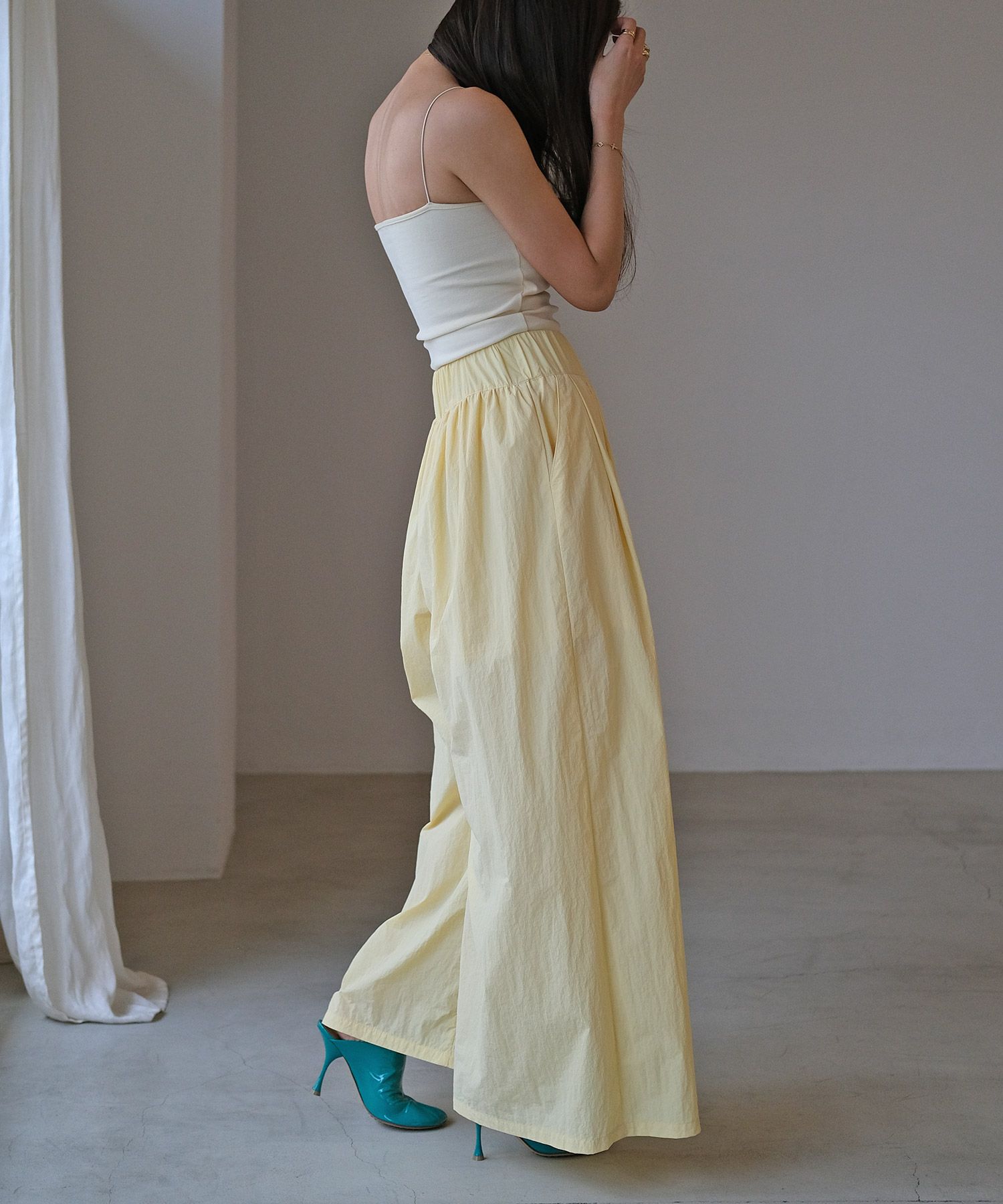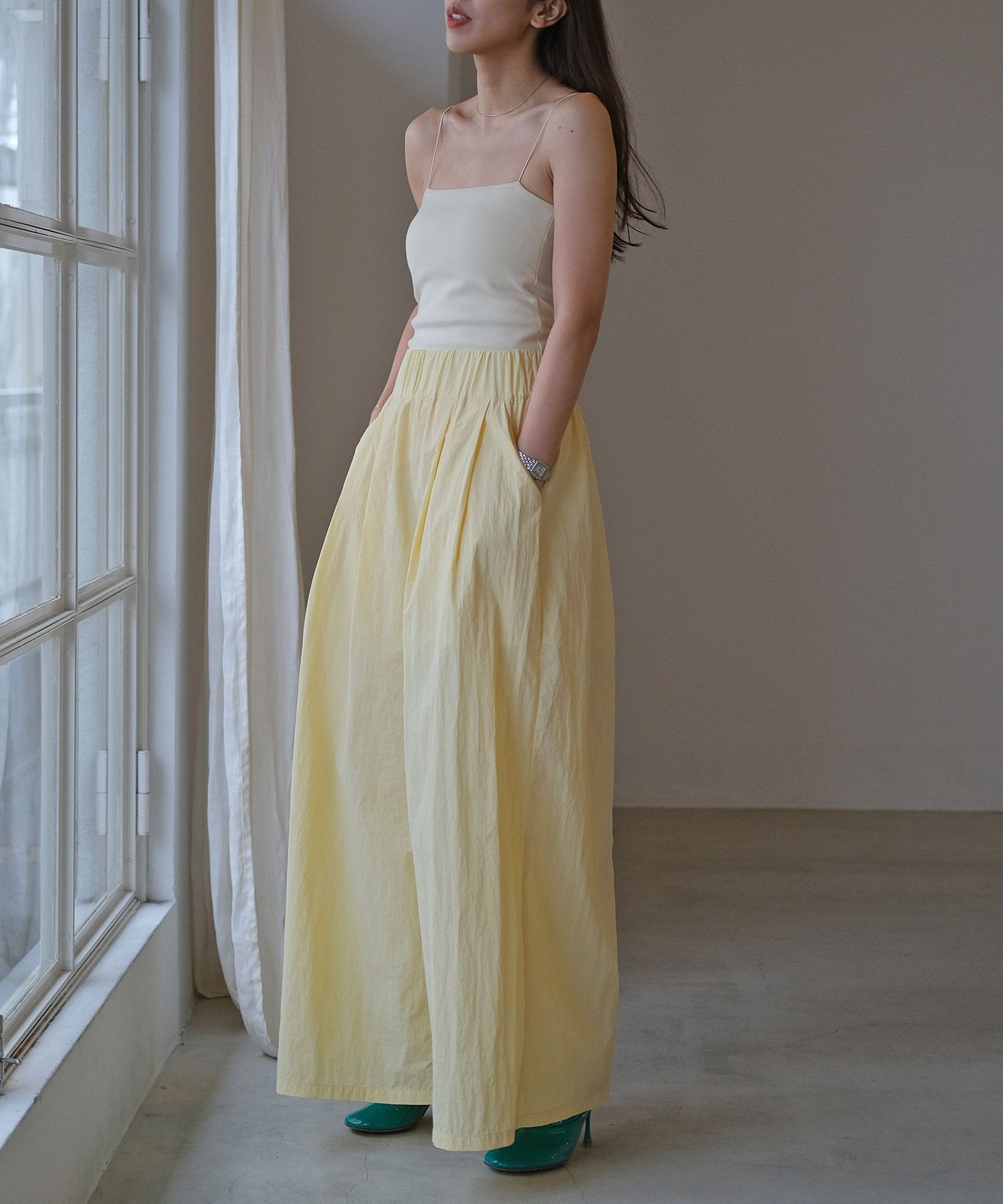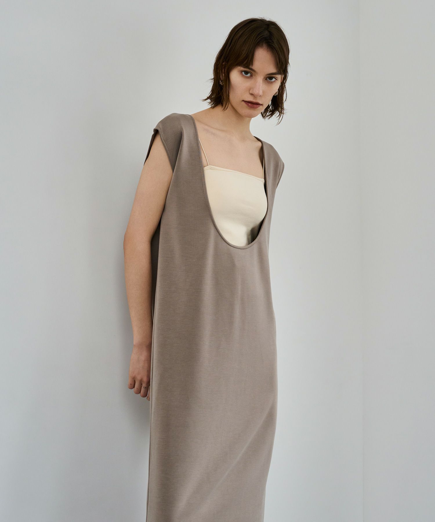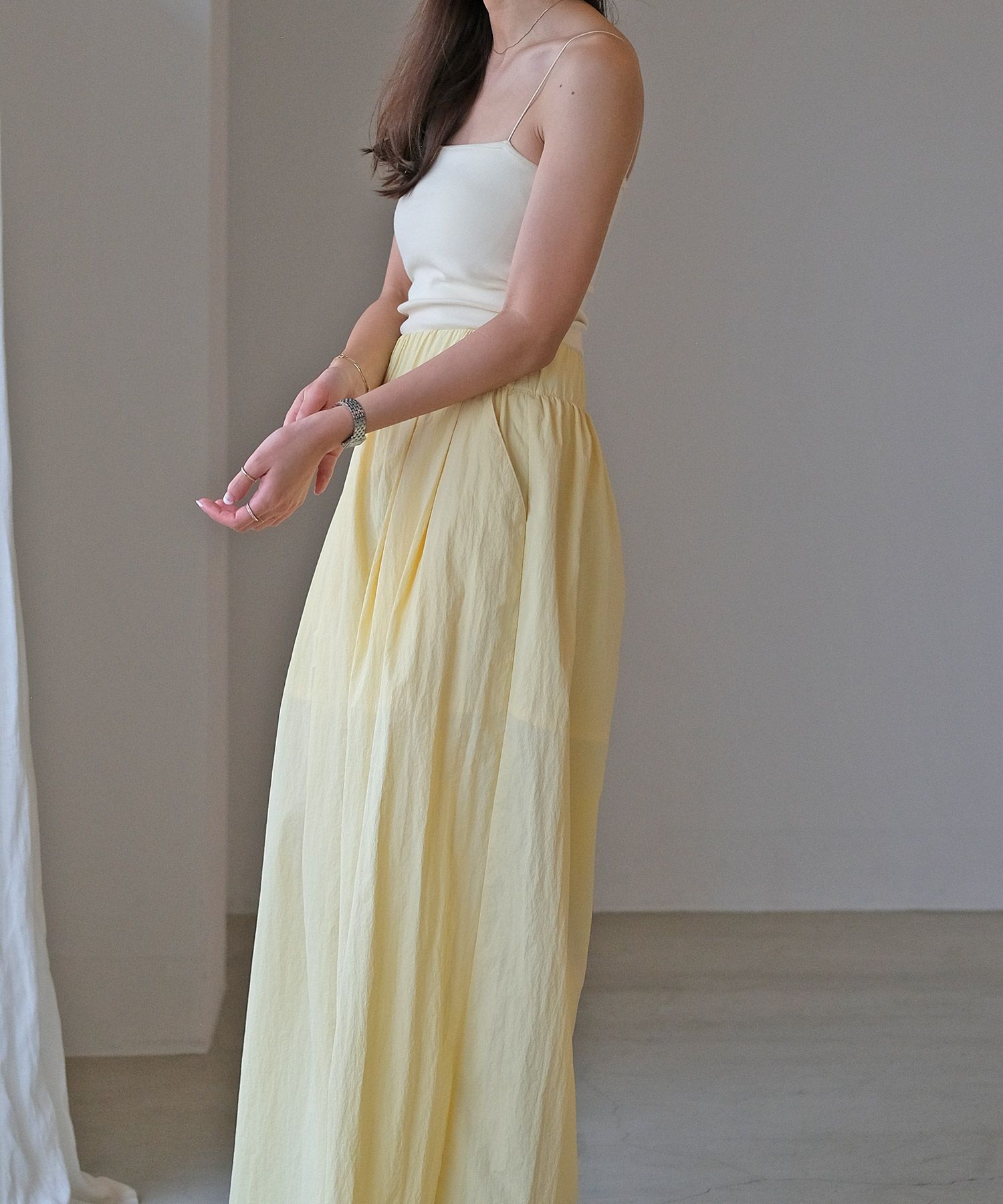 細めのストラップがデコルテや肩周りを華奢に見せ、女性らしさを感じる一枚。