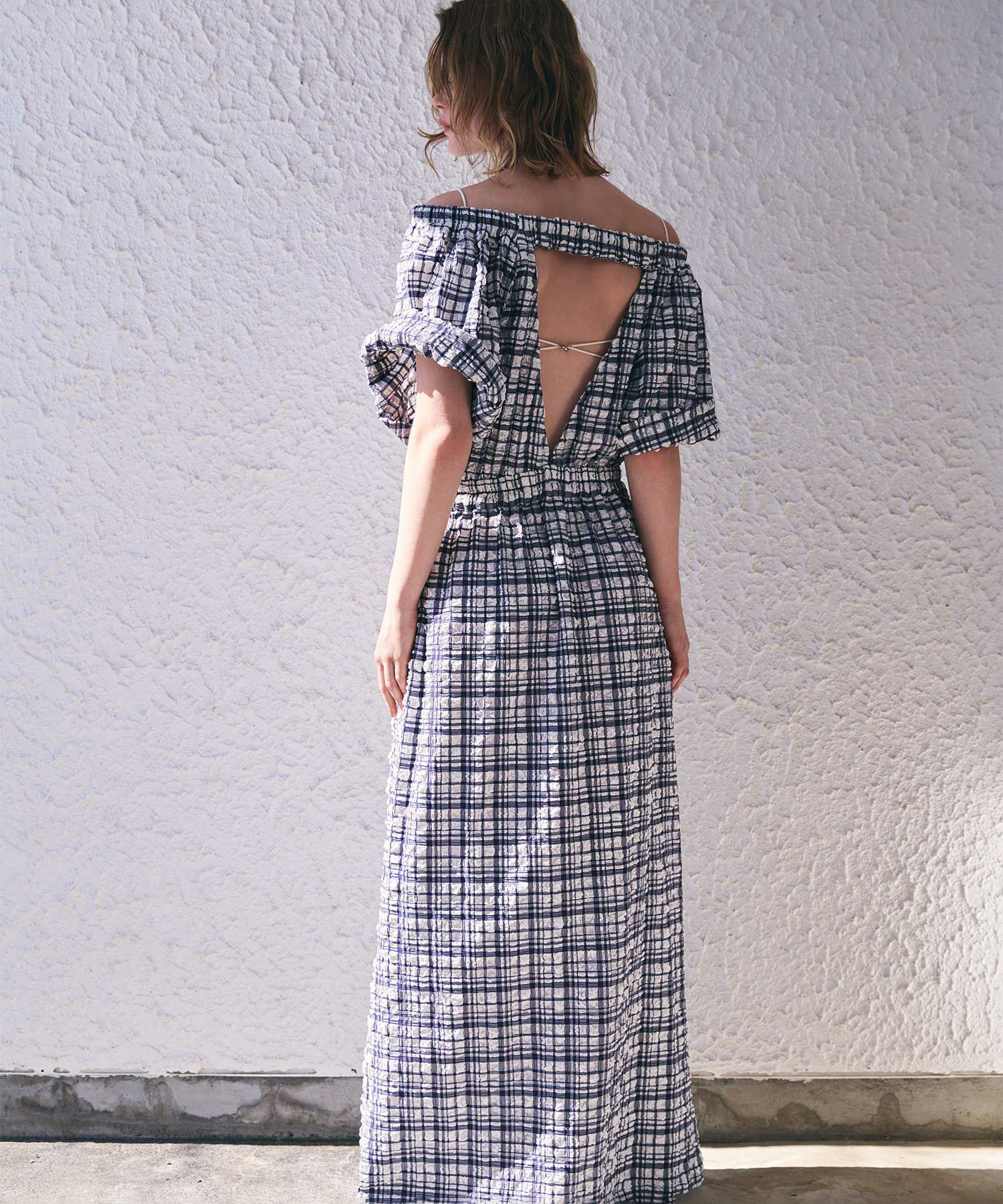 フロントのベアシルエットとは対照的に、華奢なストラップにメタルパーツが映えるバックスタイルです。