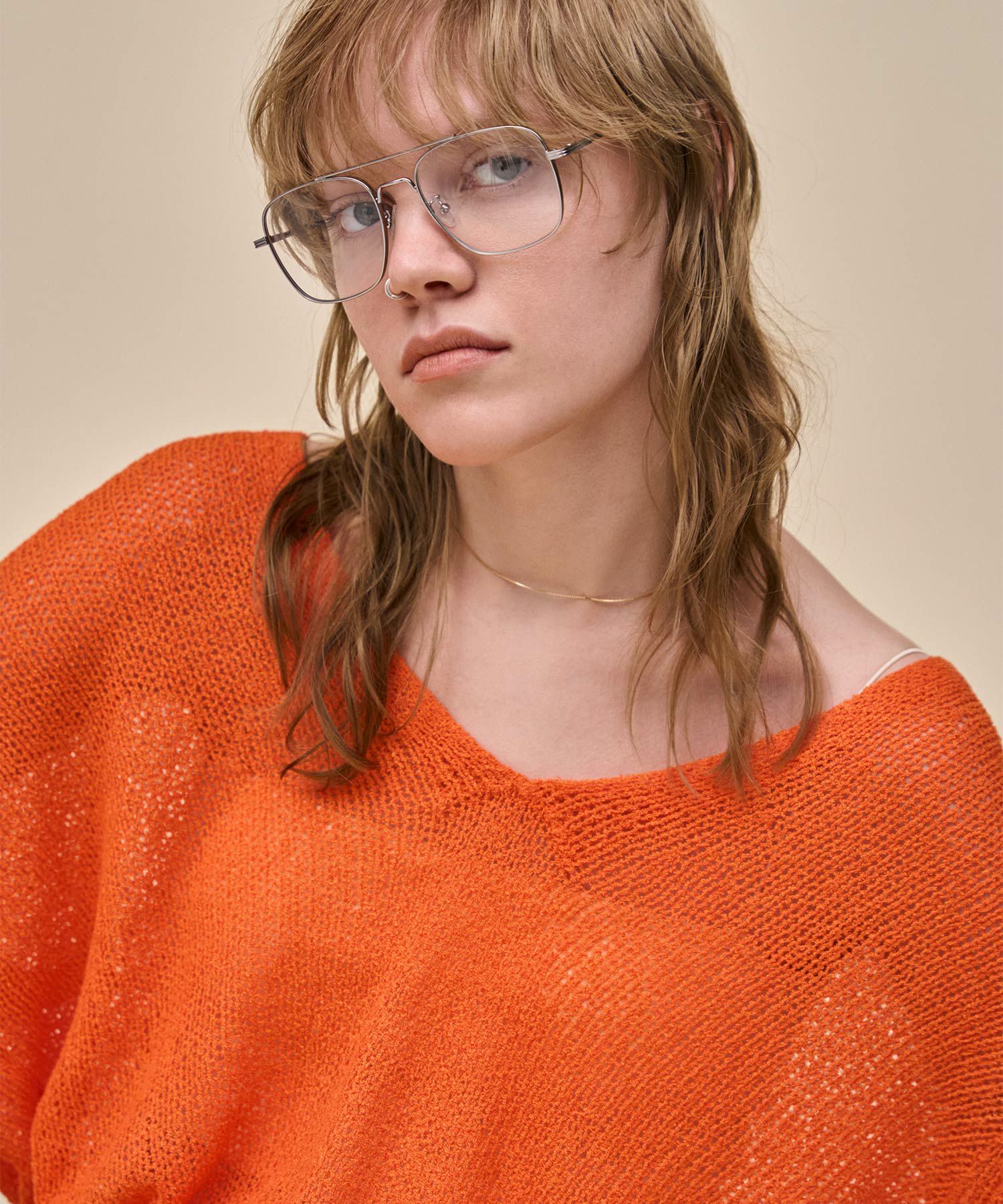 スタイルにこなれ感を与えてくれるクラシカルなダブルブリッジフレームのメガネ。