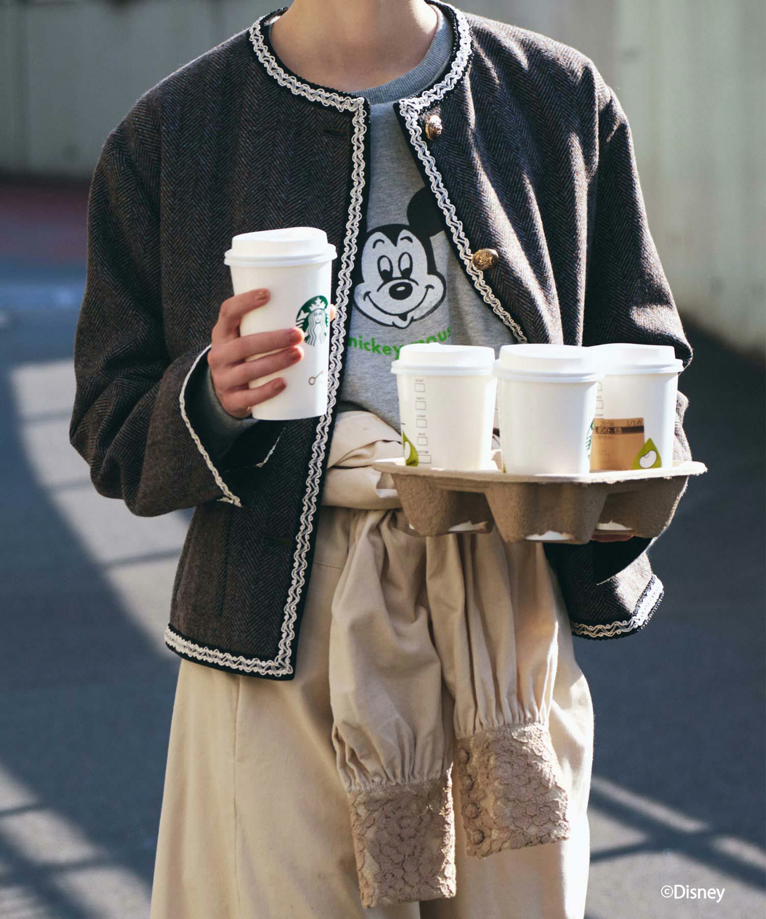 襟元と袖口に繊細なレースをあしらい、女性らしいアクセントをプラス。