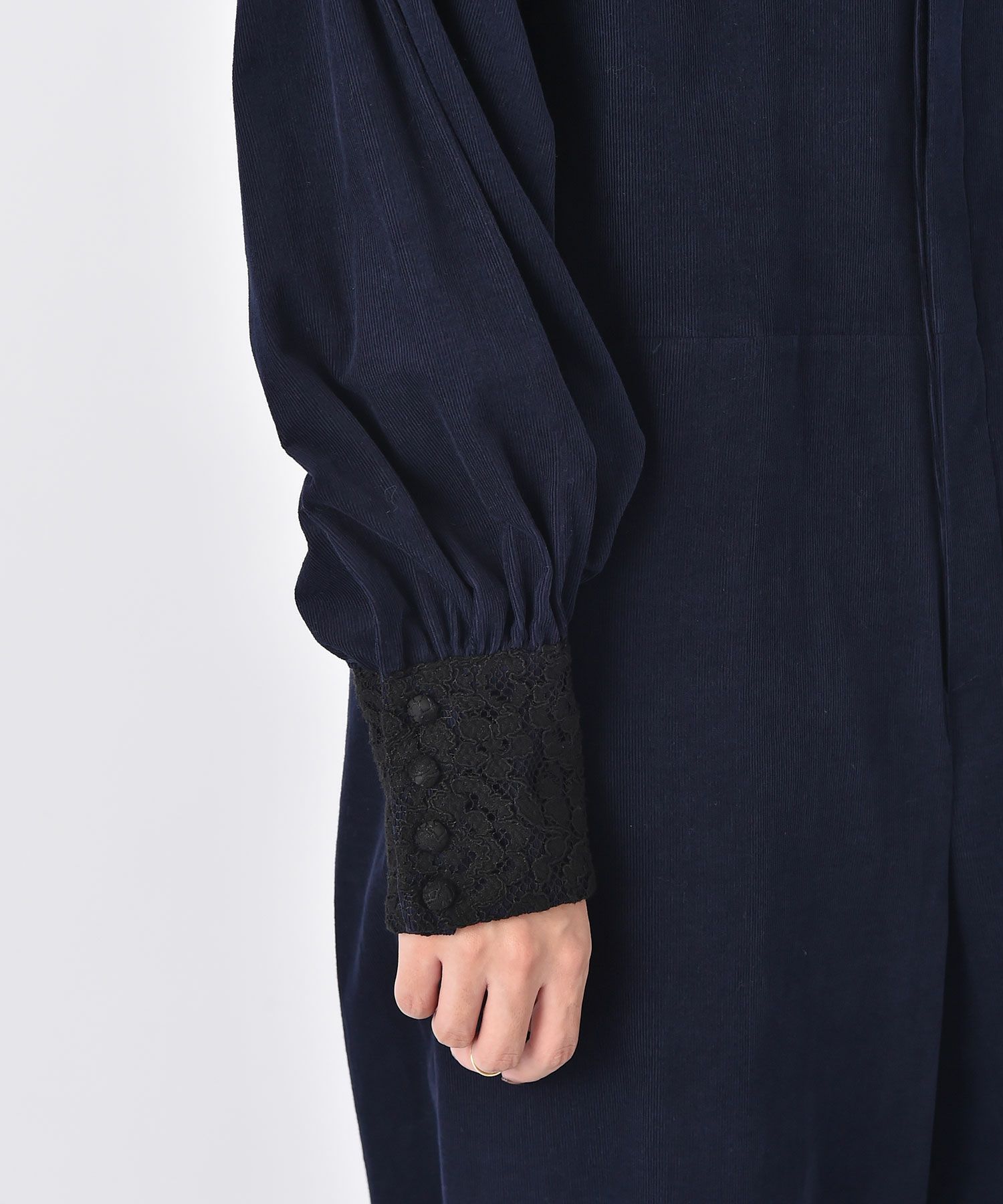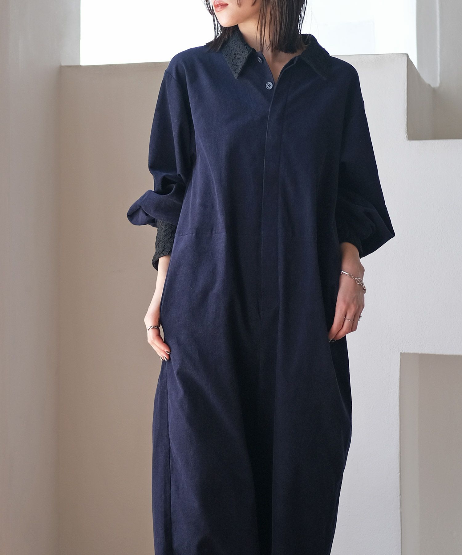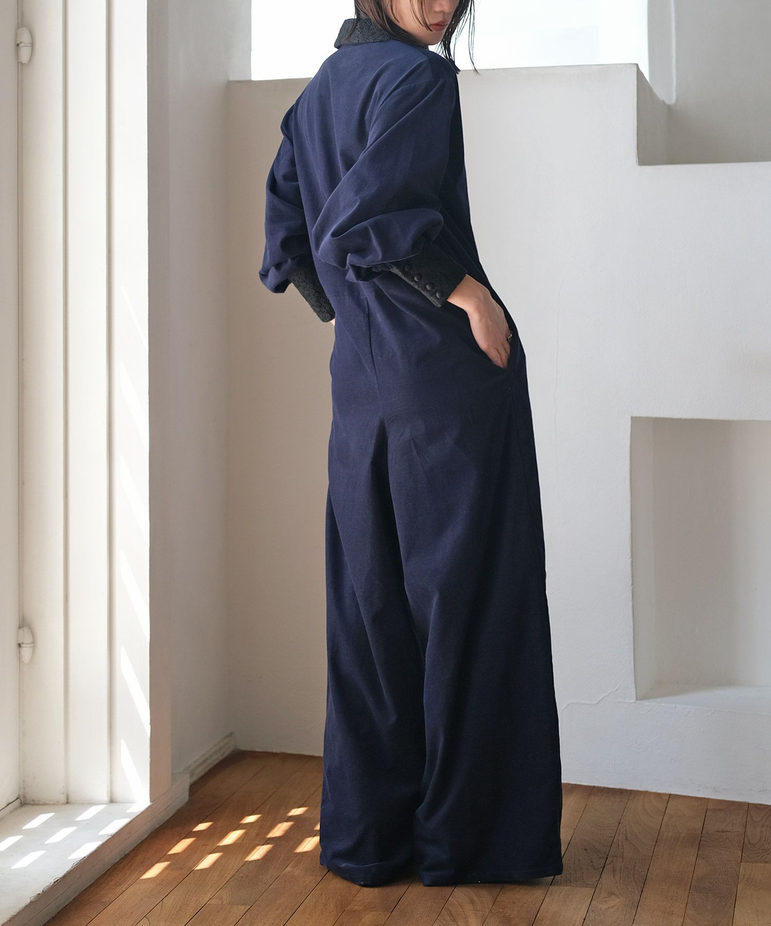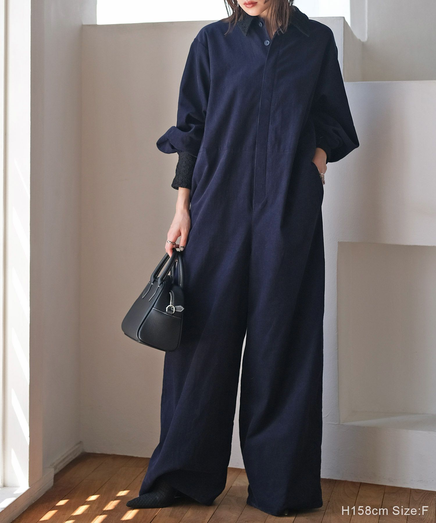 細畝の柔らかいコーデュロイ素材で仕立てたジャンプスーツ。