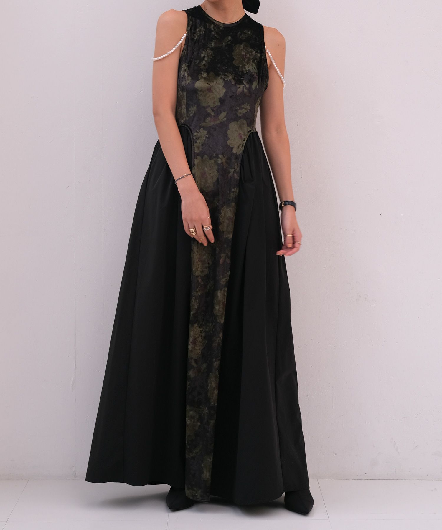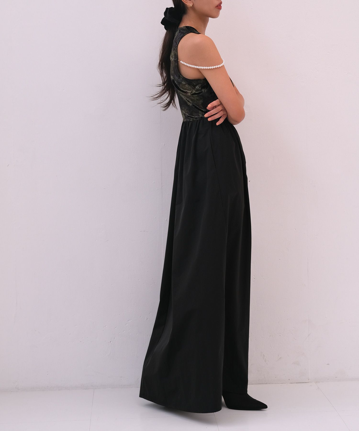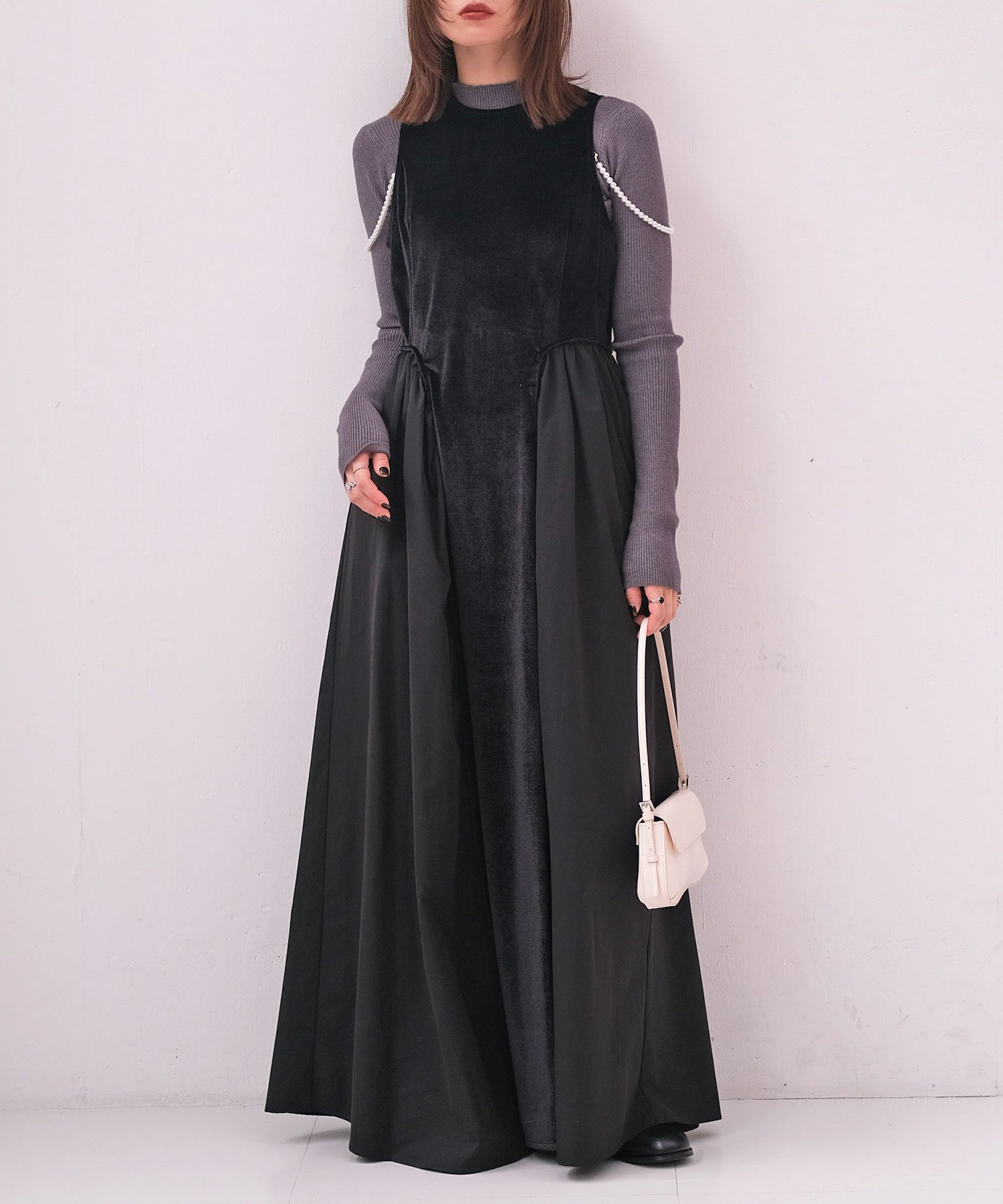 パールストラップと異素材の組み合わせが特別感のあるマキシワンピース。