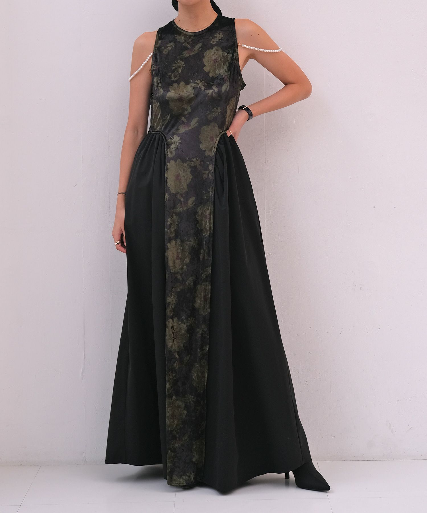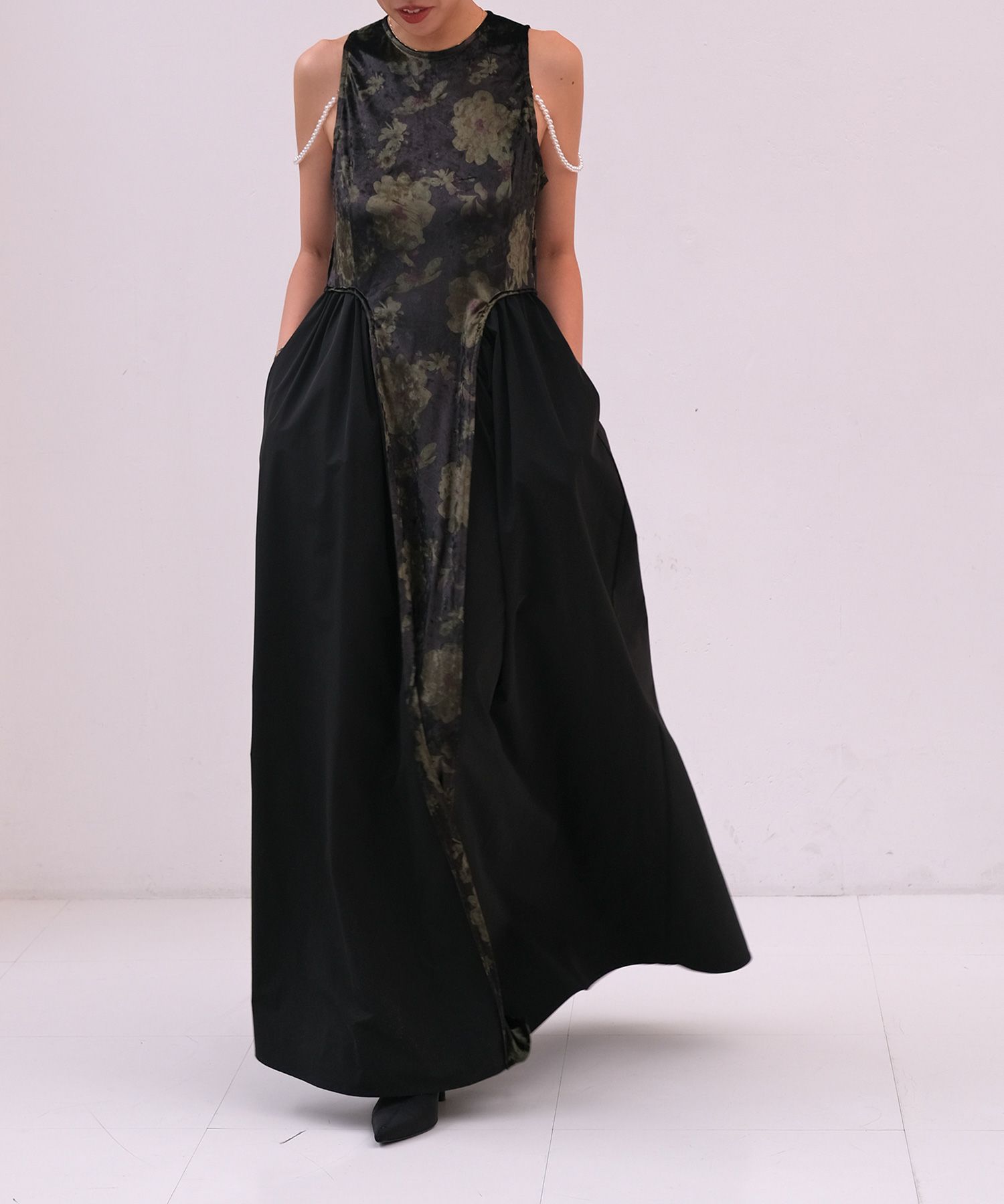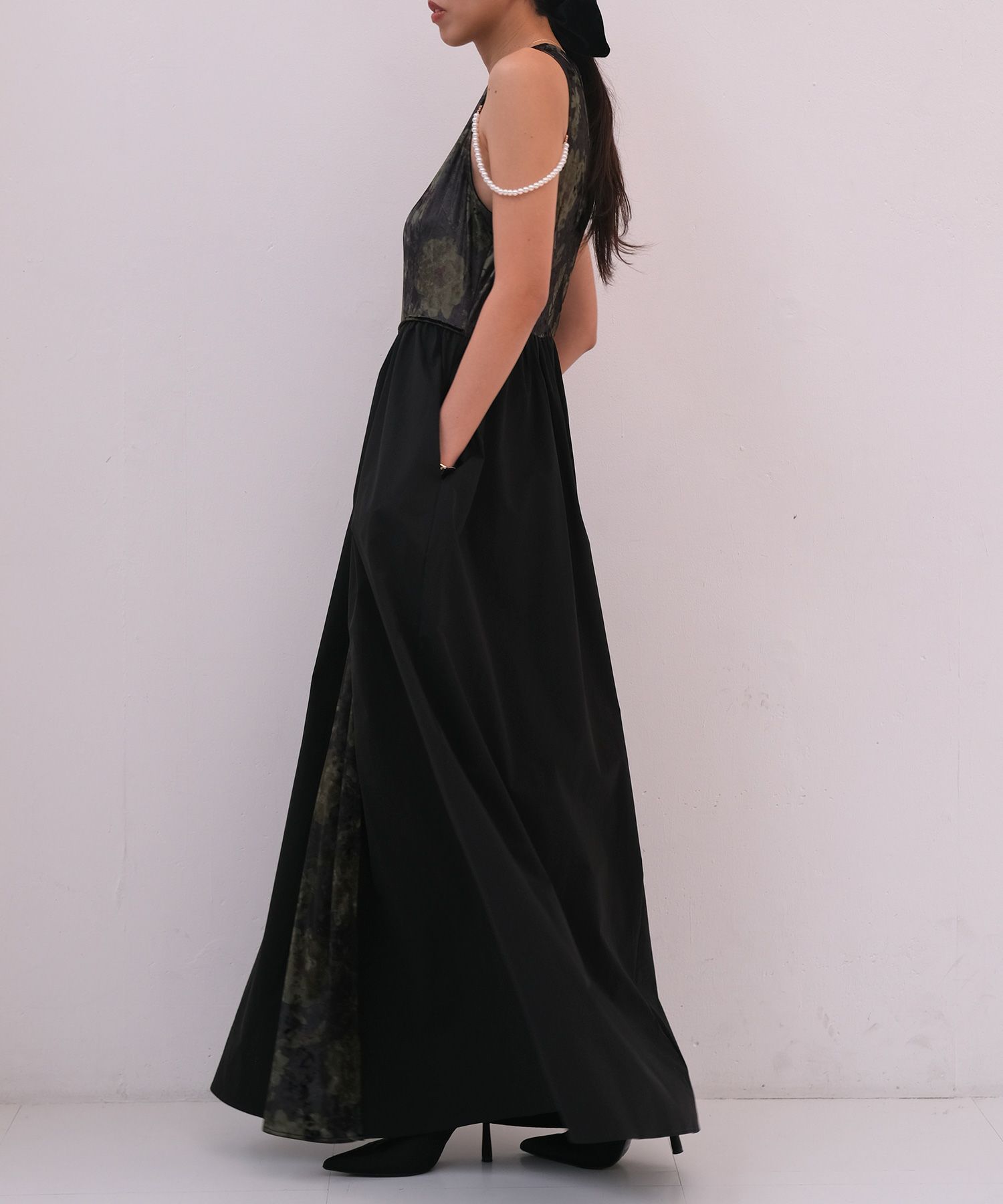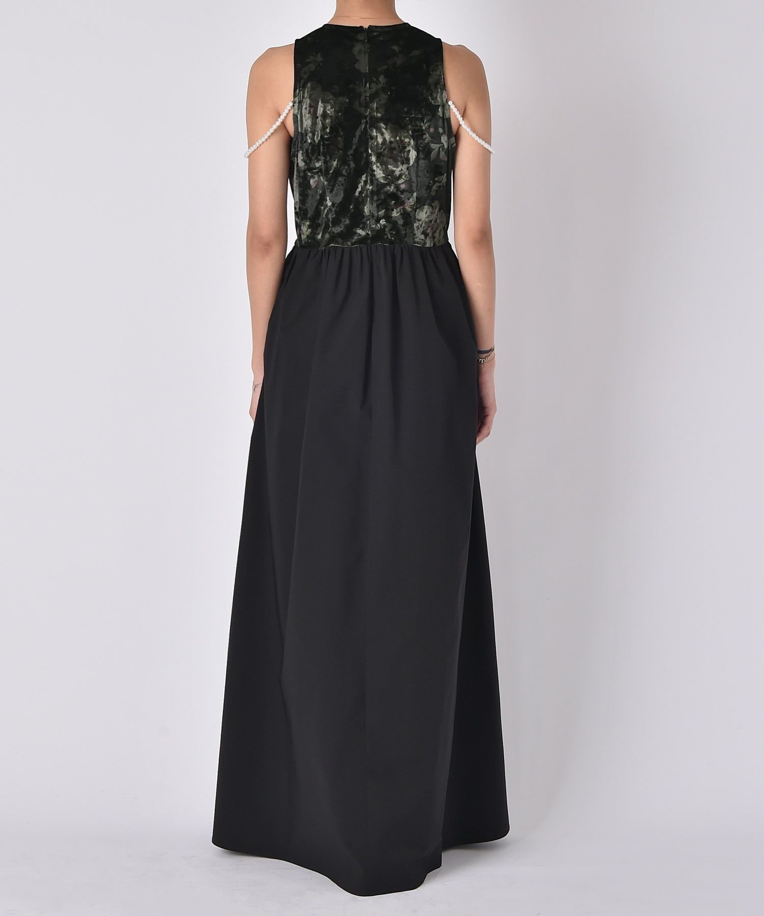 パールストラップと異素材の組み合わせが特別感のあるマキシワンピース。