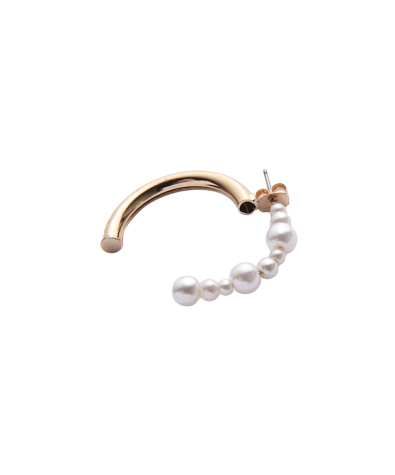 艶やかなゴールドのハーフフープとサイズが異なるパールがコンビになったピアス。
