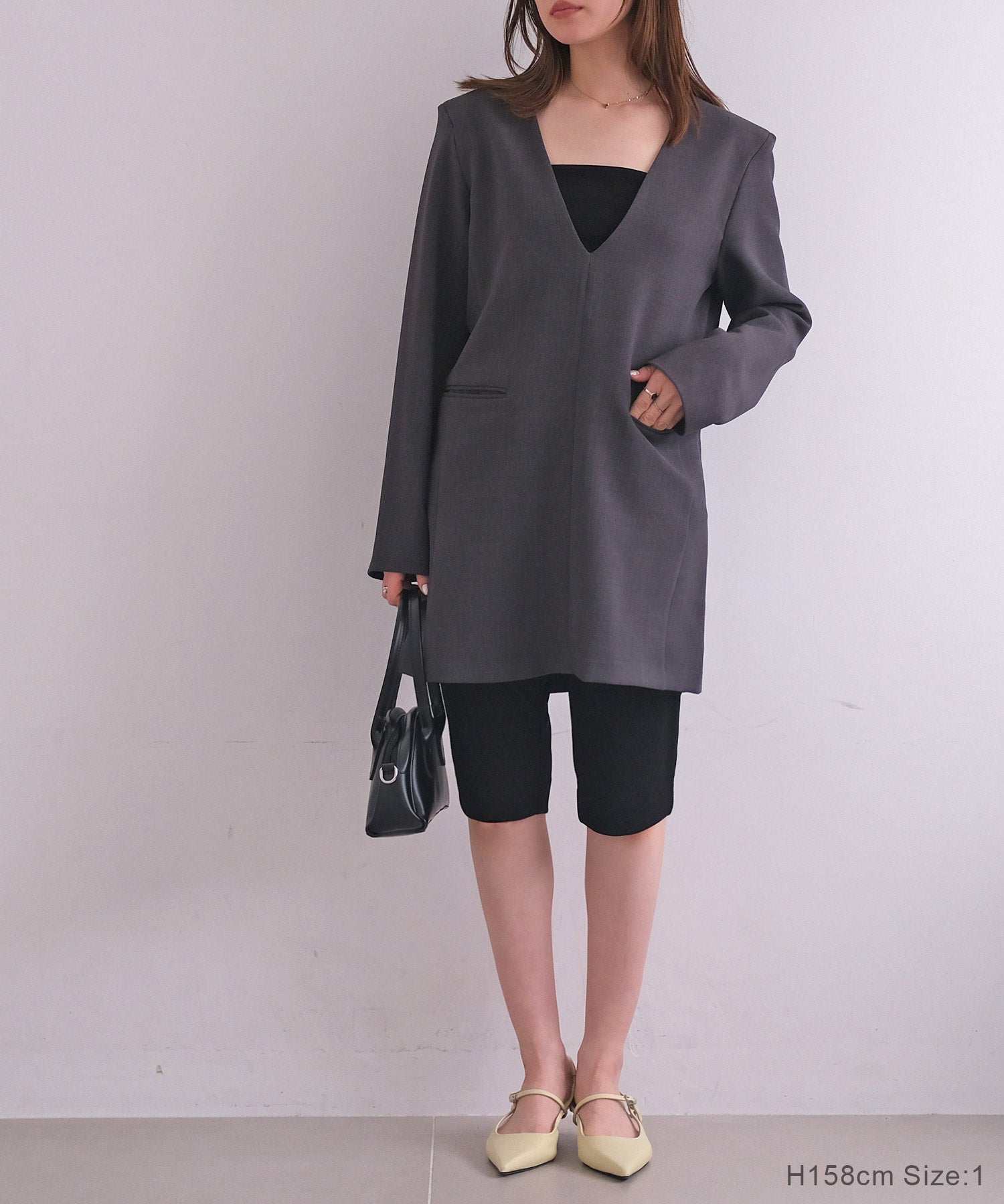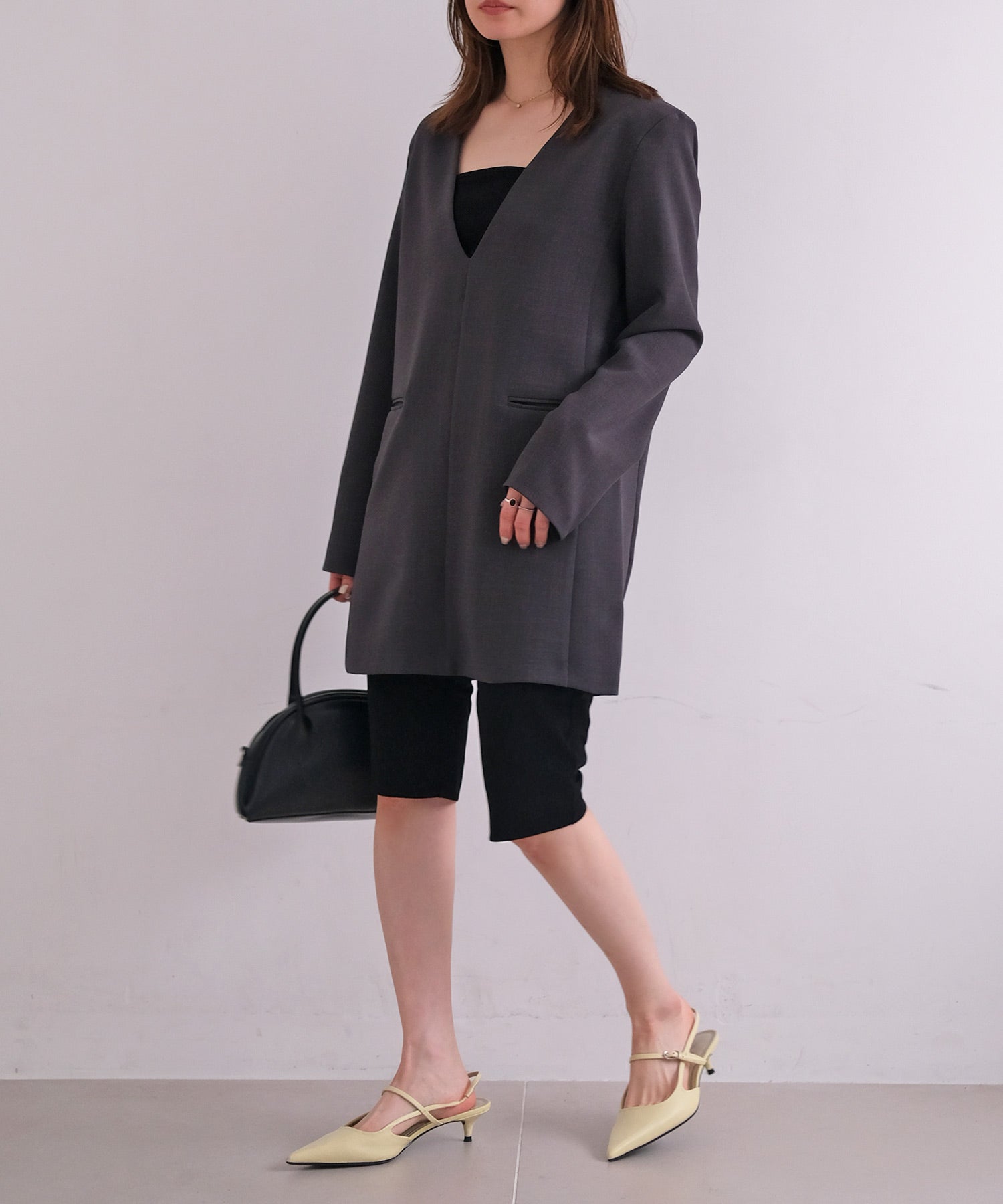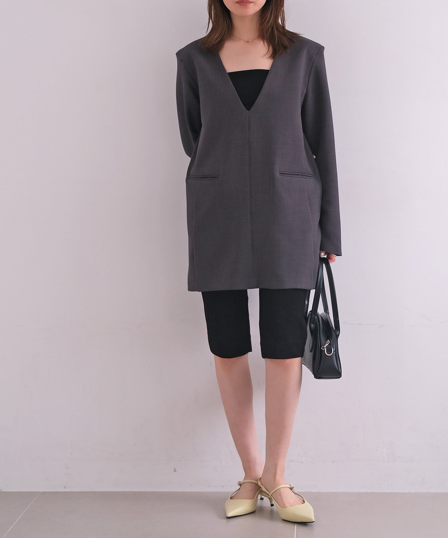 深めのVネックデザインがすっきりと見せながら、合わせるインナーで表情を変えられるのも魅力の一つ。