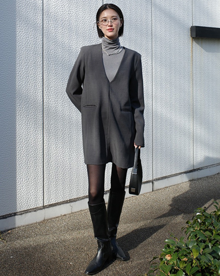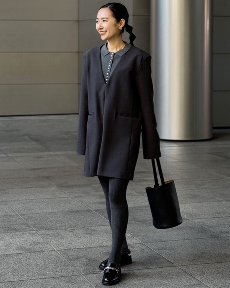 肩のラインを直線的に見せる仕様を用い、モード感漂うシャープな印象に仕上げています。