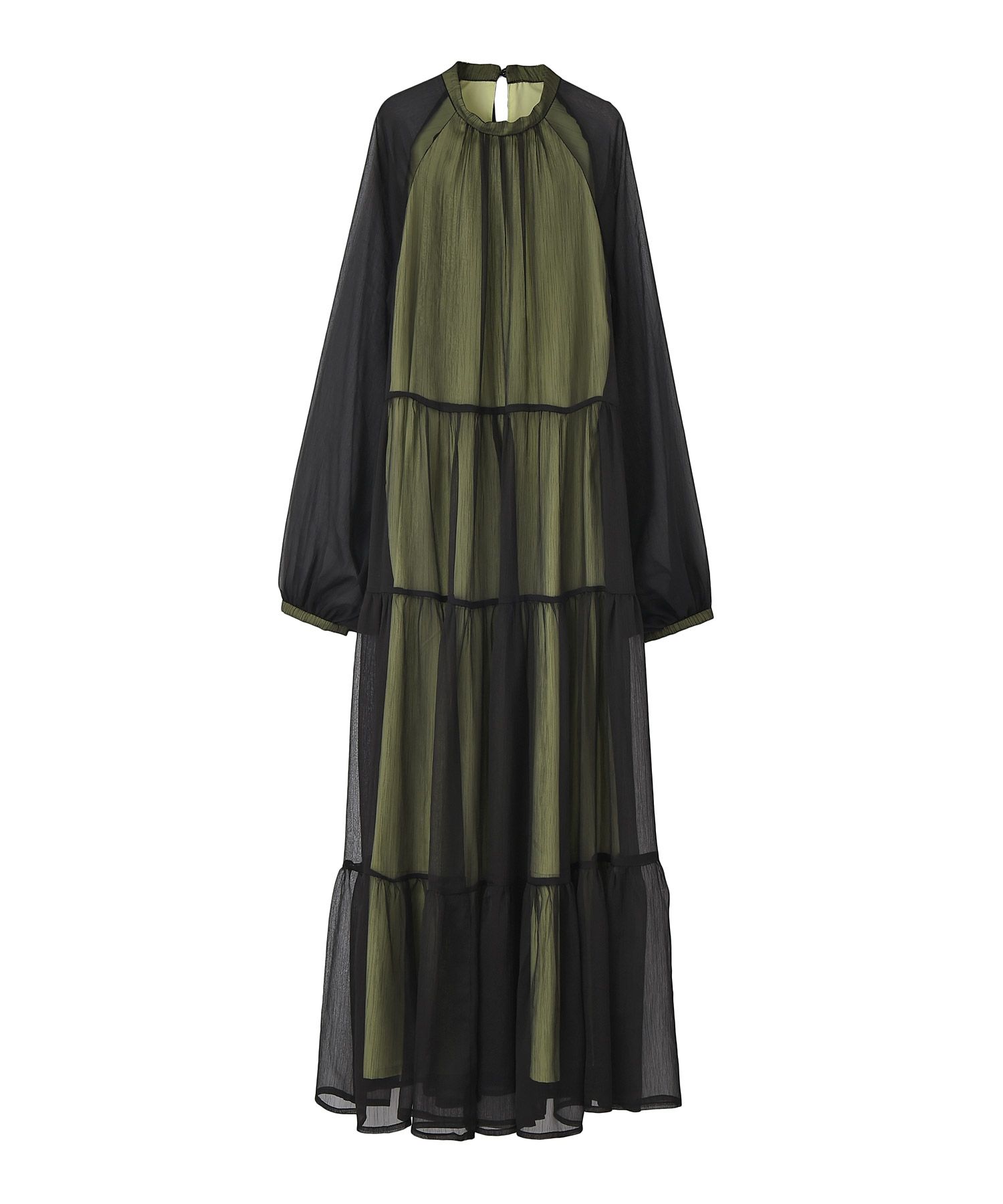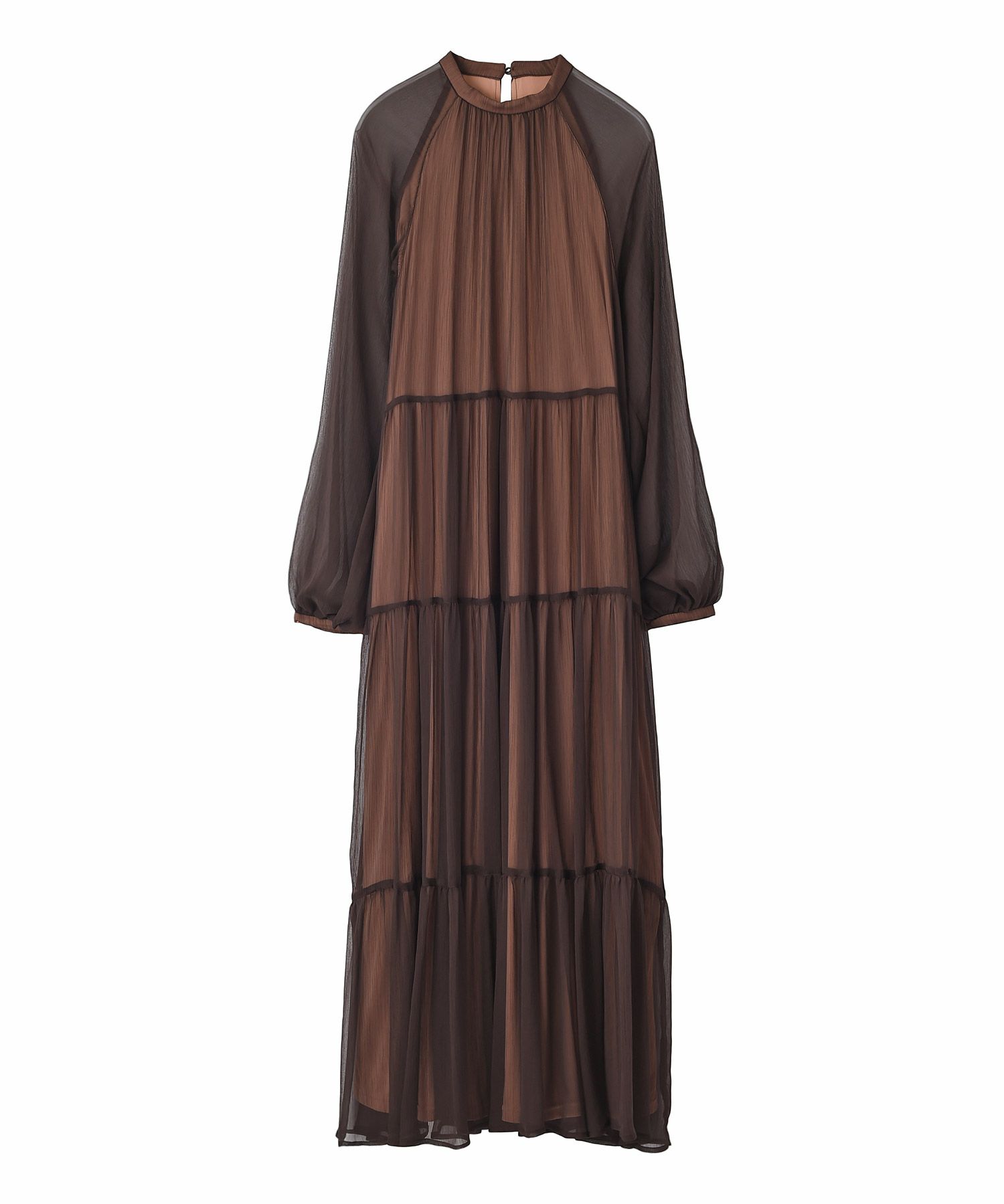 高いウエスト位置からの切り替えデザインがスタイルアップ効果もあり、透け感とハイネックデザインがエレガントかつフェミニンな印象を与えてくれます。
