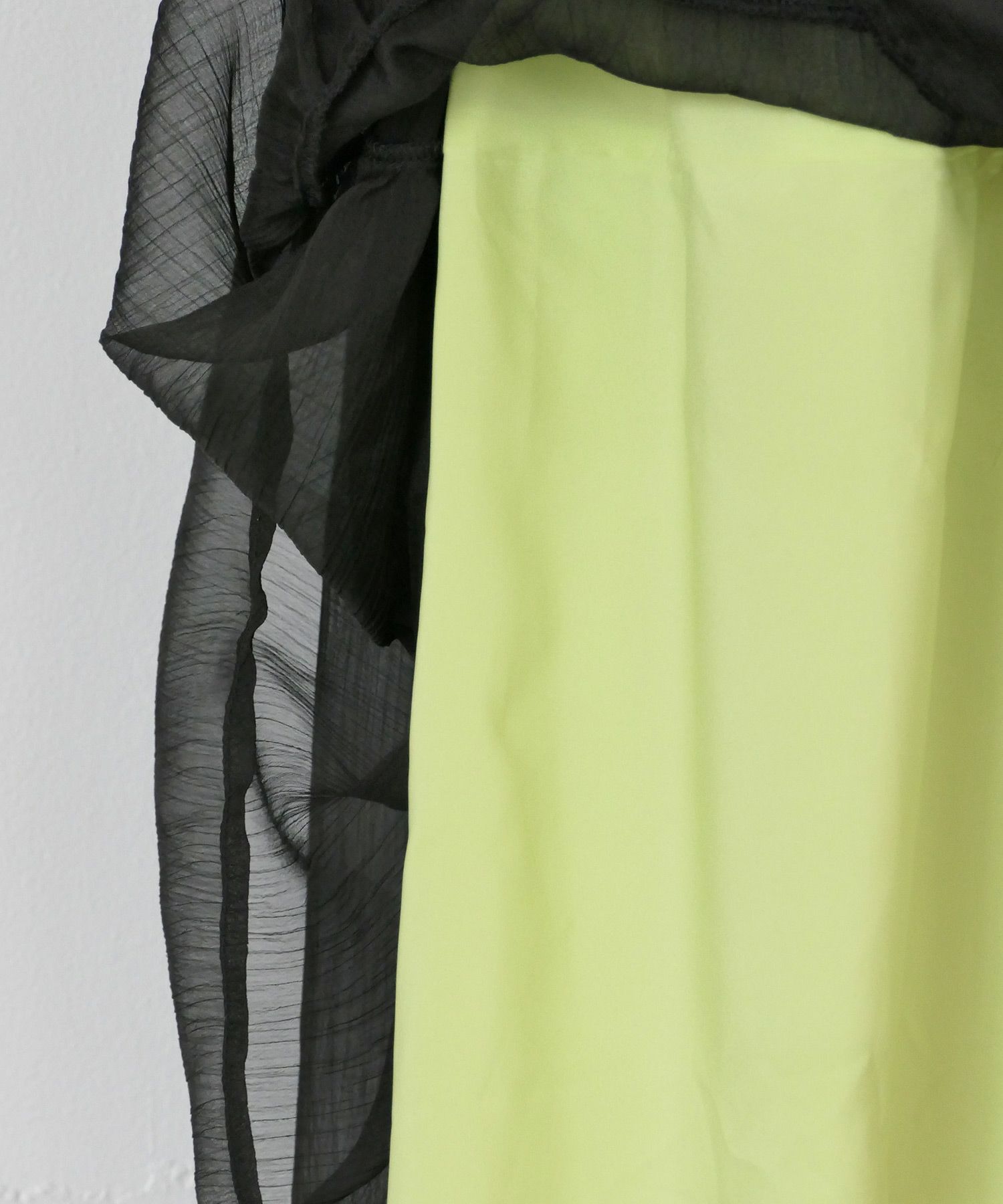 軽やかなシフォン素材と配色の裏地が目を引く、デザイン性のあるワンピース。