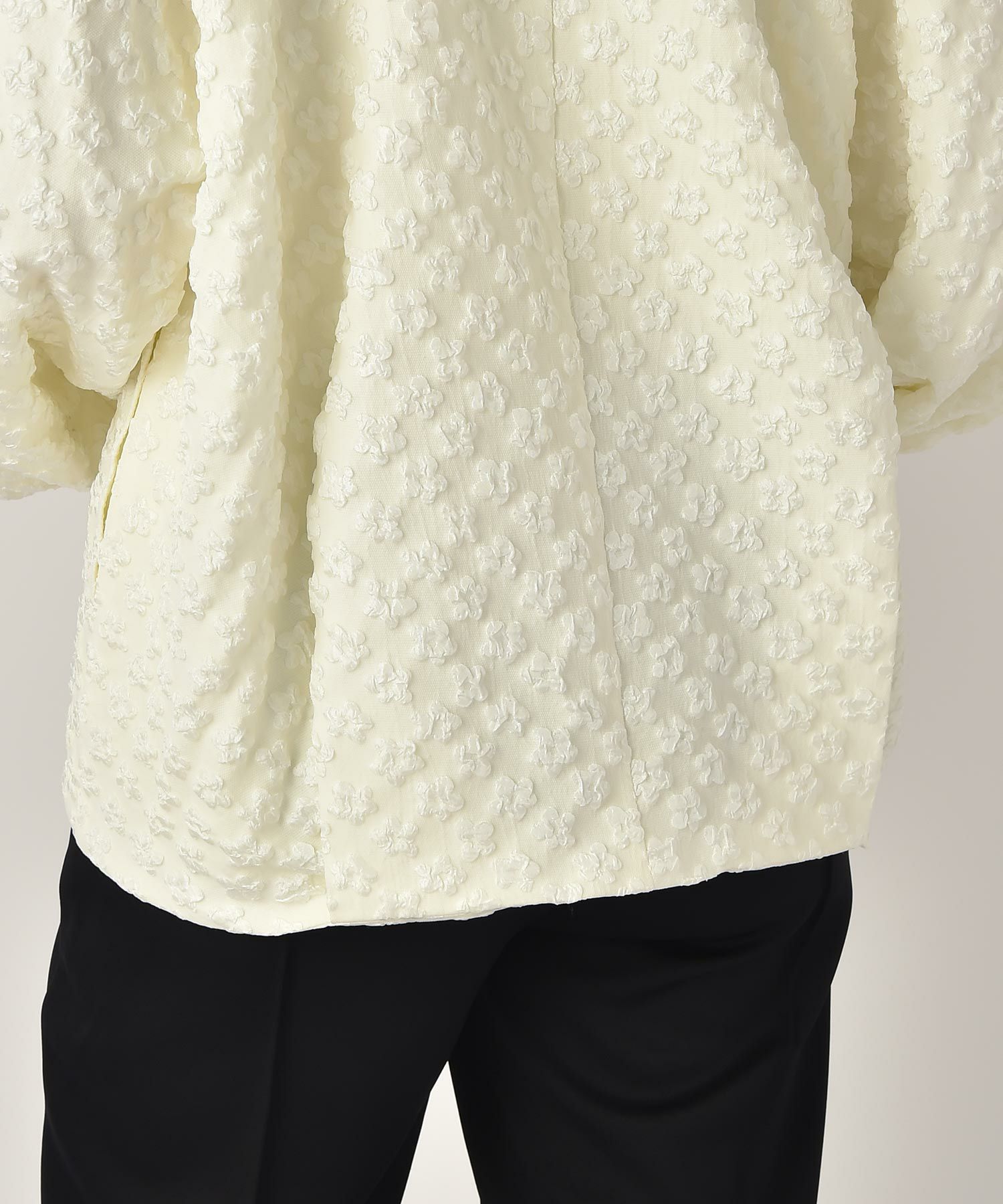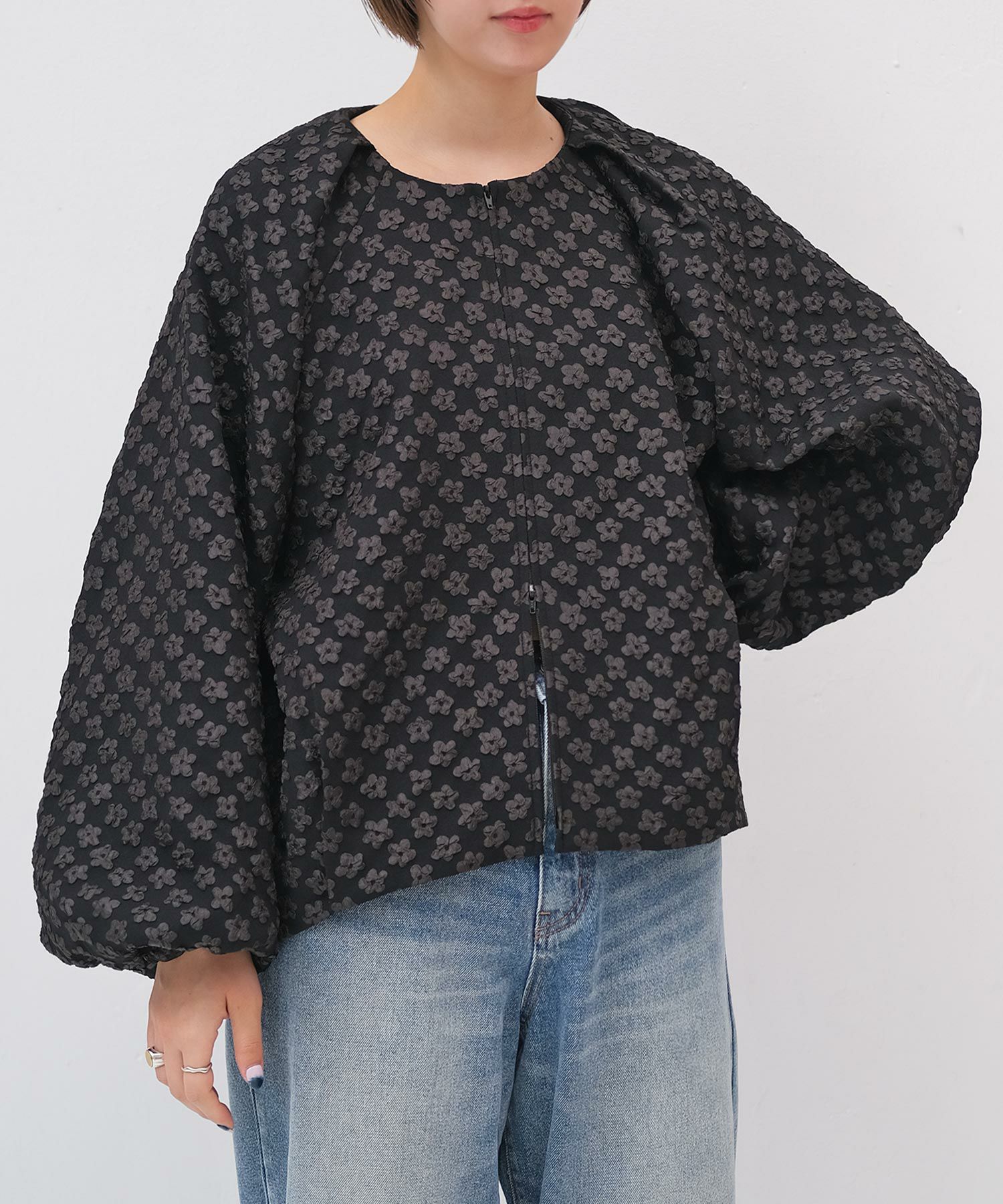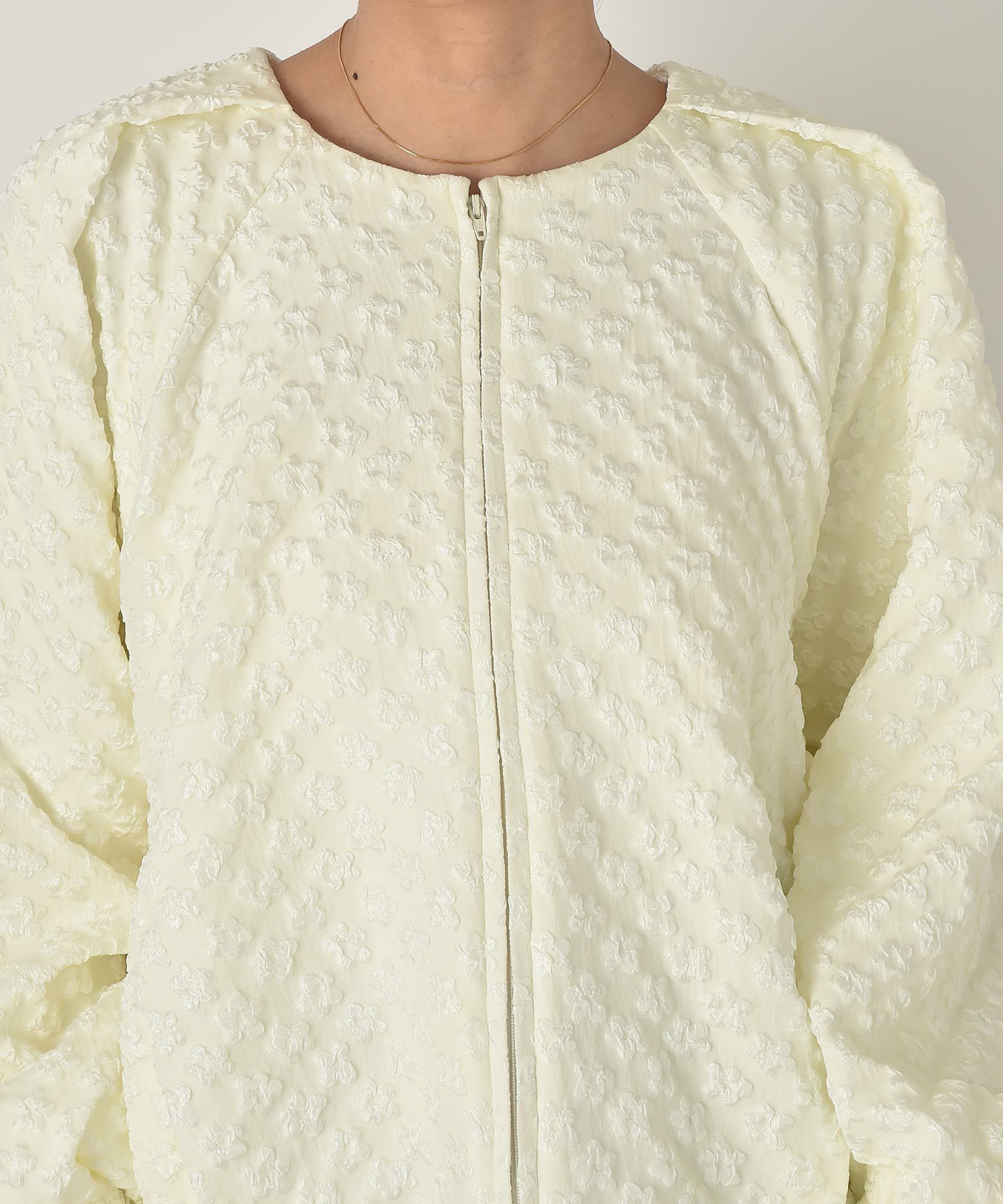 カジュアルになりがちなブルゾンをふっくらとしたフラワージャガード生地で上品顔に仕上げた一枚。