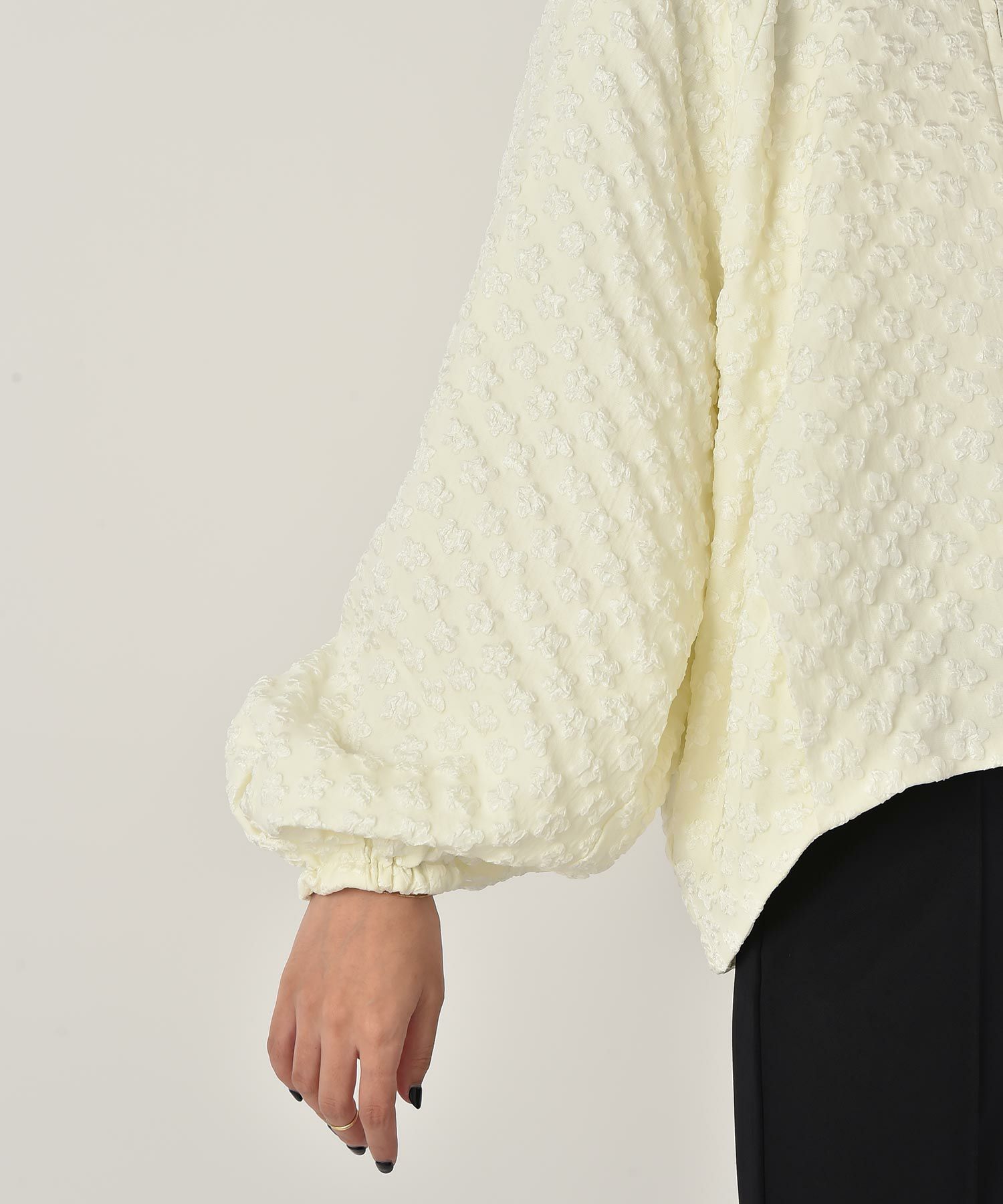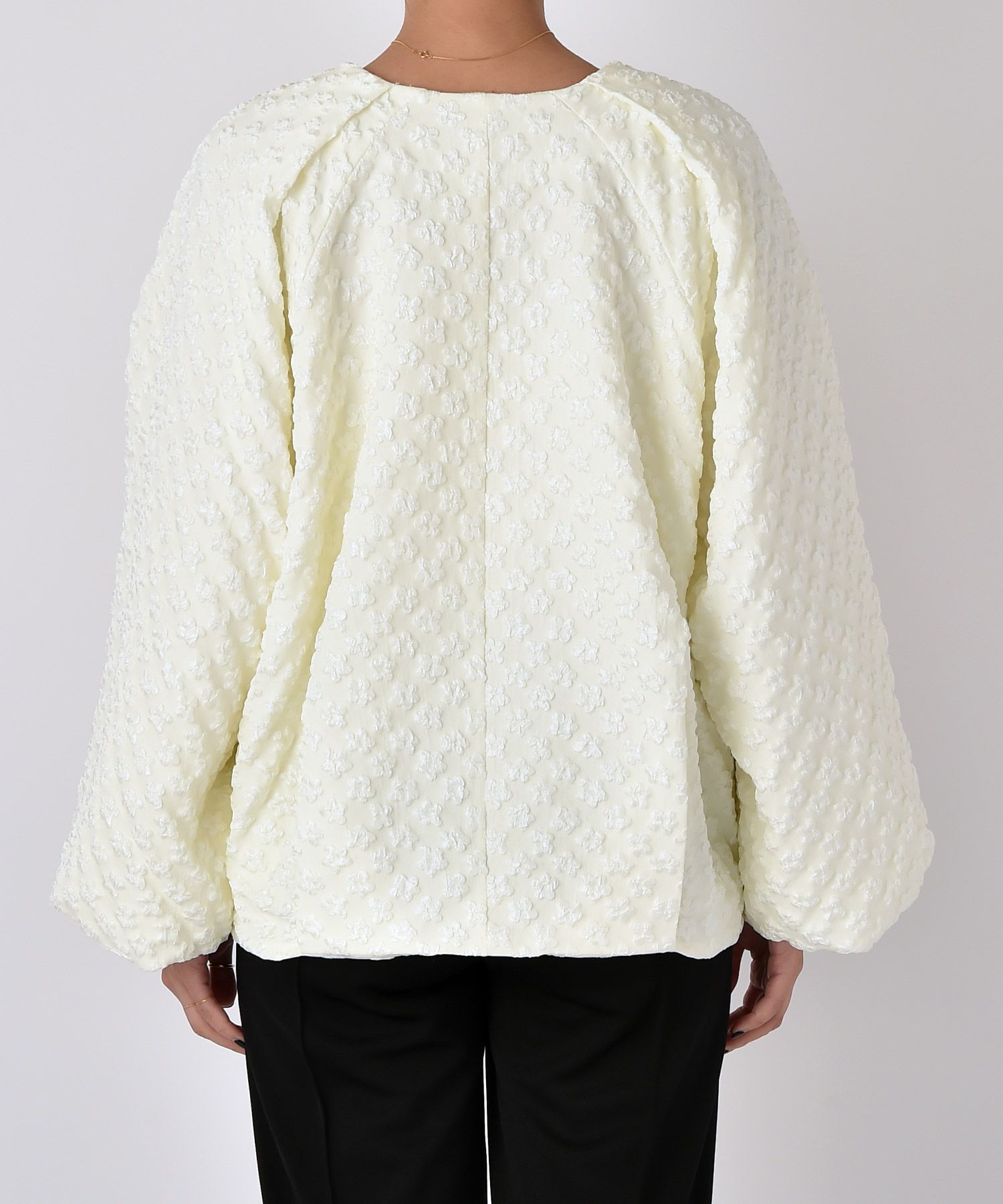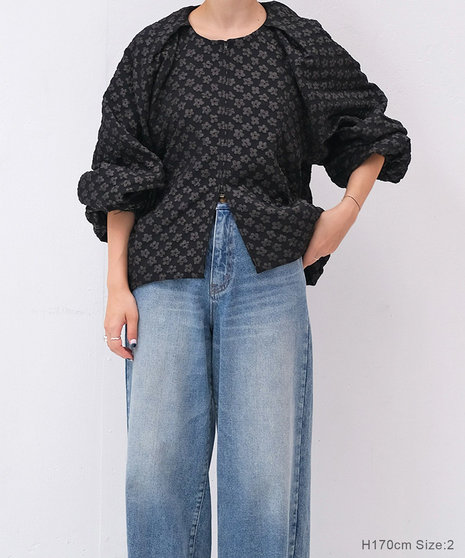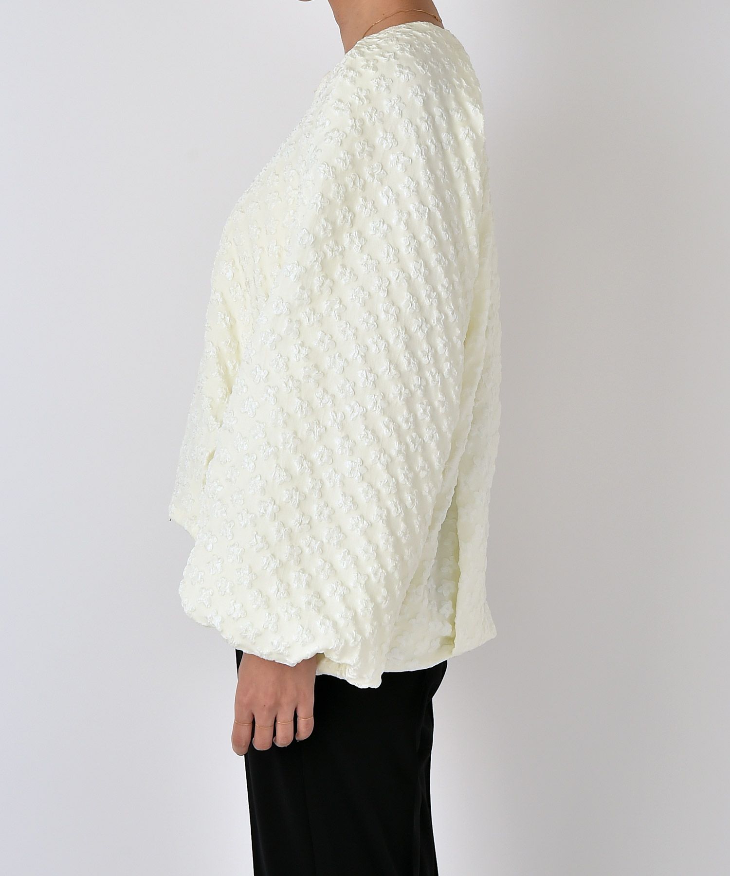 カジュアルになりがちなブルゾンをふっくらとしたフラワージャガード生地で上品顔に仕上げた一枚。